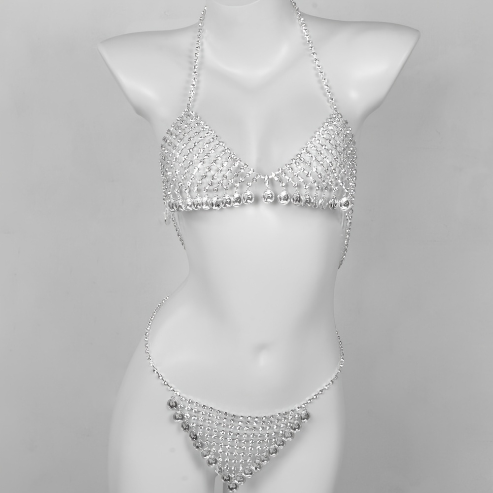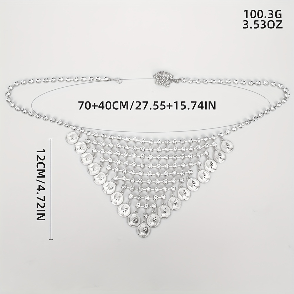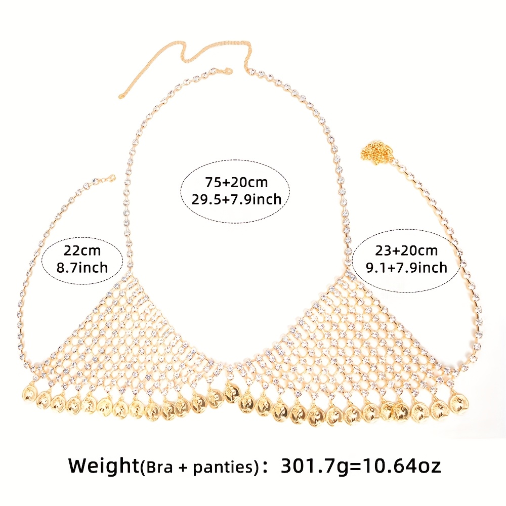 1 Set Bra + Panties Fashion Alloy Full Rhinestone Mesh Women's Bra Body Chain, Round Coin Tassel Pendant Body Chain Suitable for Parties, Music Festivals, Beach Body Accessories