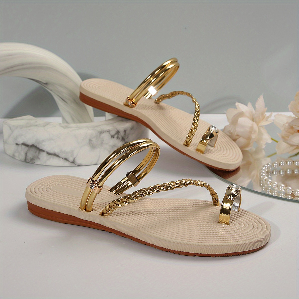 Chic Golden Metallic Chain Women’s Slide Sandals - Summer Fashion Flat Slippers with Open Toe Design, Comfortable & Breathable Casual Shoes, Rubber Sole & EVA Insole, Perfect for Parties & Casual Attire