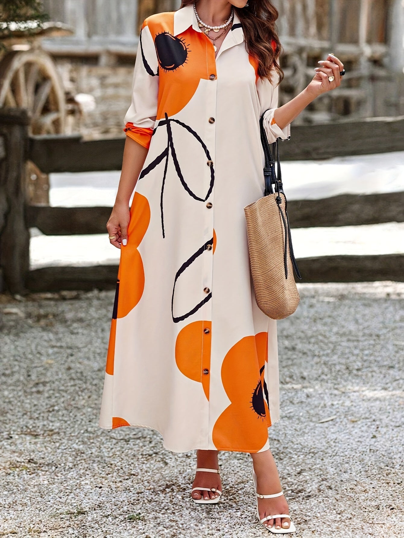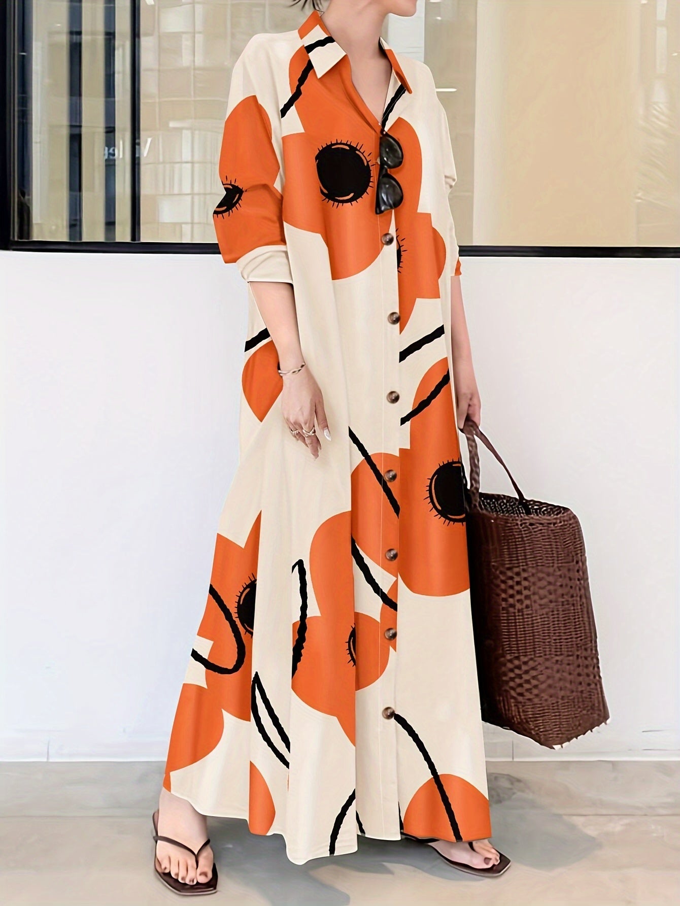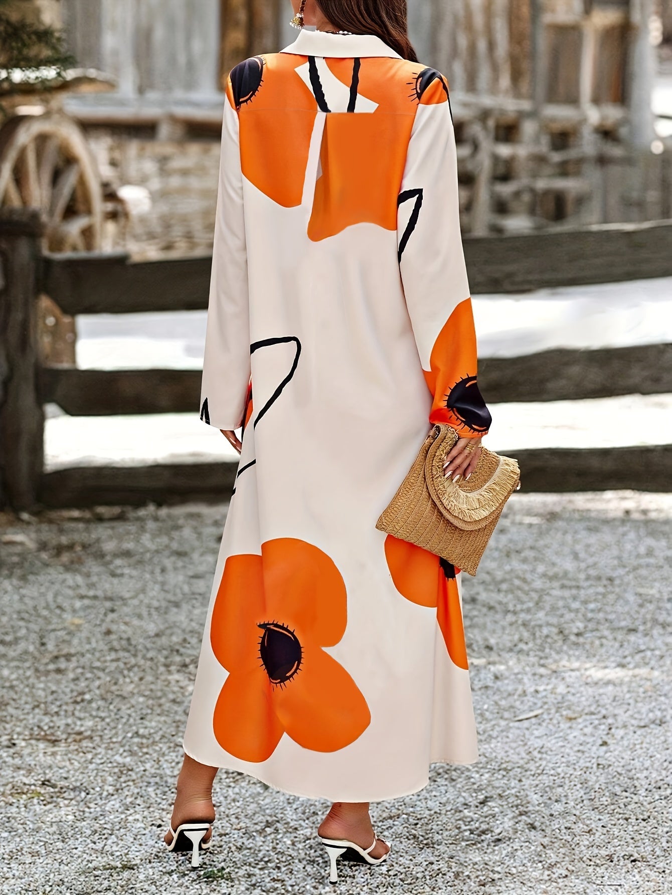 Elegant Floral Print Button-Up Long Dress - Casual Long Sleeve, Loose Fit with Lapel Collar for Women, Elegant Style, Four Seasons