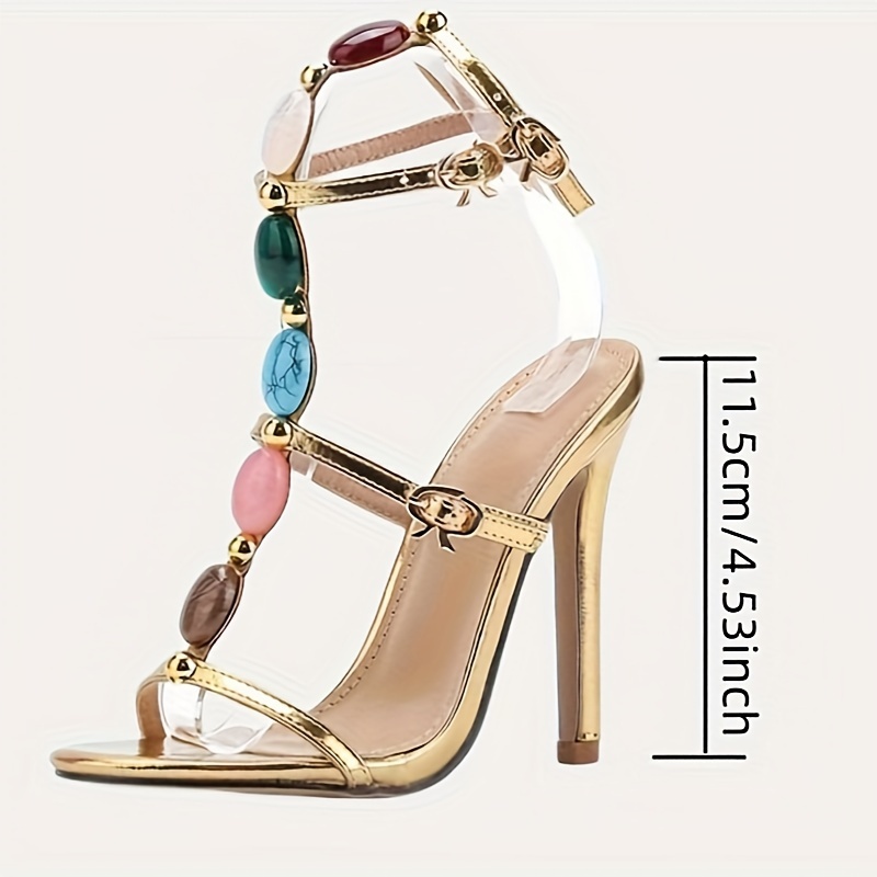 Elegant Women's Golden Striped High Heel Sandals with Colorful Gemstone Accents - Open Toe, Ankle Strap Party Shoes for Summer, PU Cover & PVC Sole