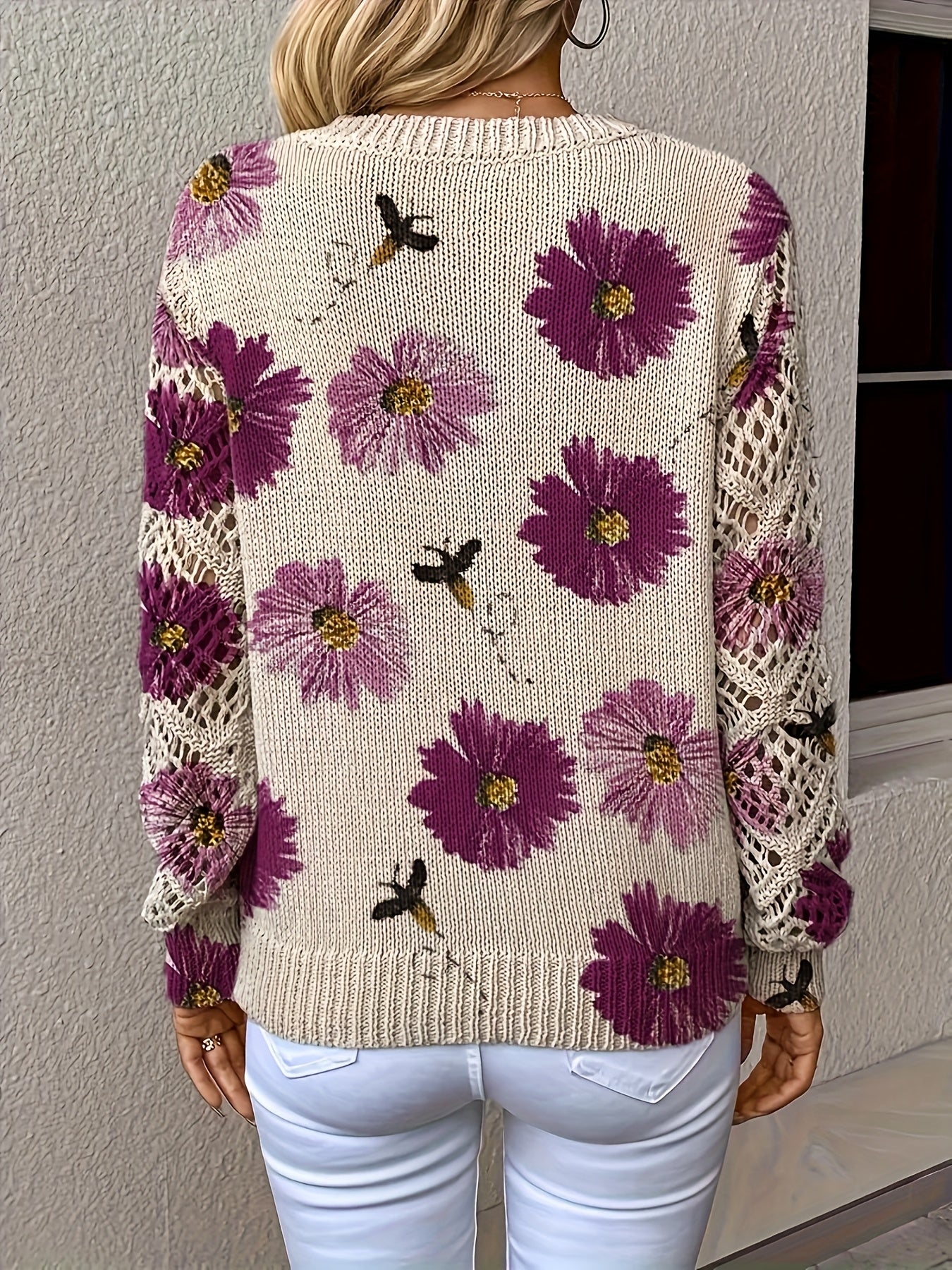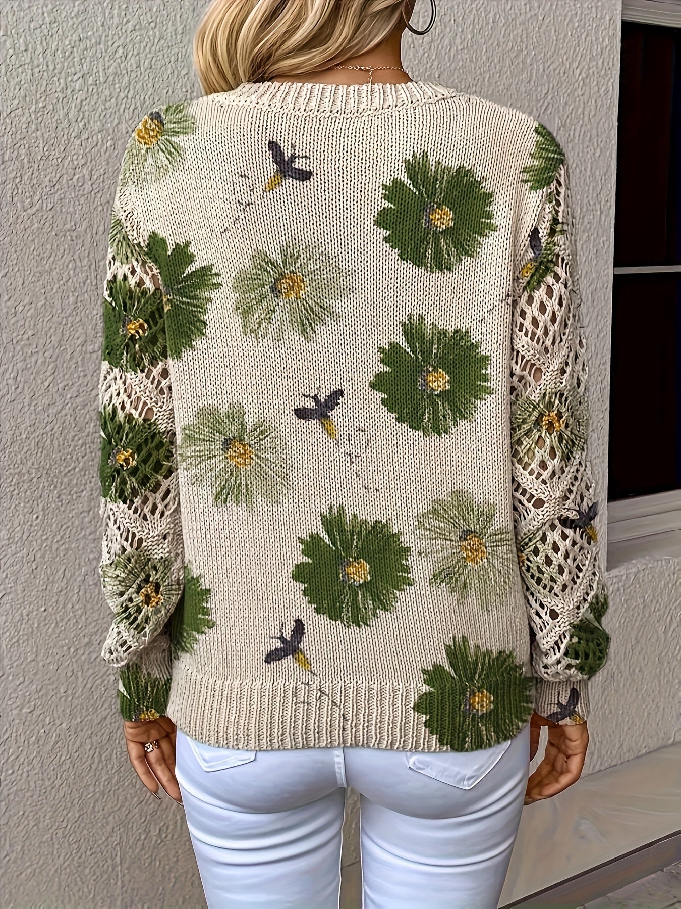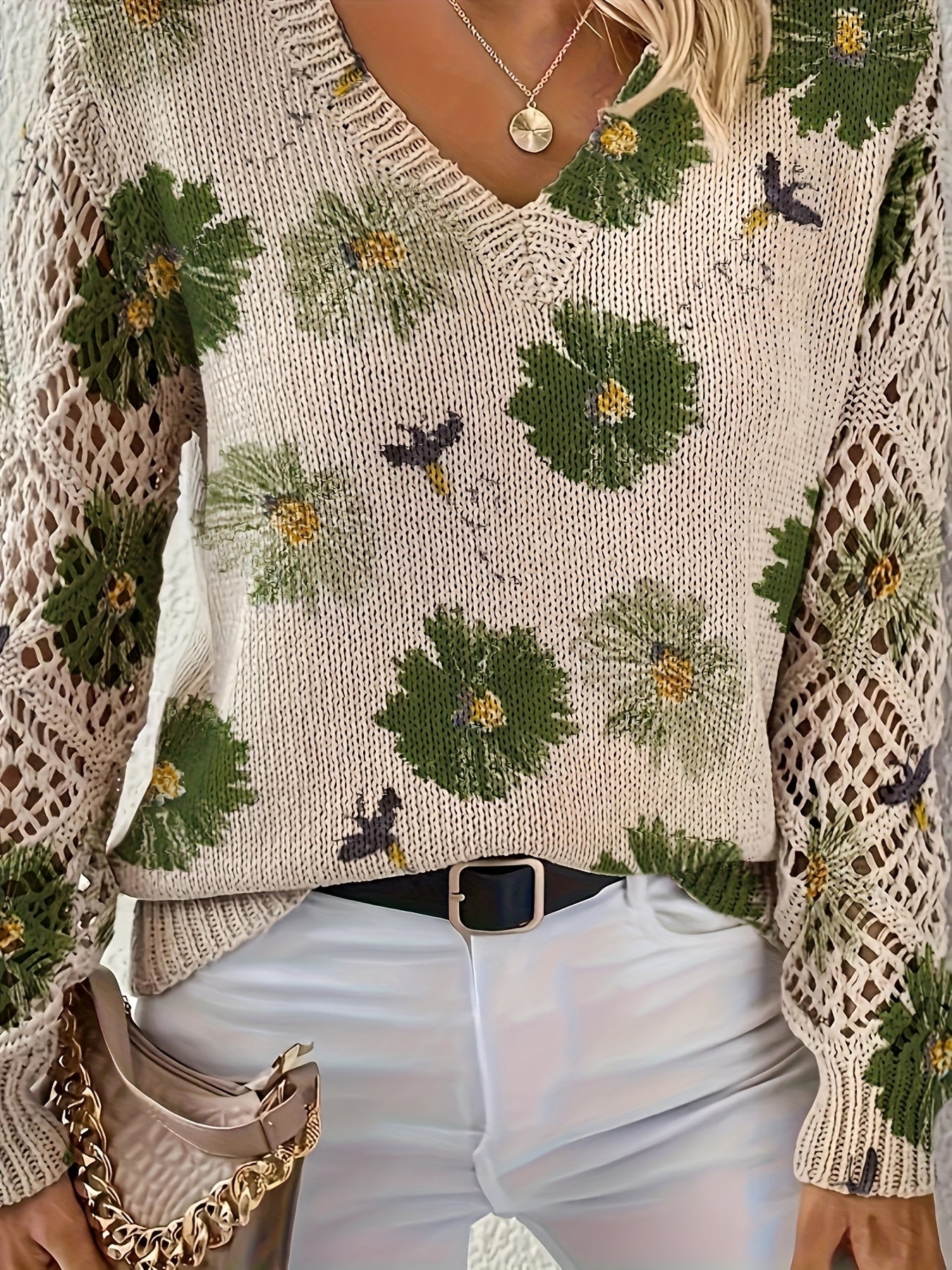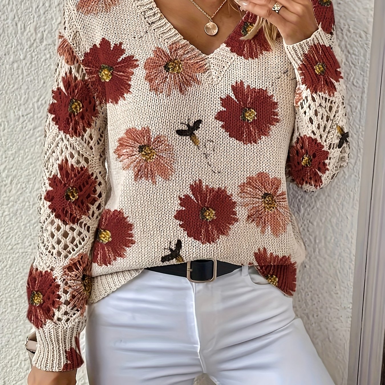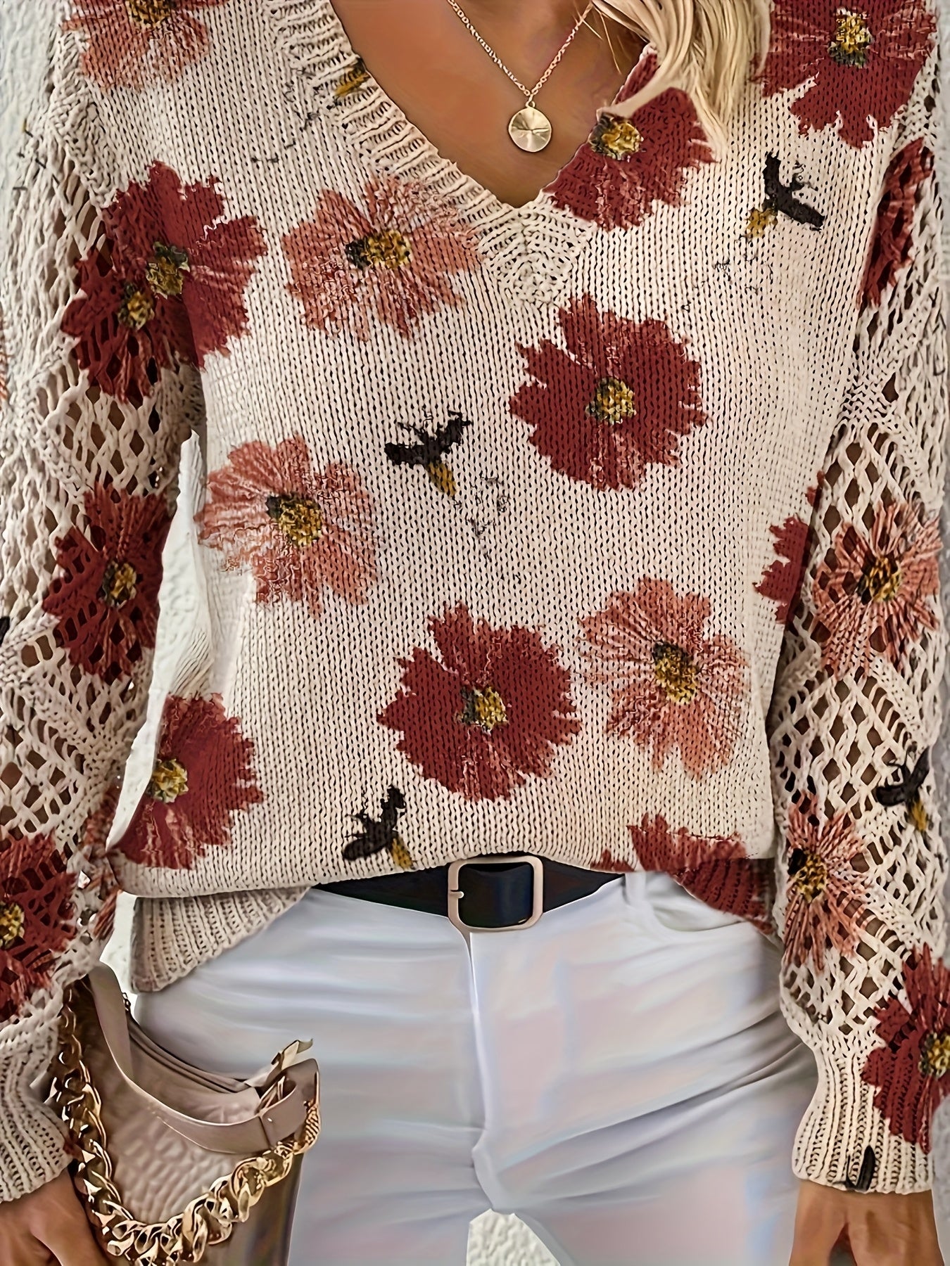 Graceful autumn and winter, spring and summer, four-season style, bohemian fashion, trendy versatile V-neck long-sleeve Women's top with floral digital print, all-over printed knitwear for office, streetwear, home, and travel