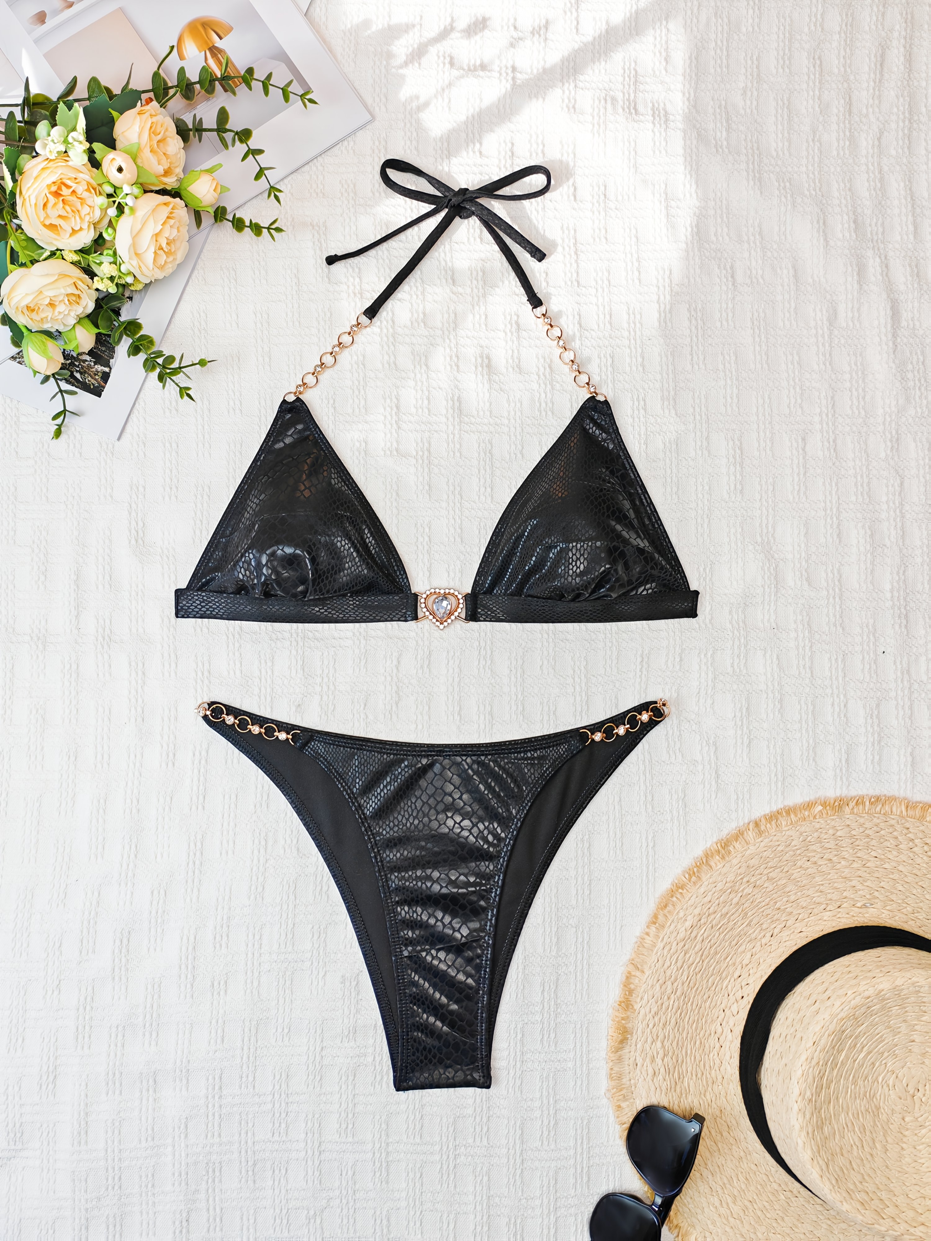 New Black Glossy Patterned Bikini Set for Women, Sexy with Rhinestones, Perfect for Vacations, Hot Springs, And Beach Outings.