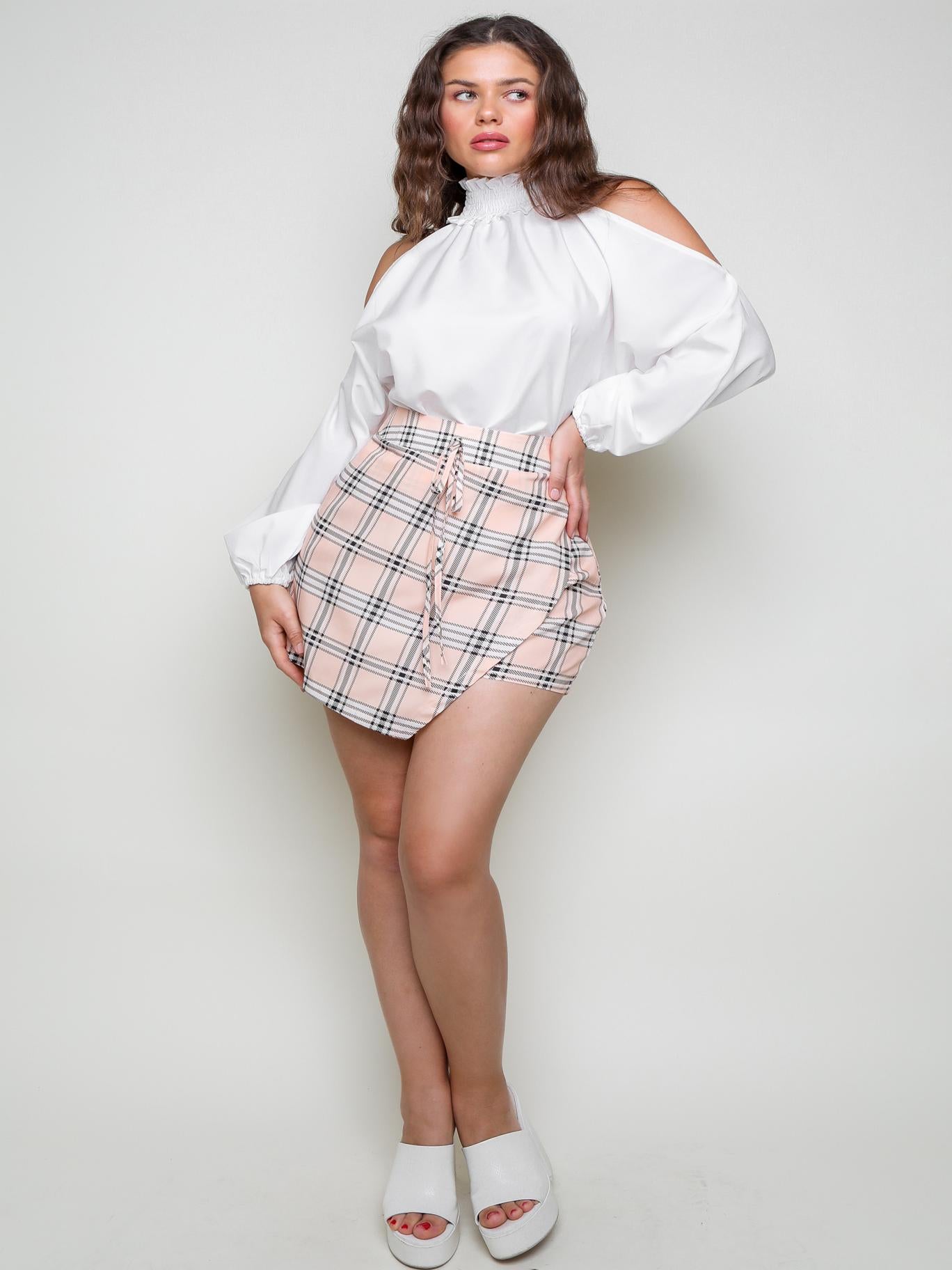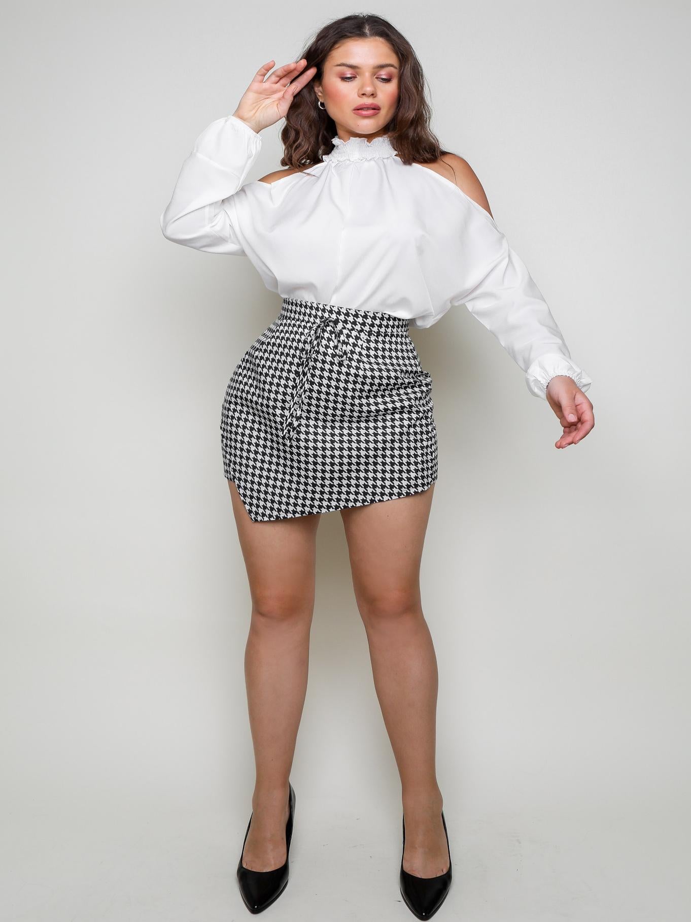 NEW COLD SHOULDER SHIRRED TOP HOUNDSTOOTH PRINT TIE FRONT SKORTS SET