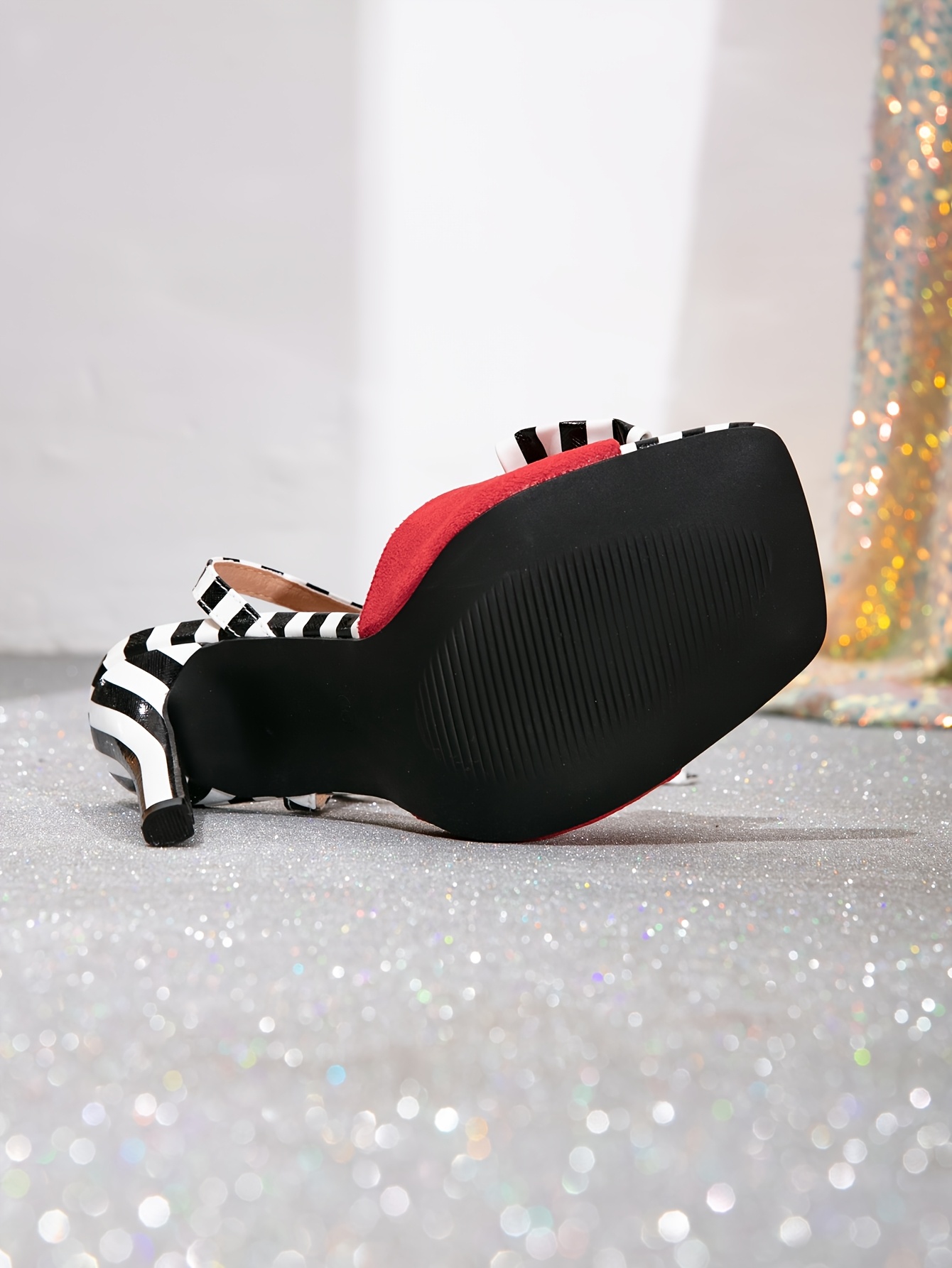 Red & White Striped Women's High Heel Sandals with Bowknot - Open Toe, Ankle Strap, Fashion Party Shoes for Summer, Elegant French-Inspired Design for Evening Wear, Evening Footwear | Elegant Footwear | Durable Rubber Sole, D