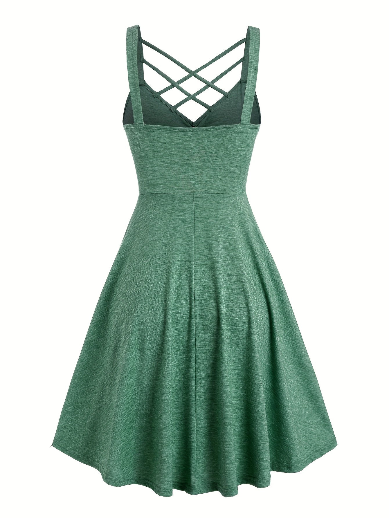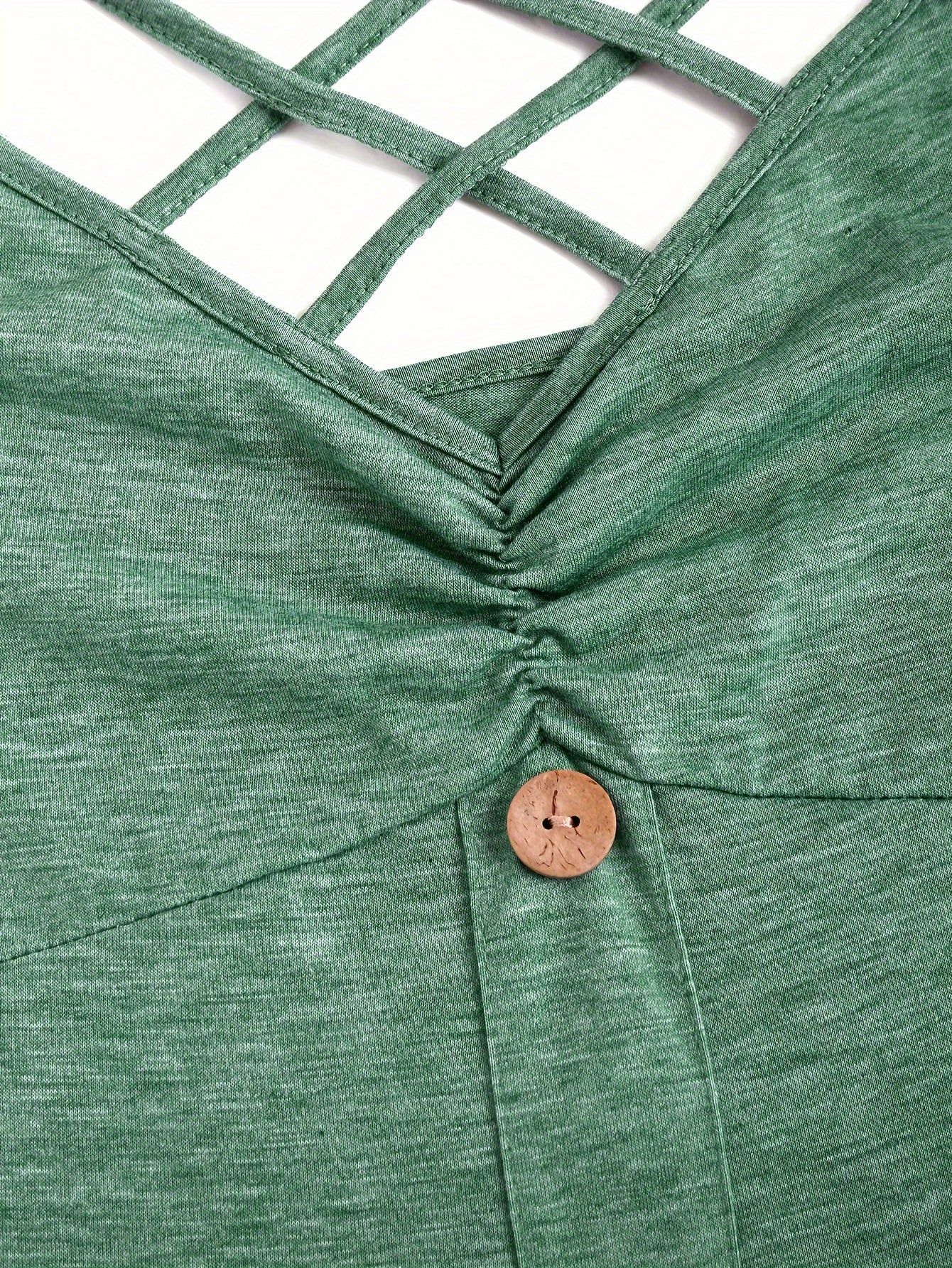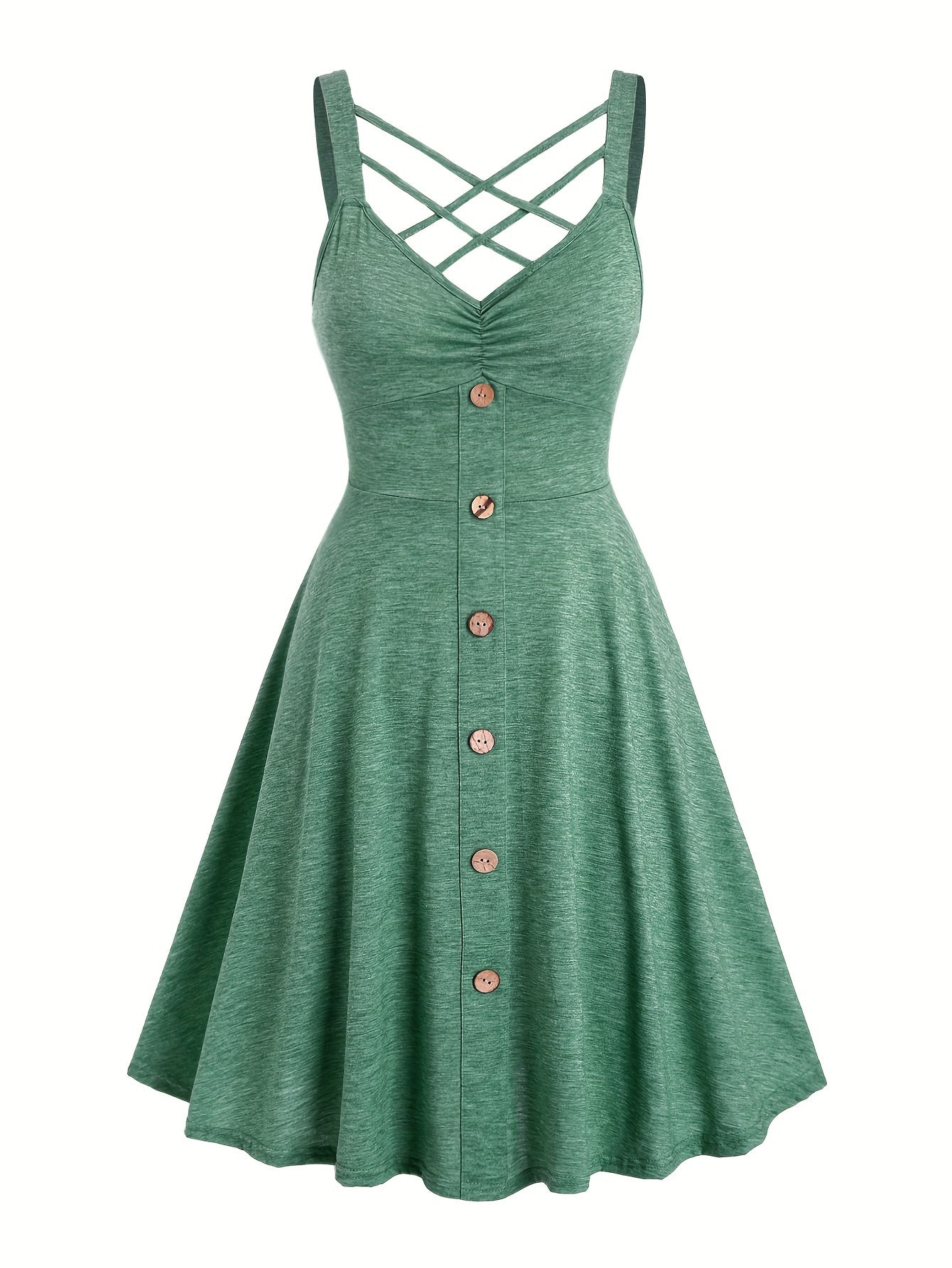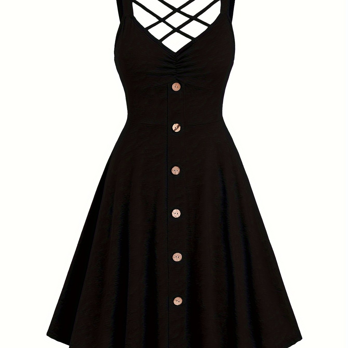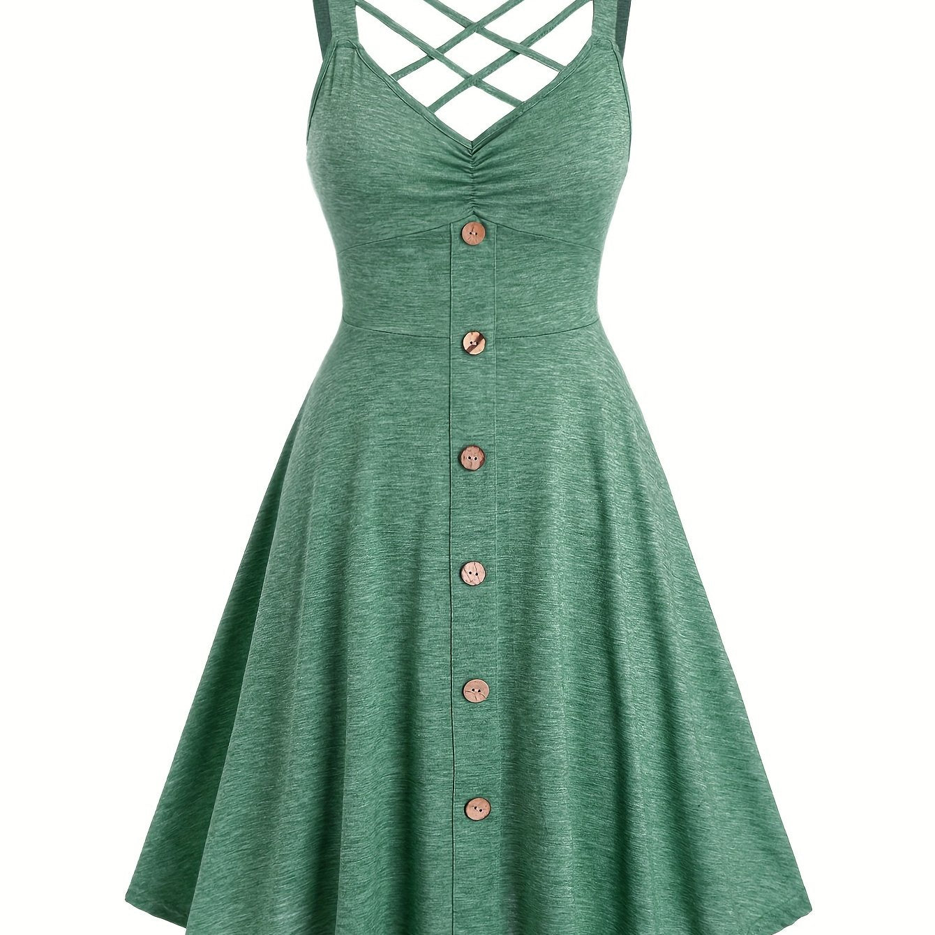 [Ruched V-neck Tank Dress] Button Decor Ruched V-neck Tank Dress, Versatile Sleeveless Criss Cross Dress For Spring & Summer, Women's Clothing