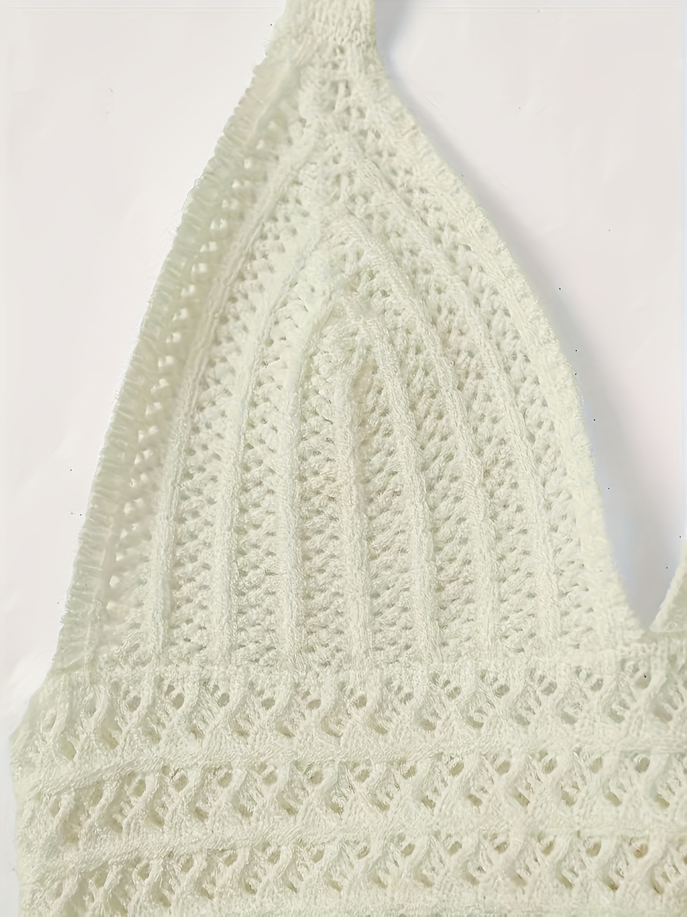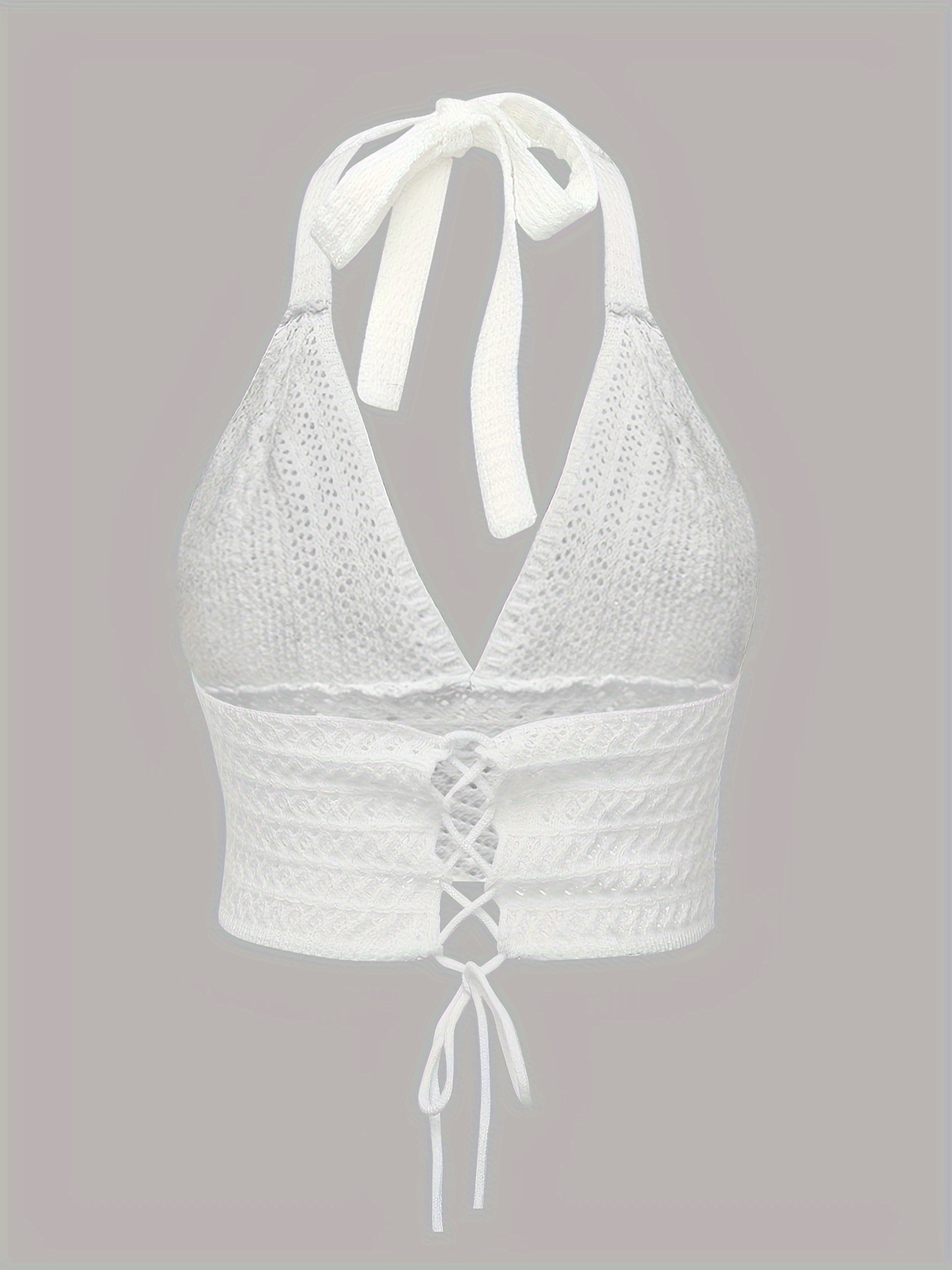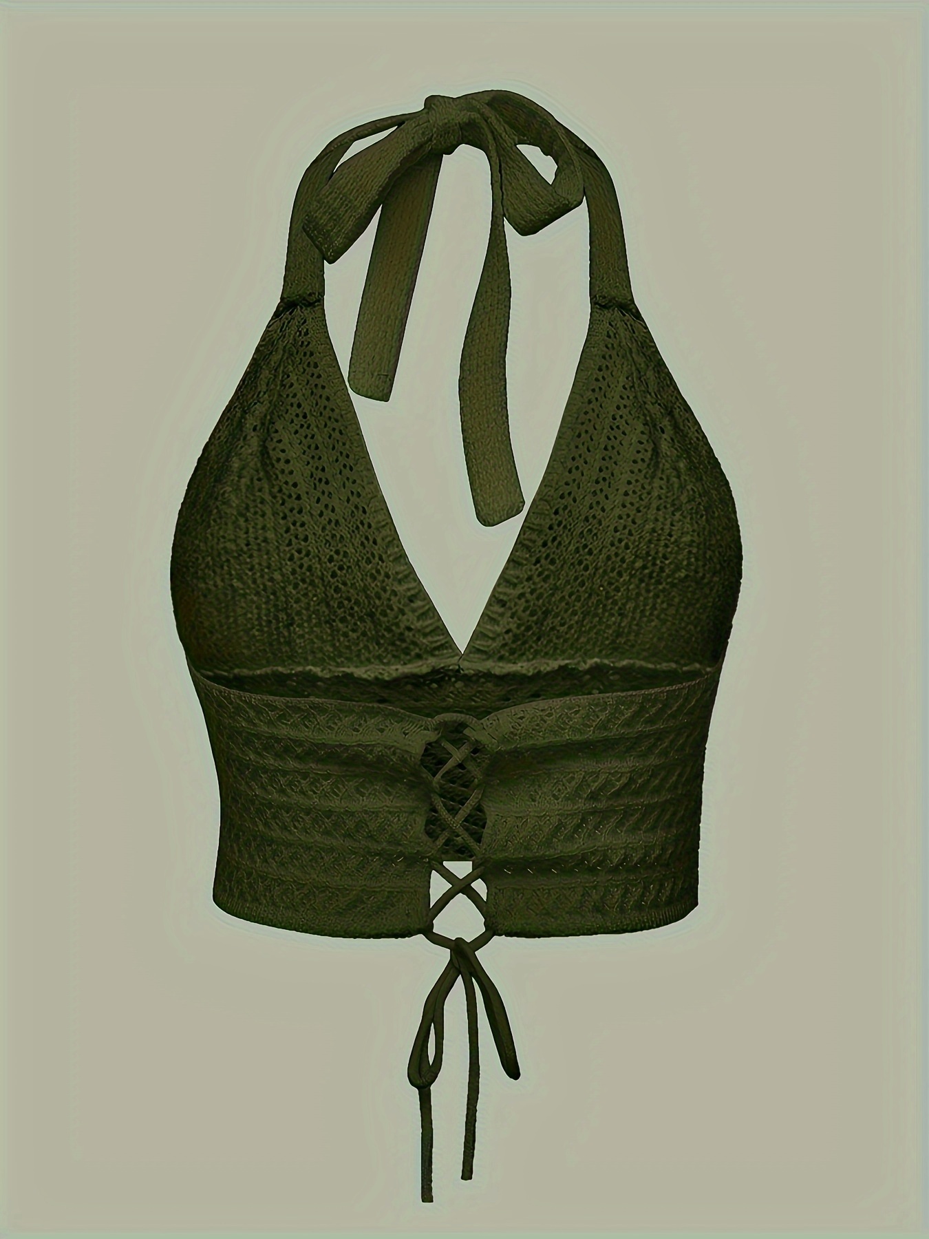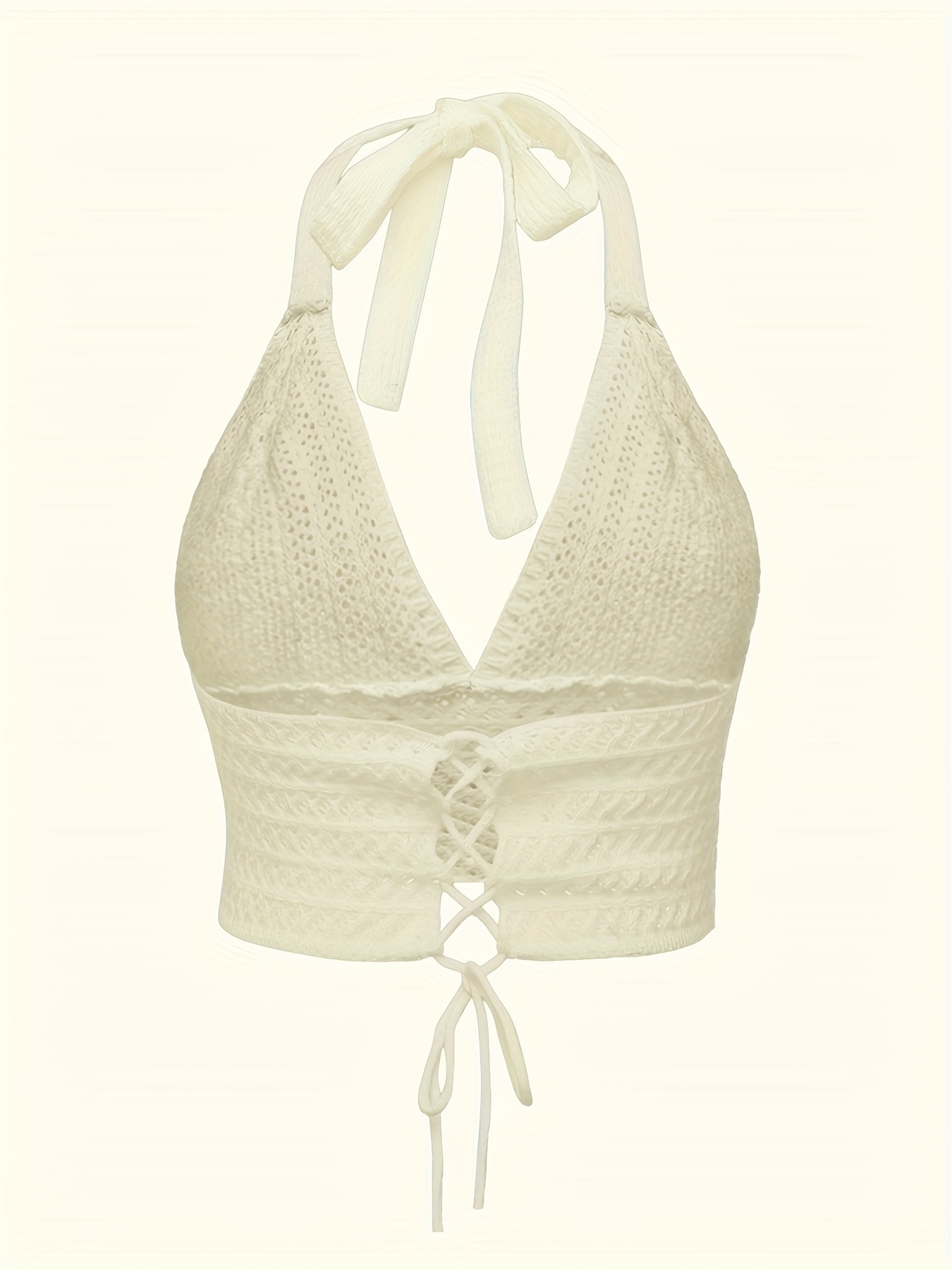 Solid Cross Tie Back Halter Top, Versatile V-neck Backless Crop Knitted Top, Women's Clothing