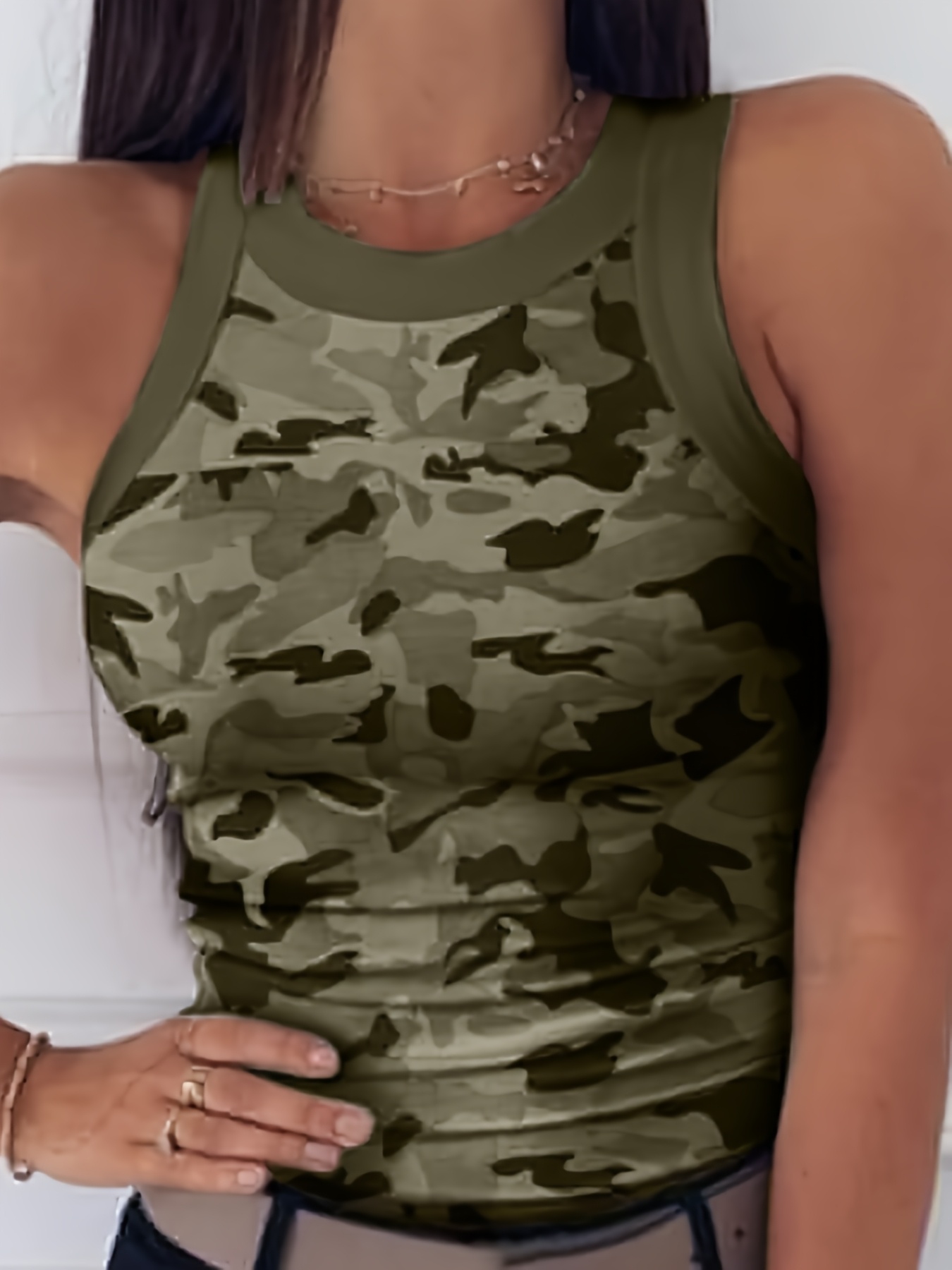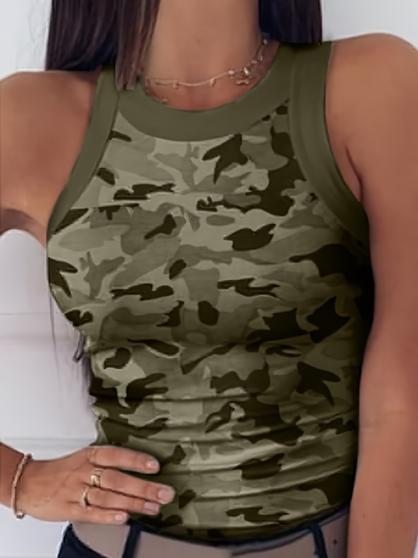 Summer 2025 Women’s Camo Print Sleeveless Tank Top - Sexy Round Neck Vest, Stretch Polyester Knit Fabric, Machine Washable, Olive Green Camouflage Pattern, Casual Shoulder-Baring Design, Summer Casual Wear | Sleeveless Fash