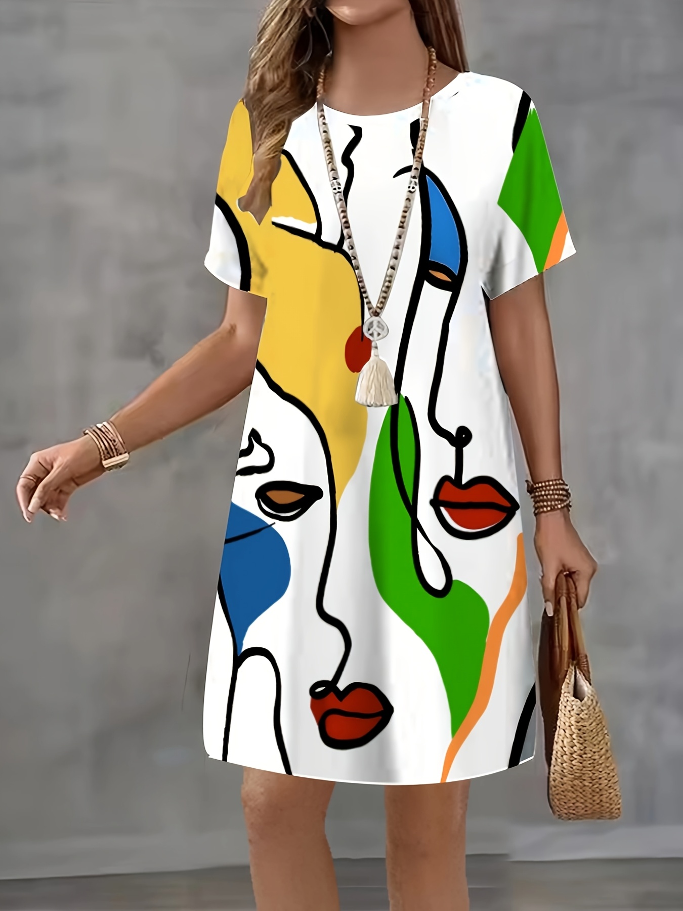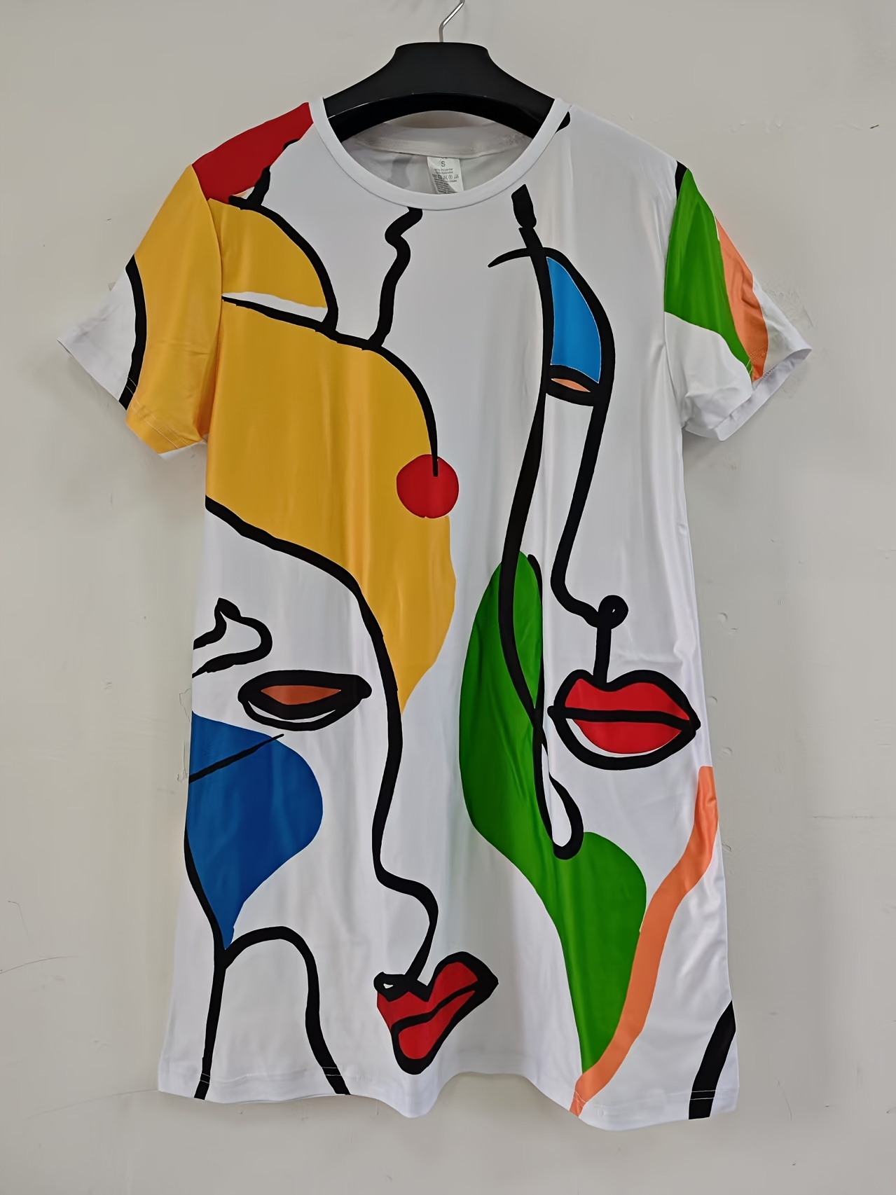 Women'S Casual Summer Dress with Vibrant Abstract Face Print - Short Sleeve, Loose Fit, All-Season, T-Shirt Style, Allseason Dress | Vibrant Print Dress | Comfortable Fit, Plus Size Dress