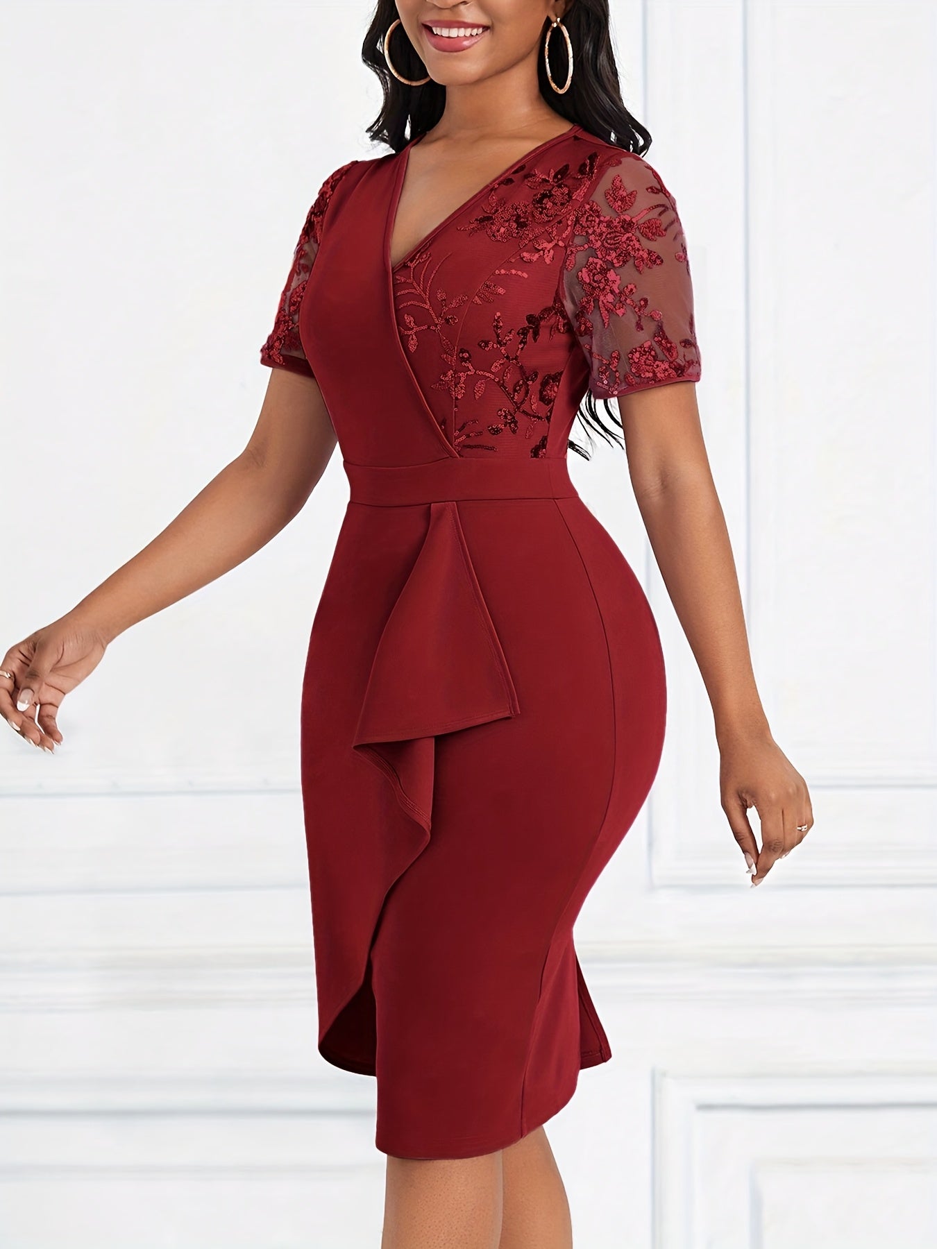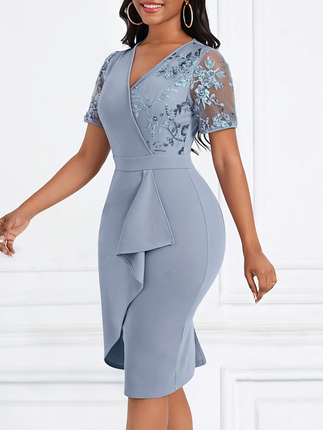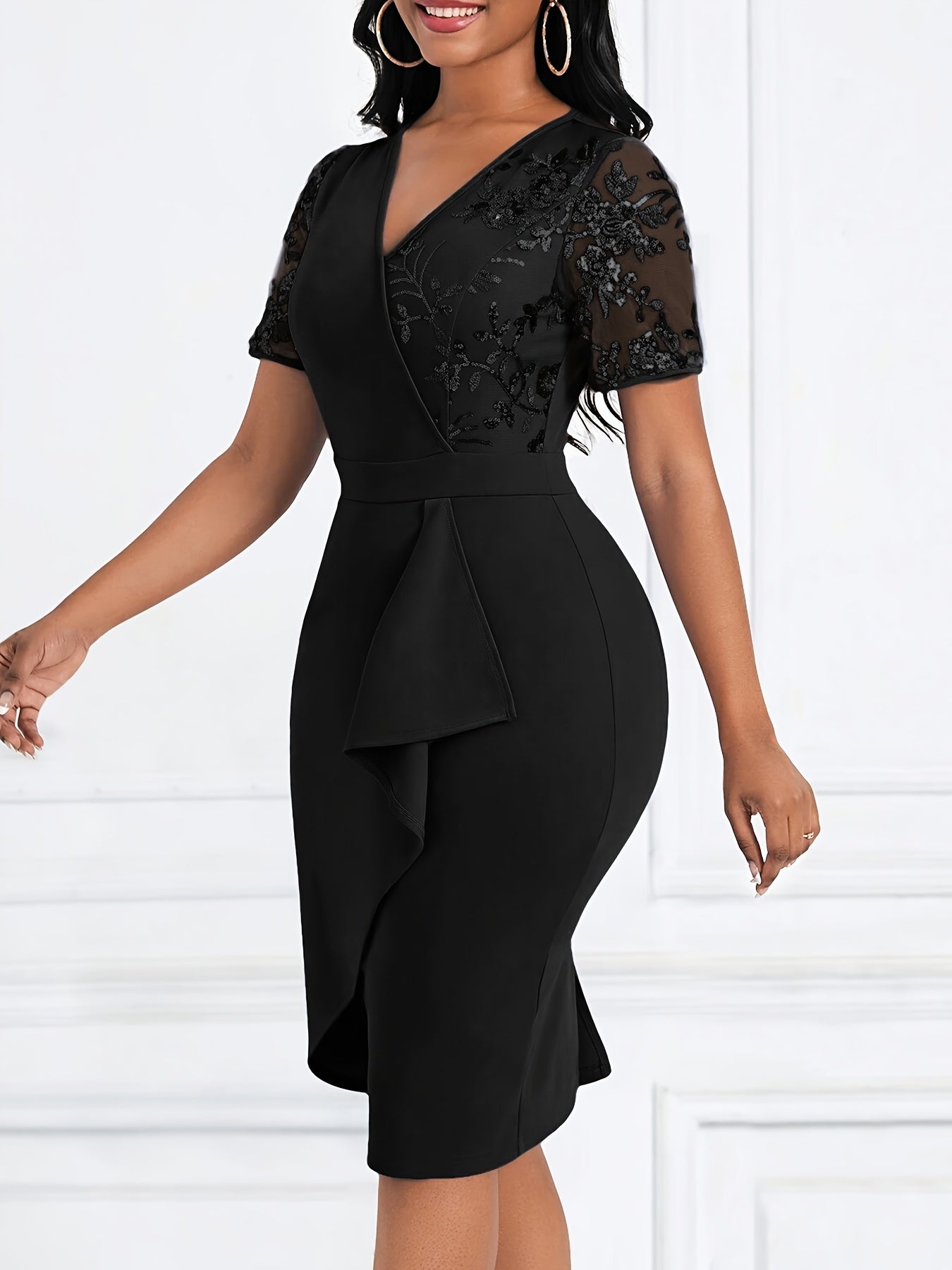 Women'S Elegant Black V-Neck Bodycon Dress with Floral Lace Detail - Short Sleeve, Ruched Waist, Stretch Polyester for All Seasons, Formal Evening Wear | Vneck Dress | Glossy Textur