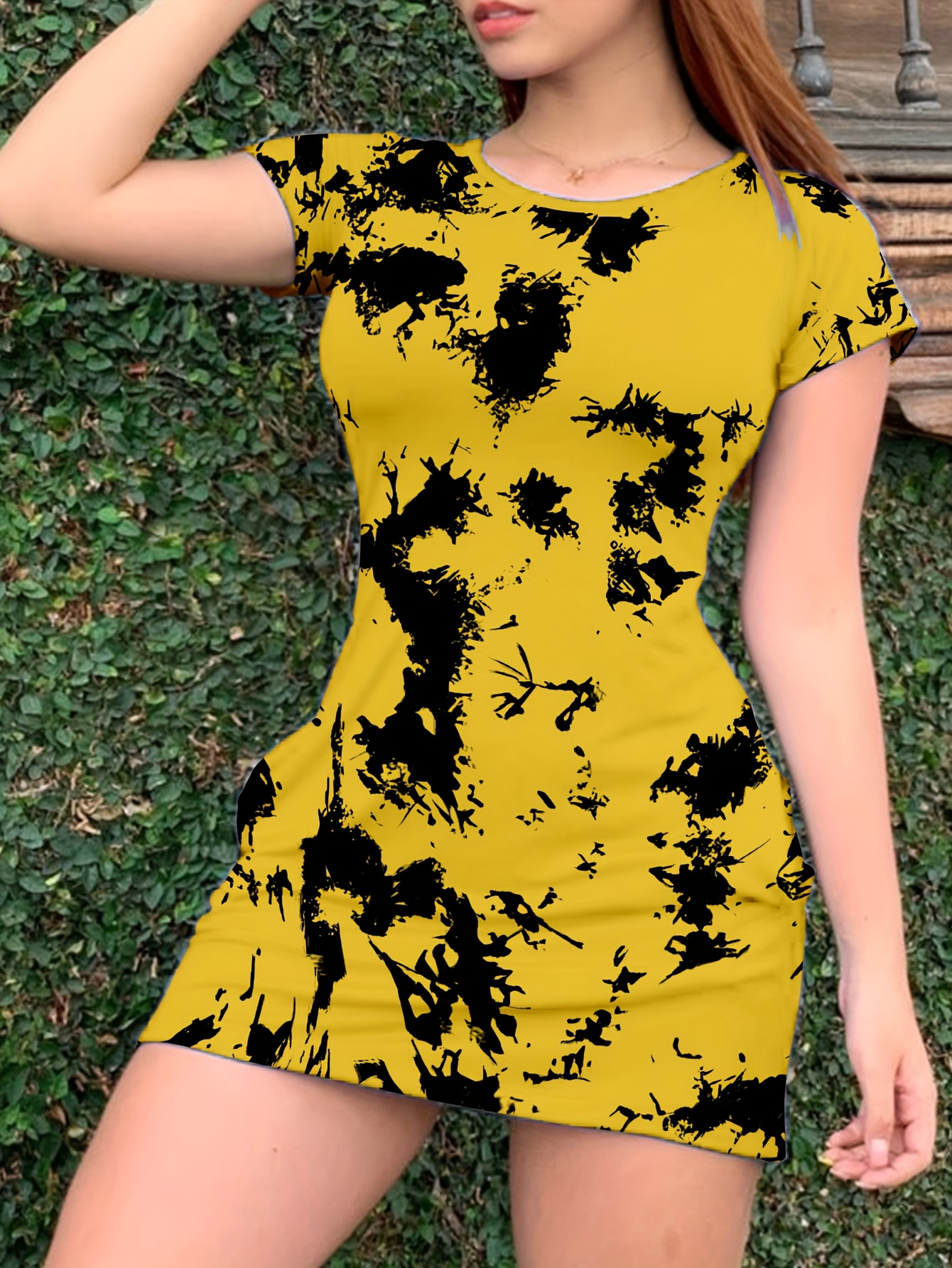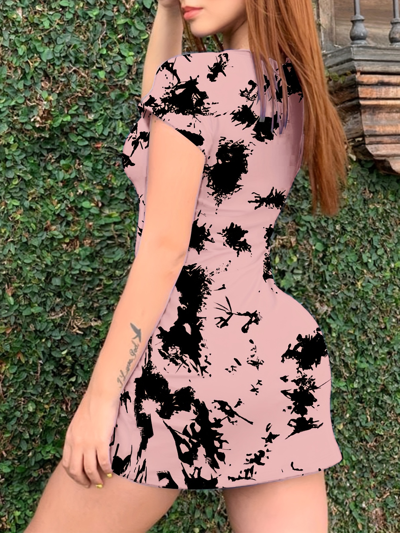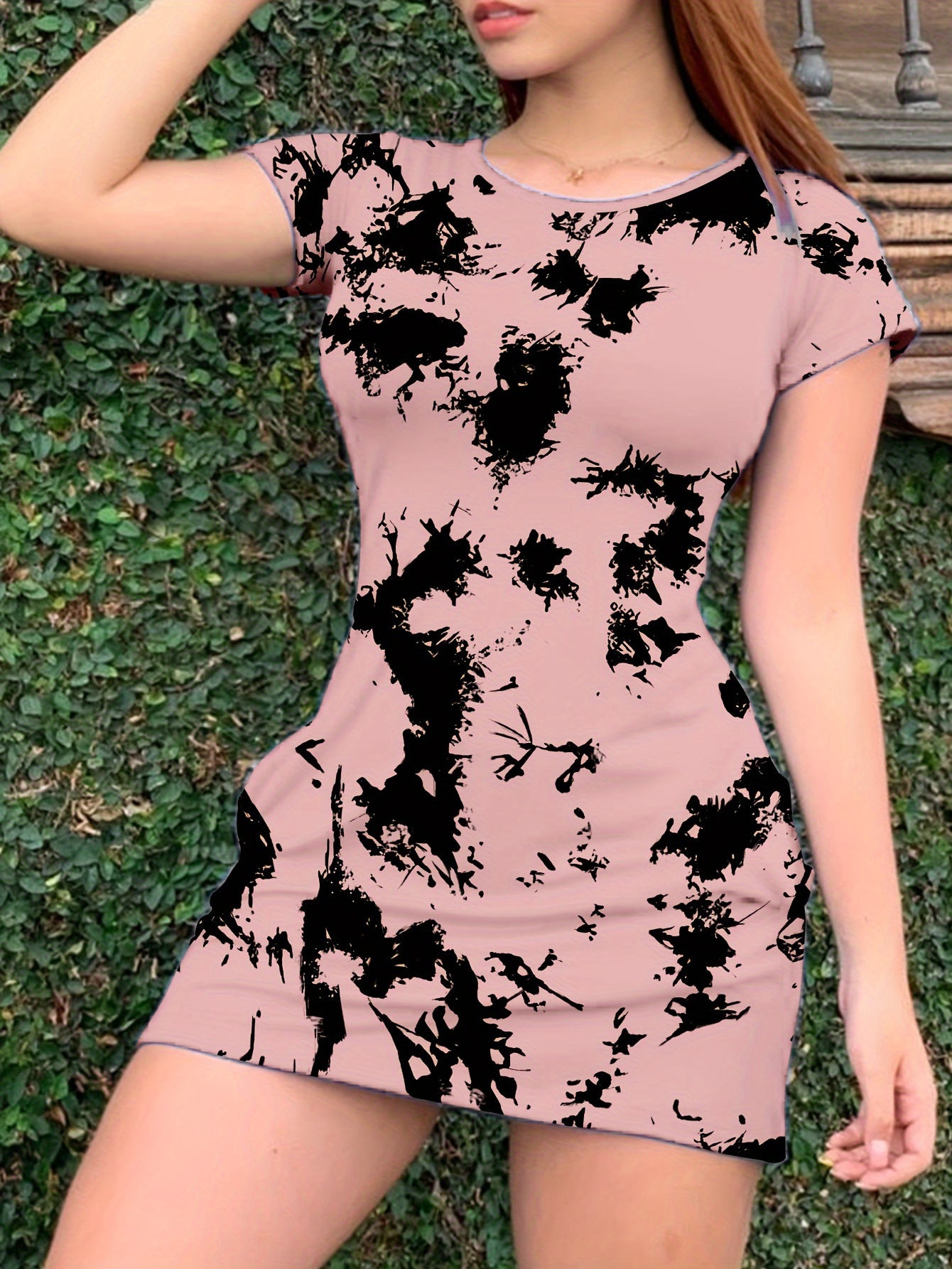 Women's Elegant Tie-Dye Print Short Sleeve Dress - Casual Round Neck Fitted Flared Skirt with Pockets, Machine Washable Pink & Black Summer Dress for Spring/Fall, Spring Fashion | Tiedye Pattern Dress | Comfortable Fabric