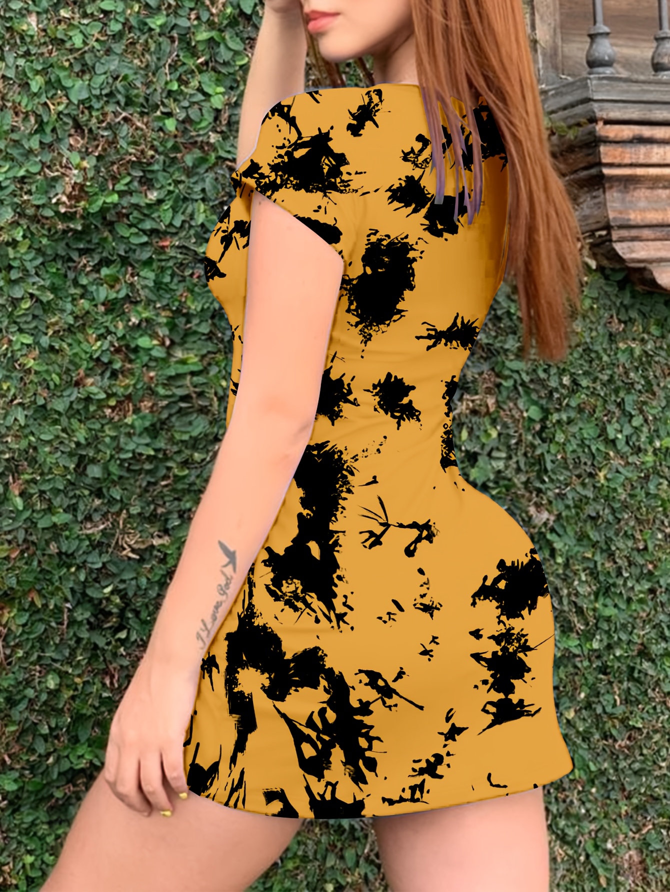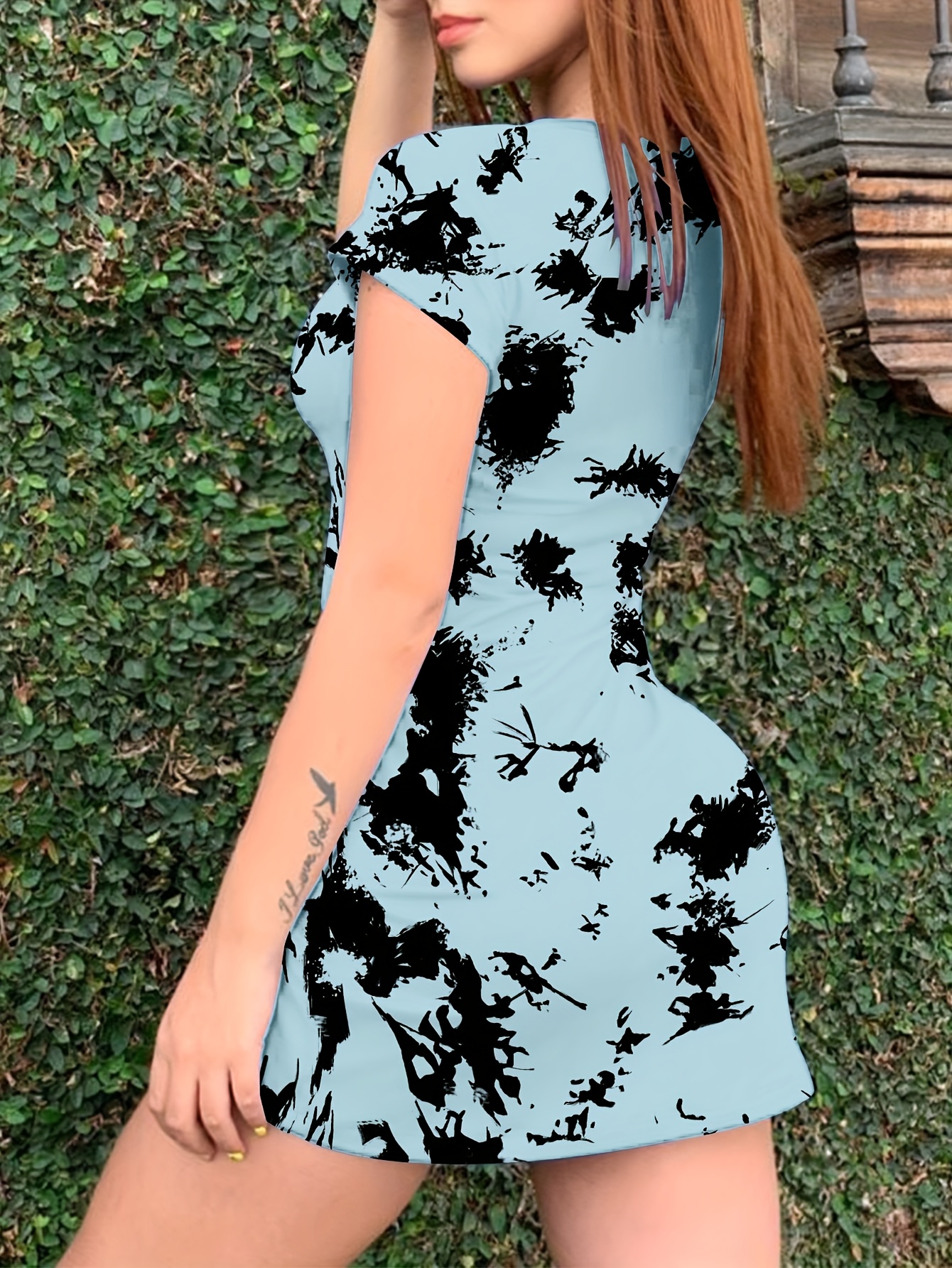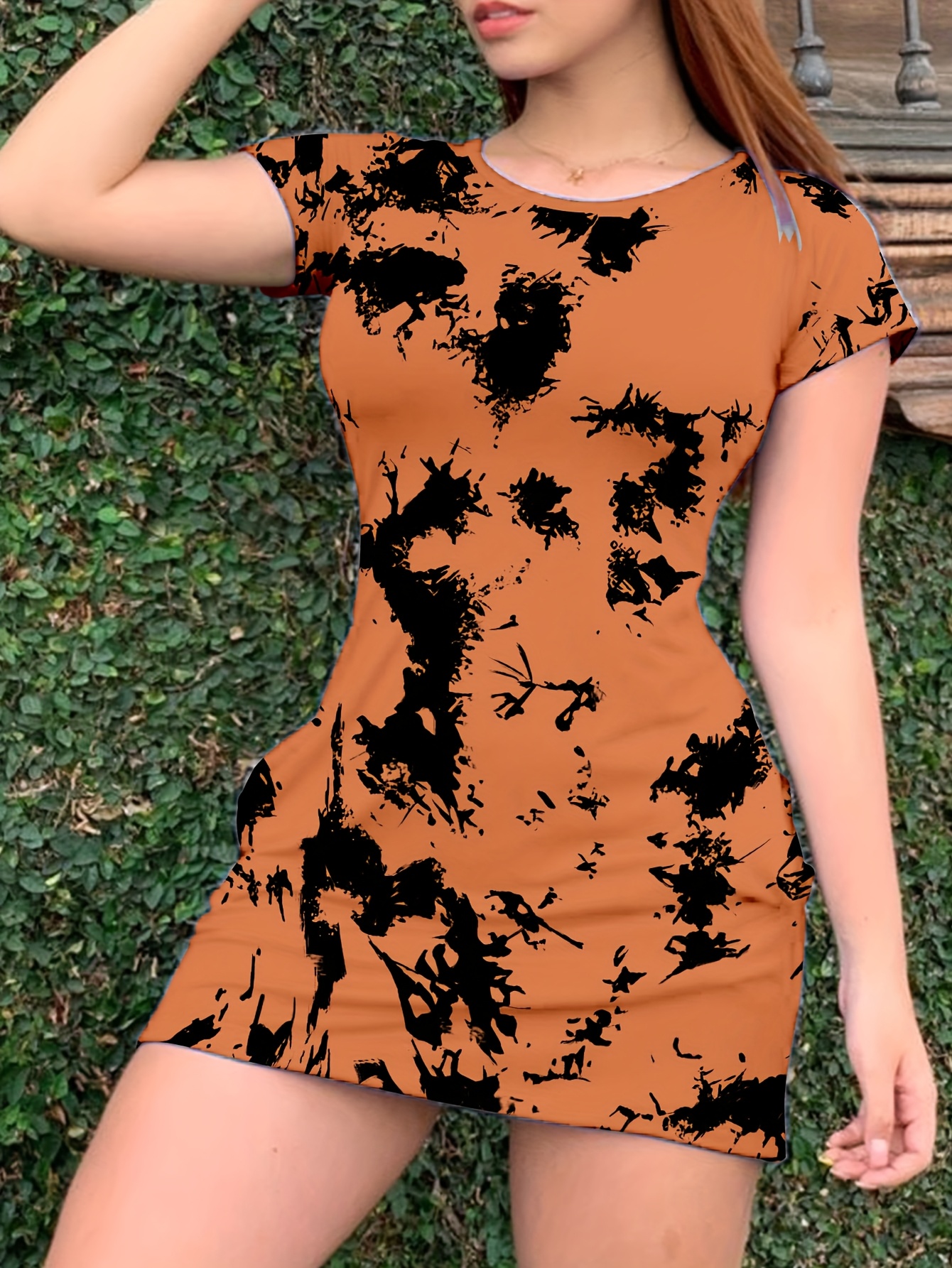 Women's Elegant Tie-Dye Print Short Sleeve Dress - Casual Round Neck Fitted Flared Skirt with Pockets, Machine Washable Pink & Black Summer Dress for Spring/Fall, Spring Fashion | Tiedye Pattern Dress | Comfortable Fabric