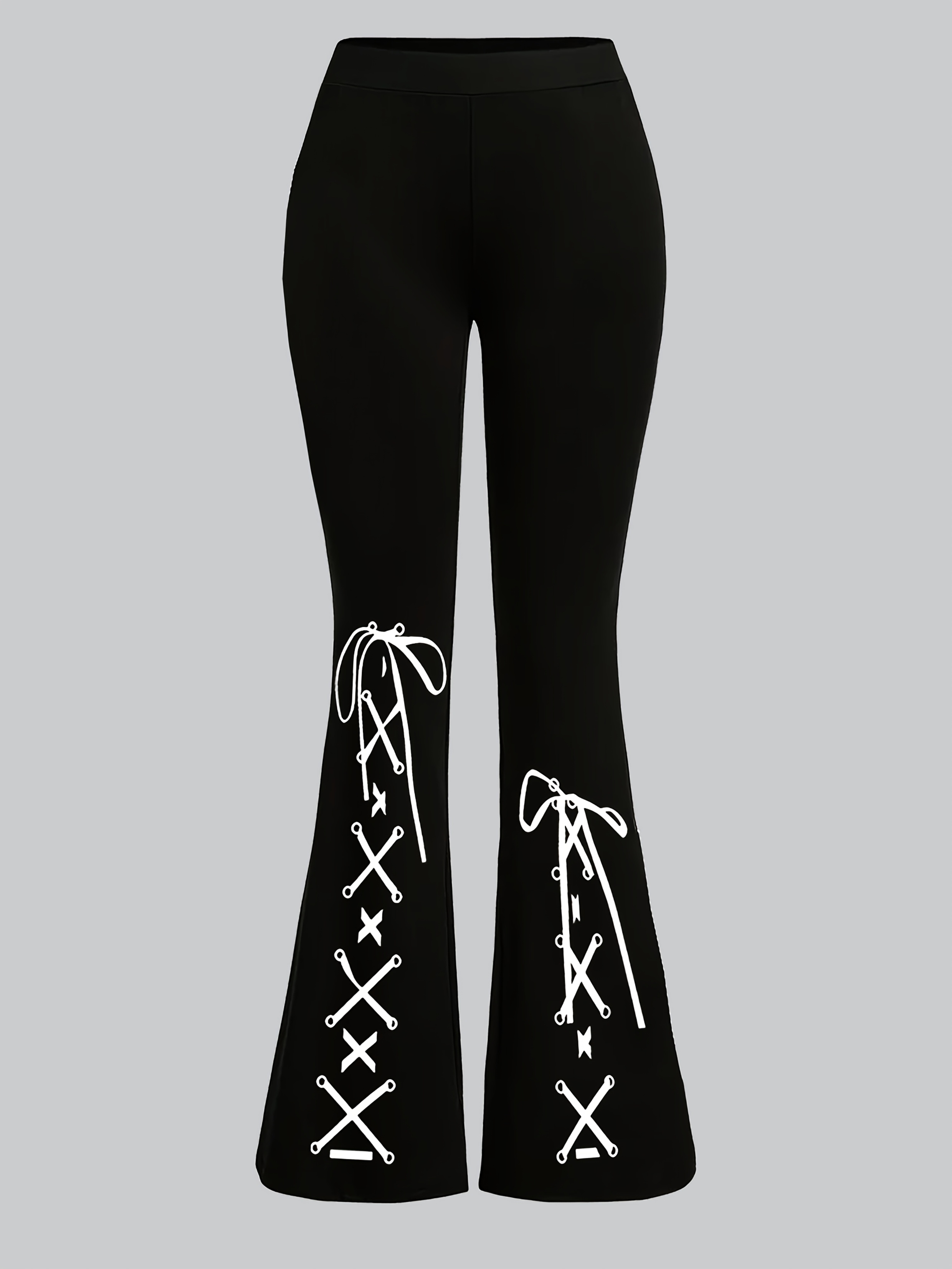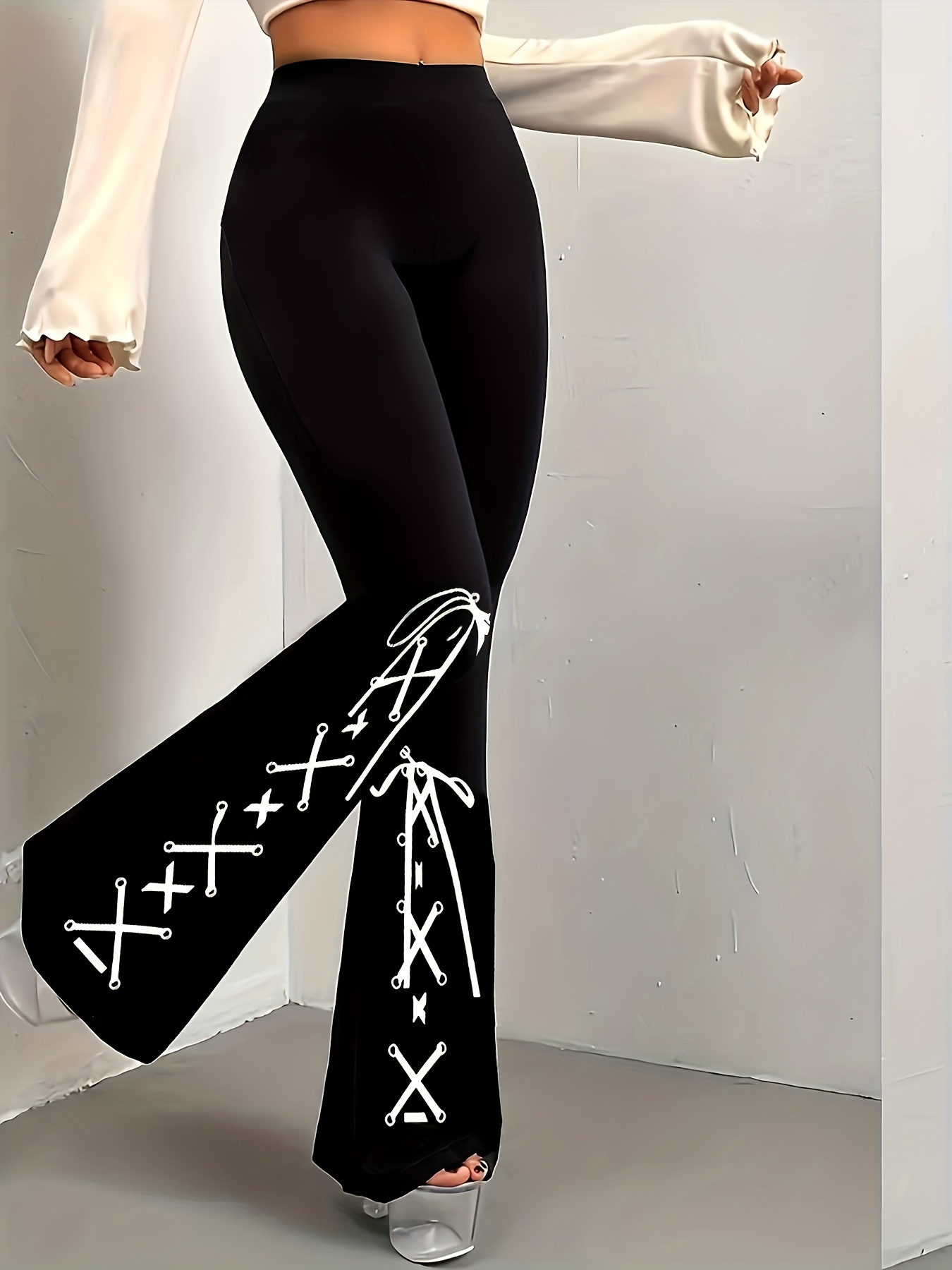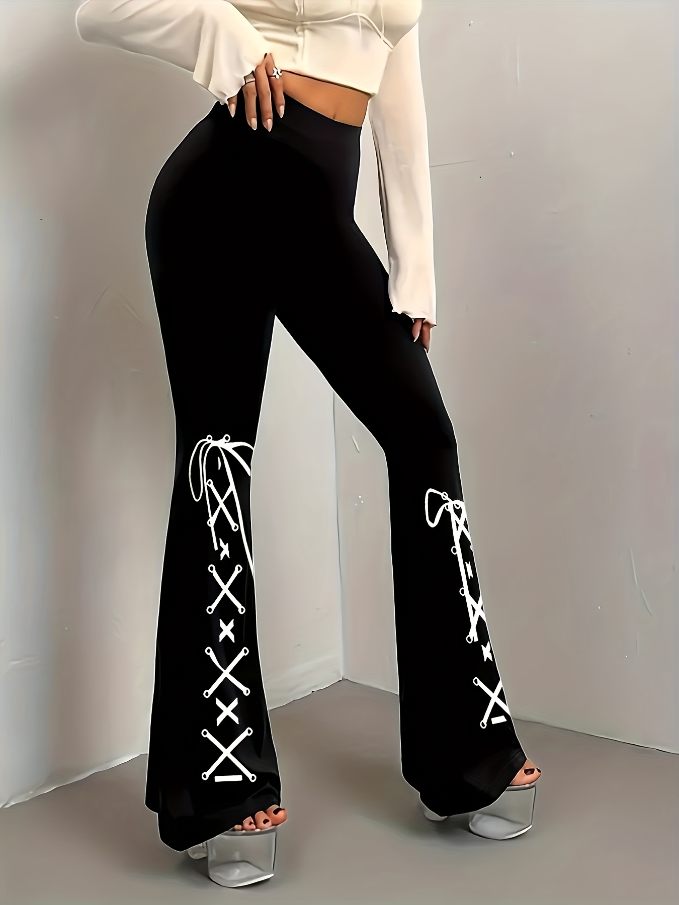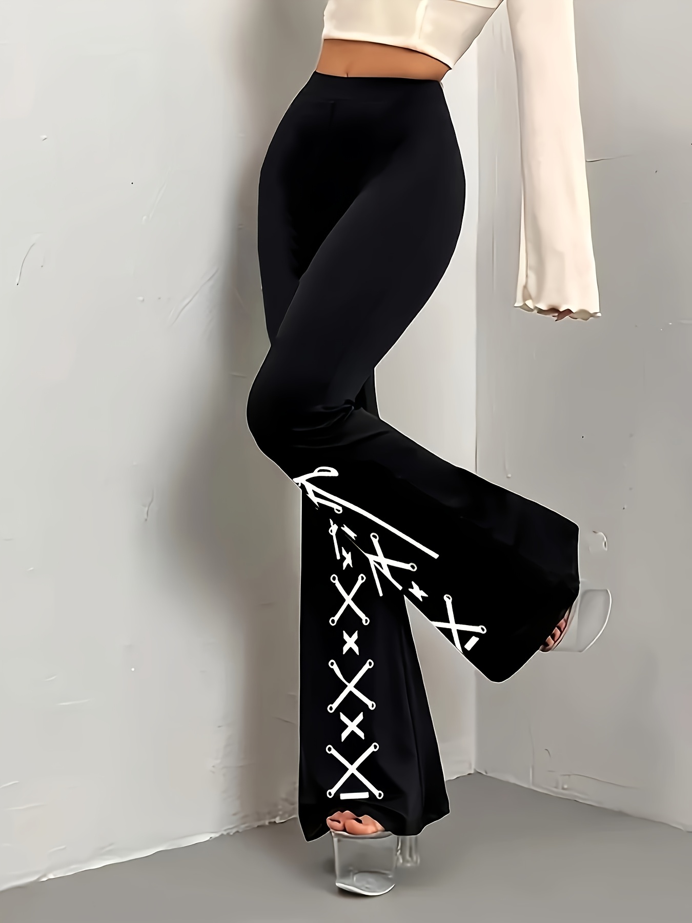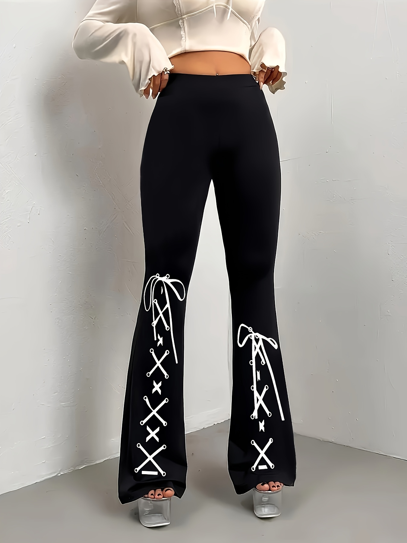 Women's Flared Pants | Black with White Lace-Up Design | Stretchy Polyester-Spandex Blend | Casual All-Season Wear | Machine Washable | Slim Fit Bell Bottoms for Everyday Style, Allseason Trousers | Stylish Casualwear | Comfo