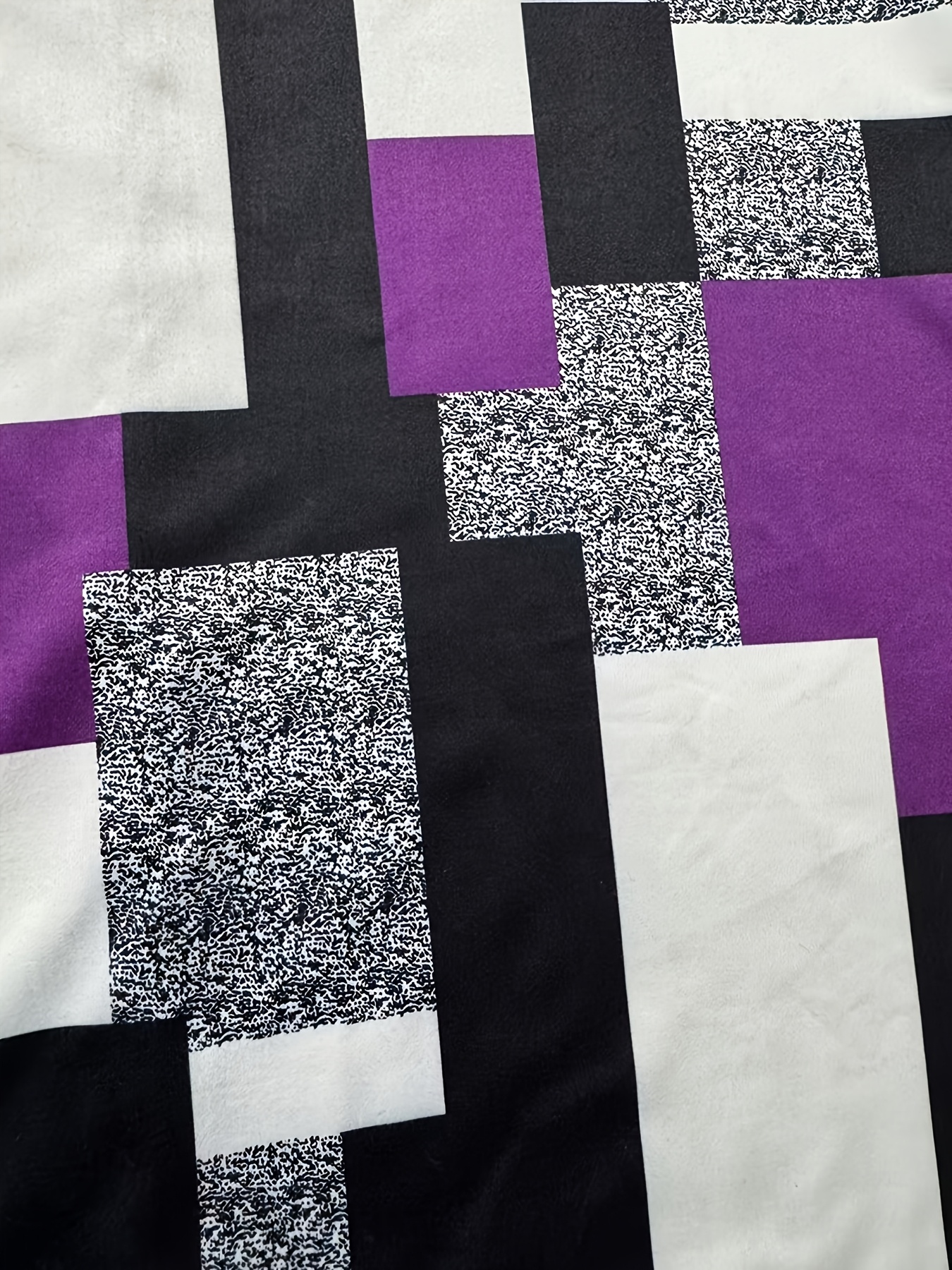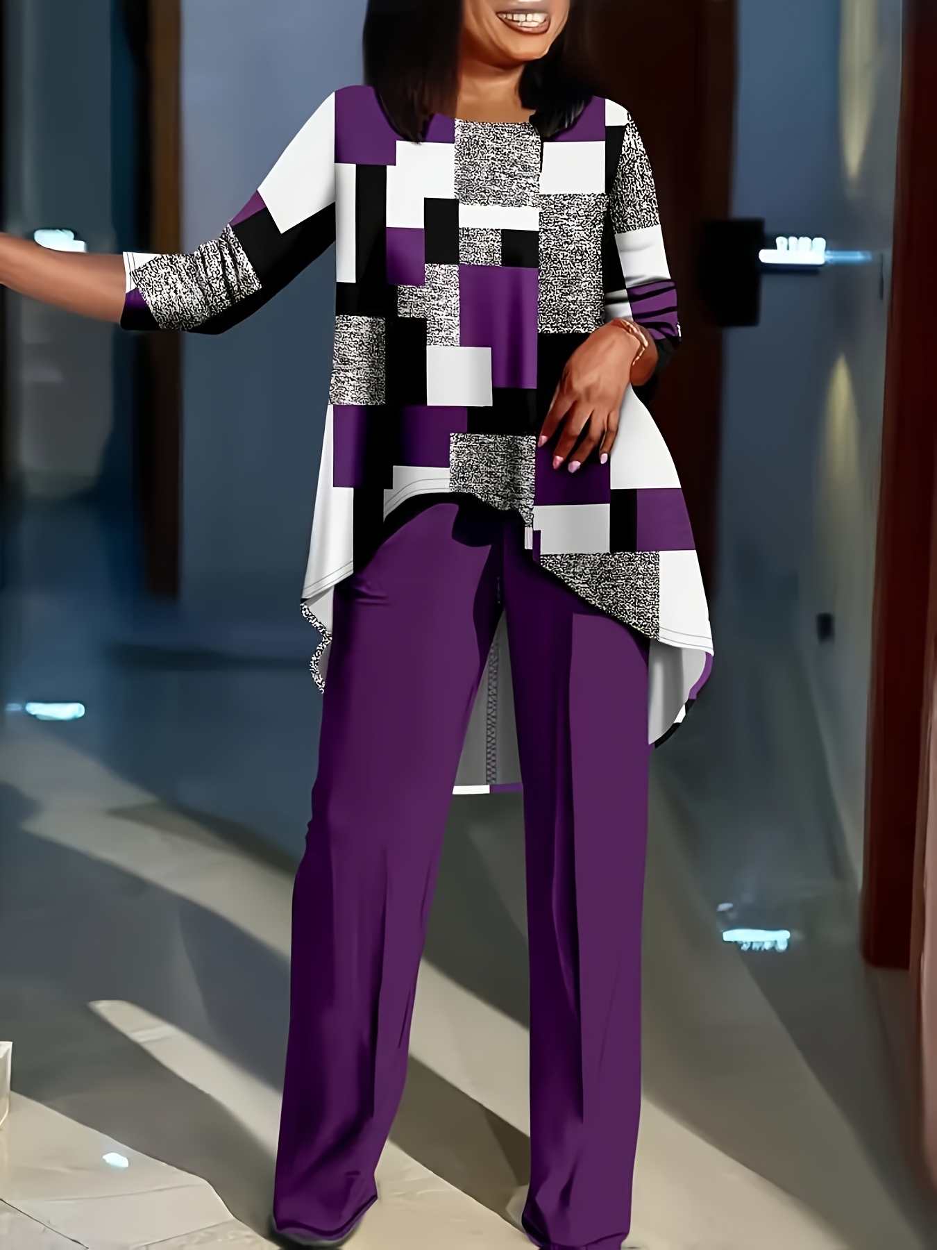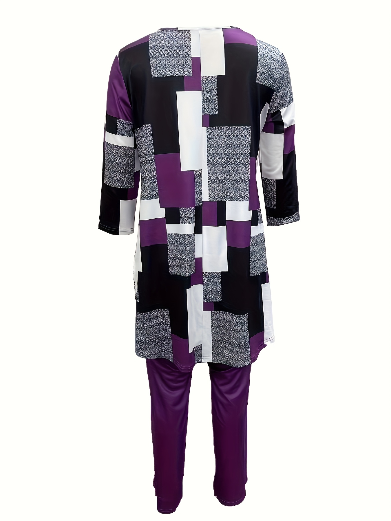 Women'S Geometric Patterned Crew Neck Top with Three Quarter Length Sleeves and Solid Color Pants Two-Piece Set