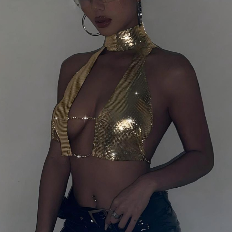 Women's Golden Sequin Halter Neck Tank Top with Suspenders - Sexy Party Clubwear, Form-Fitting Stretchy Glitter Top for Night Out & Festive Events, Festive Attire | Strapless Outfit | Metallic Finish