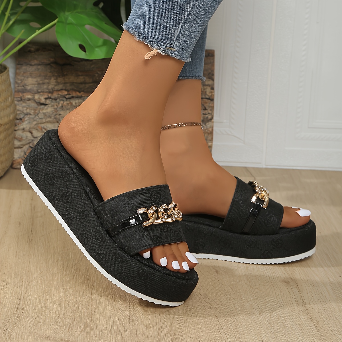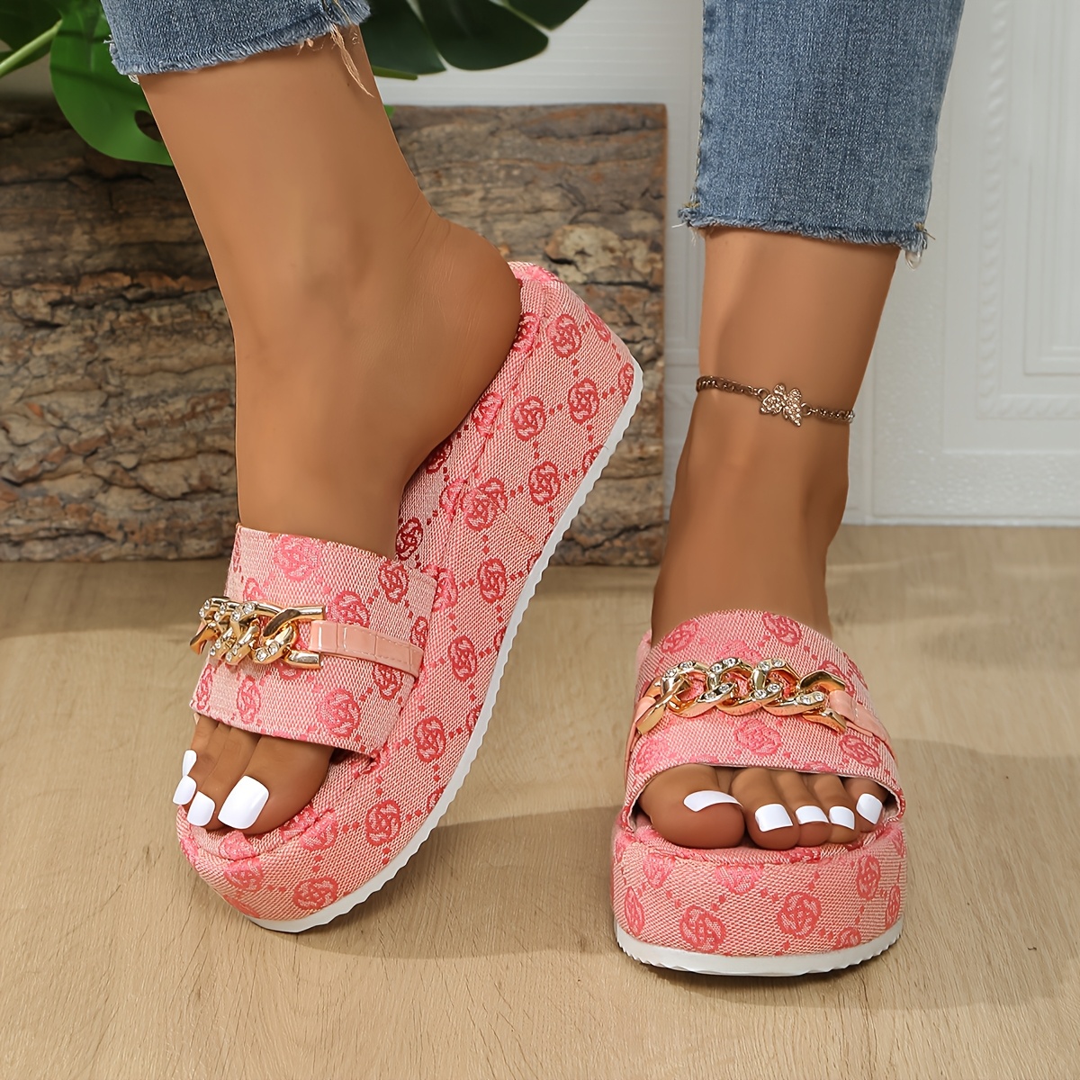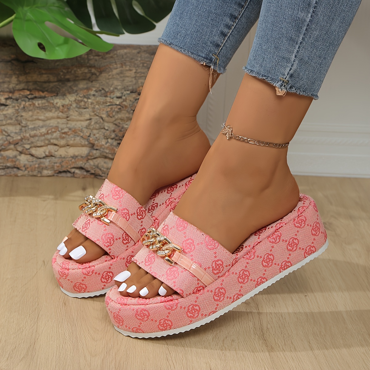 Women'S Pink Platform Sandals with Metal Chain & Rhinestones - Casual Slip-On, Open Toe, Mid-Heel, Lightweight & Stylish, All-Season Footwear, Casual Footwear | Metallic Chain Sandals | Rubber Sole Sandals