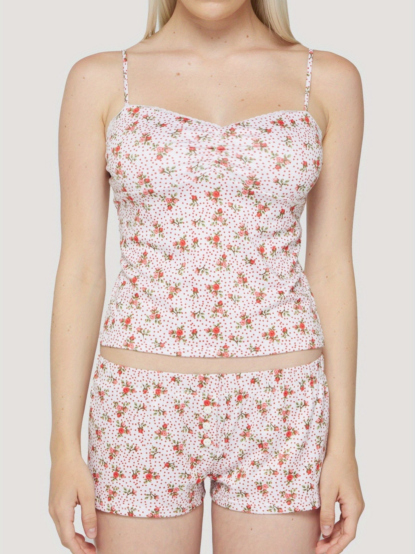 Women's pyjama set with halter neck, backless and matching shorts; floral and polka dot print. 95% polyester, 5% elastane, smooth to the touch, very soft, perfect for days spent at home, nights spent sleeping.