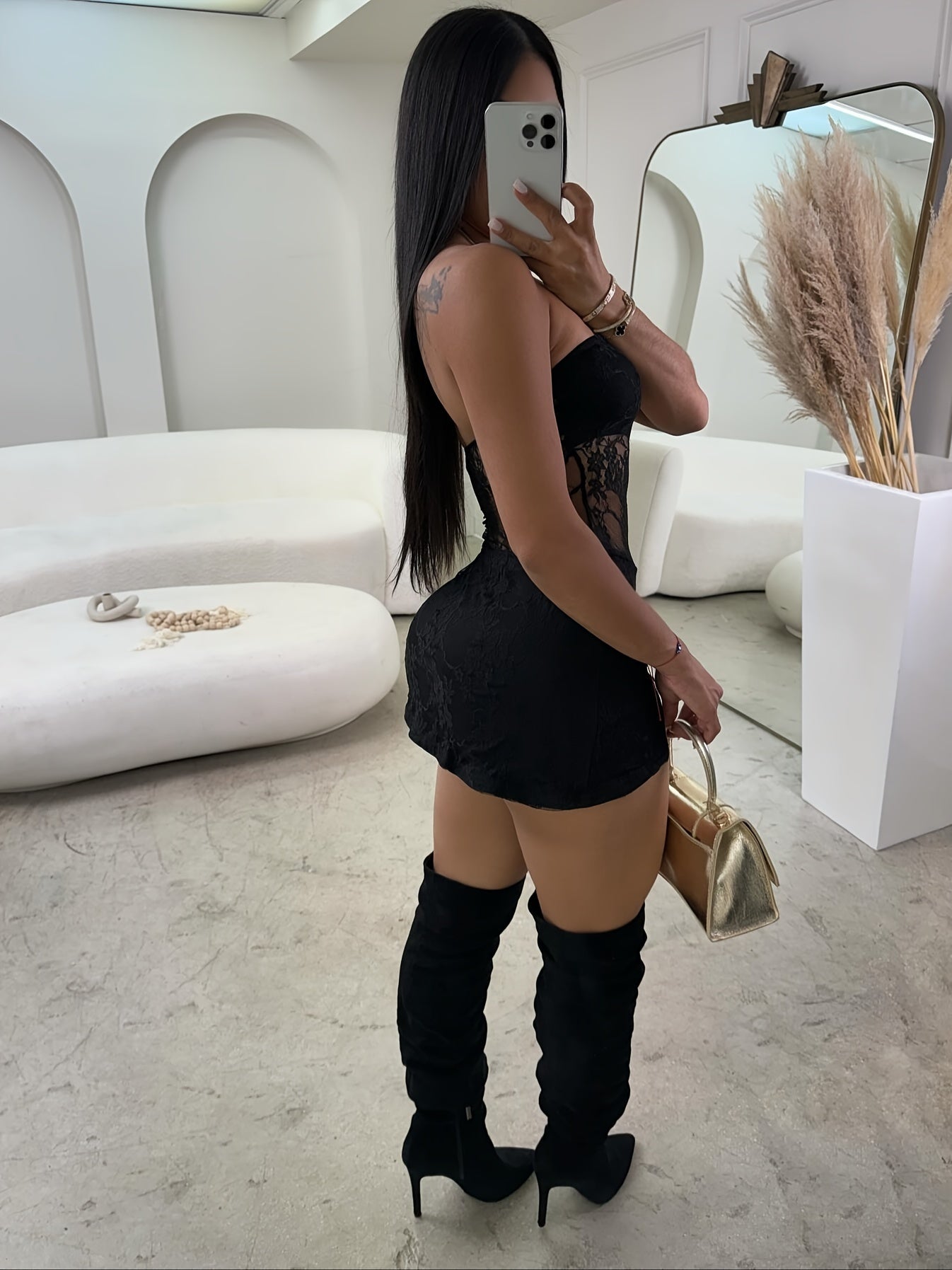 Women'S Sexy Strapless Hollow-Out Sheer Mini Dress, Bodycon Knit Polyester (95%) with Elastane (5%), Sleeveless Solid Color, All-Season Knit Fabric, 180g/m² - Elegant Party Attire