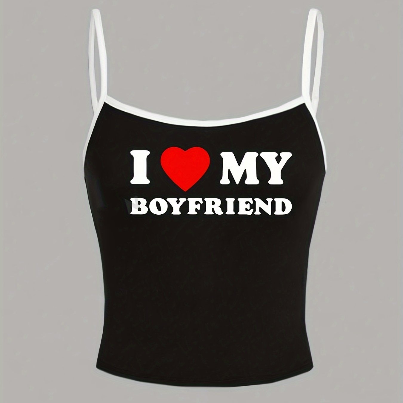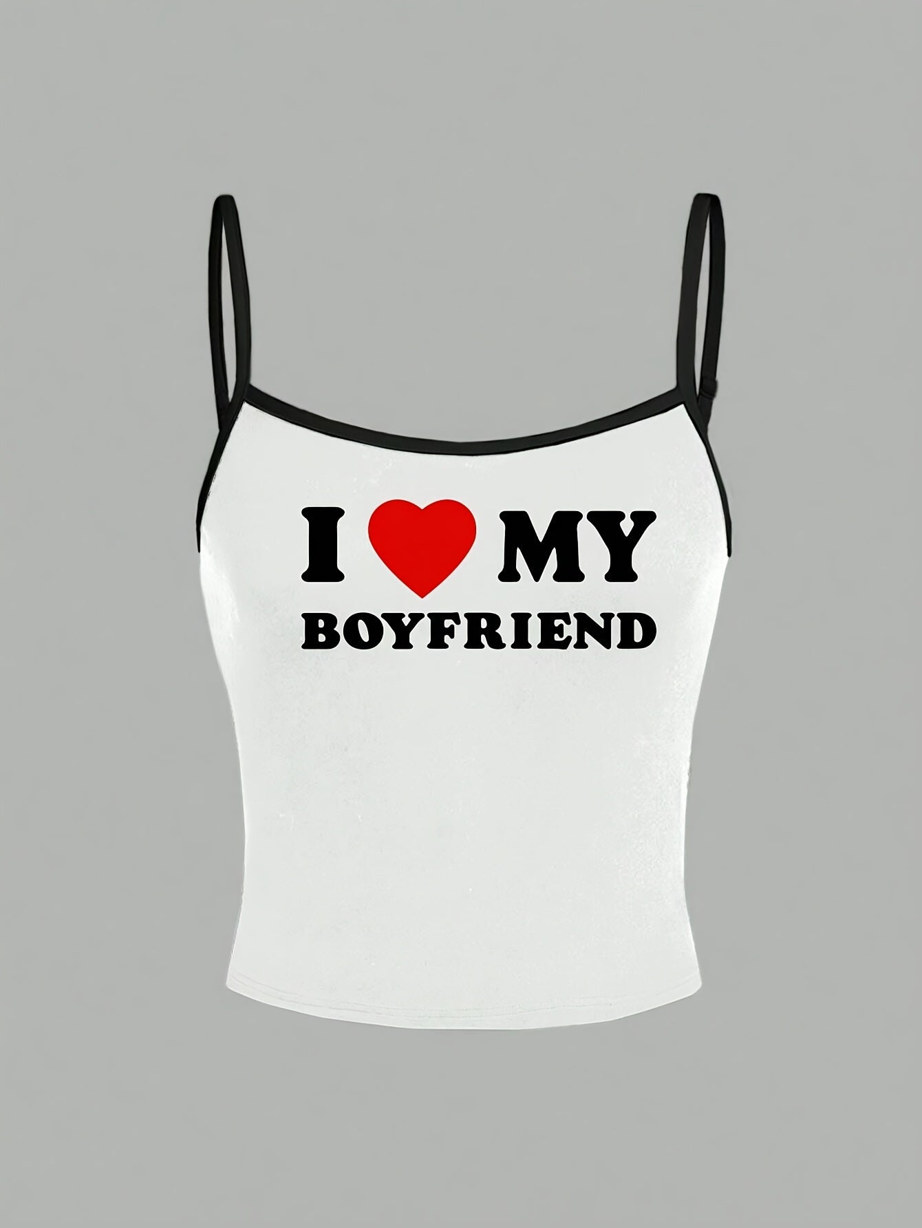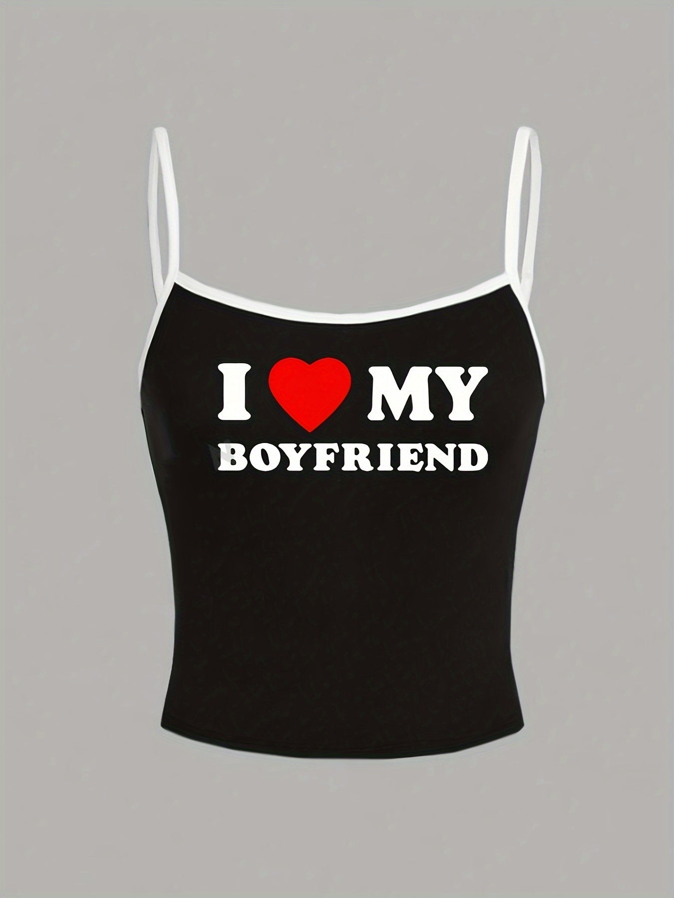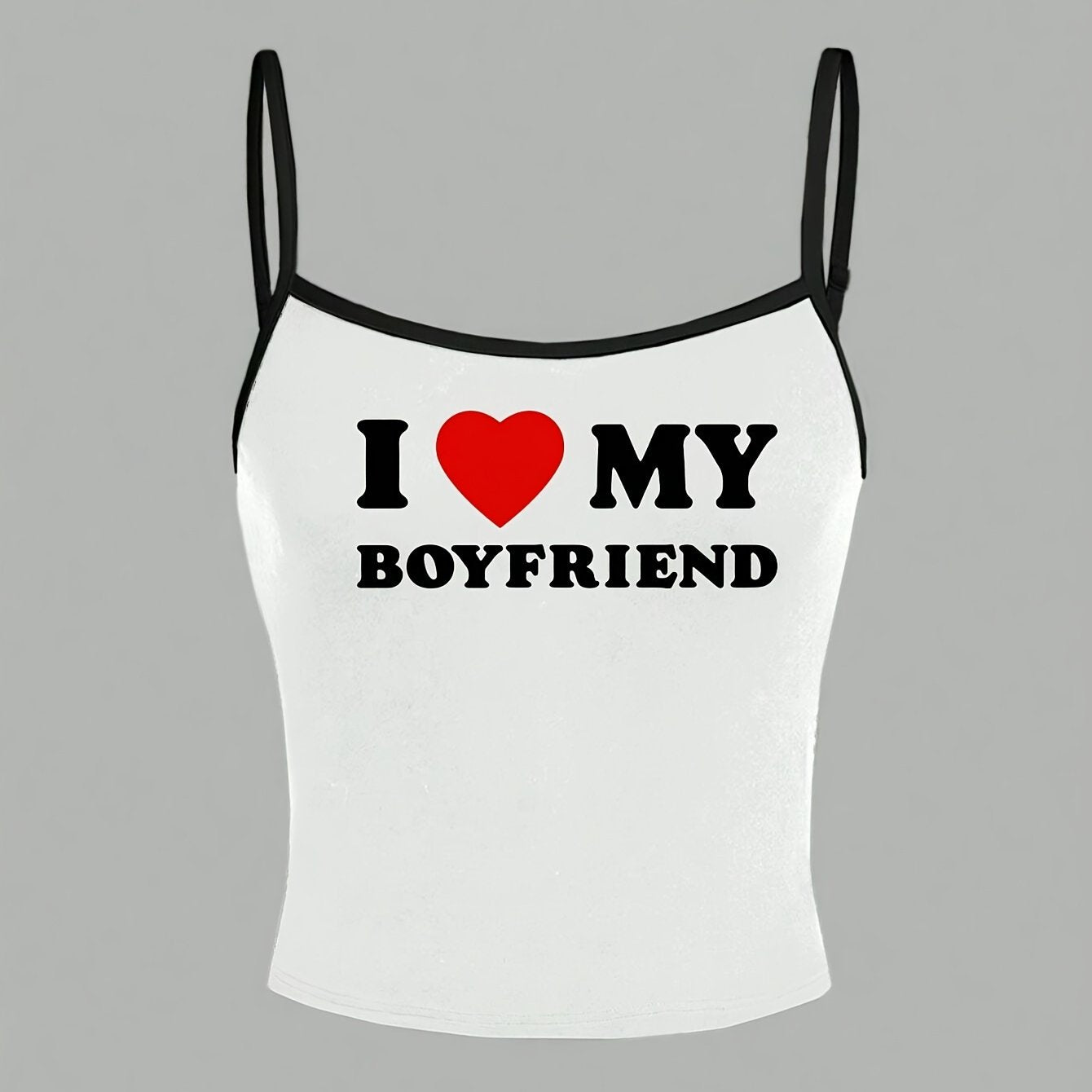 Y2K-Inspired "I Love My Boyfriend" Tank Top - White with Black Straps, Heart Graphic, Casual All-Season Top for Women, Casual Wear|Playful Graphic Top|Comfortable Strap Design, Y2K Tank Tops