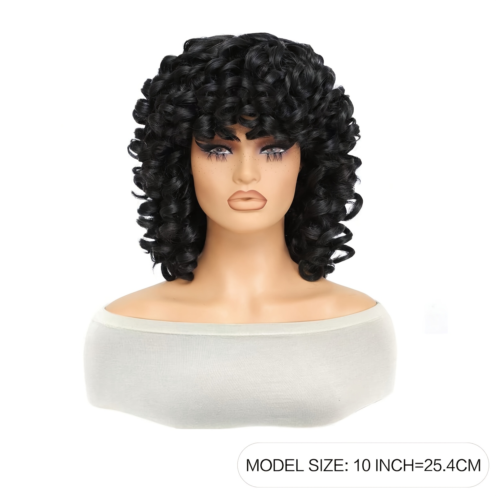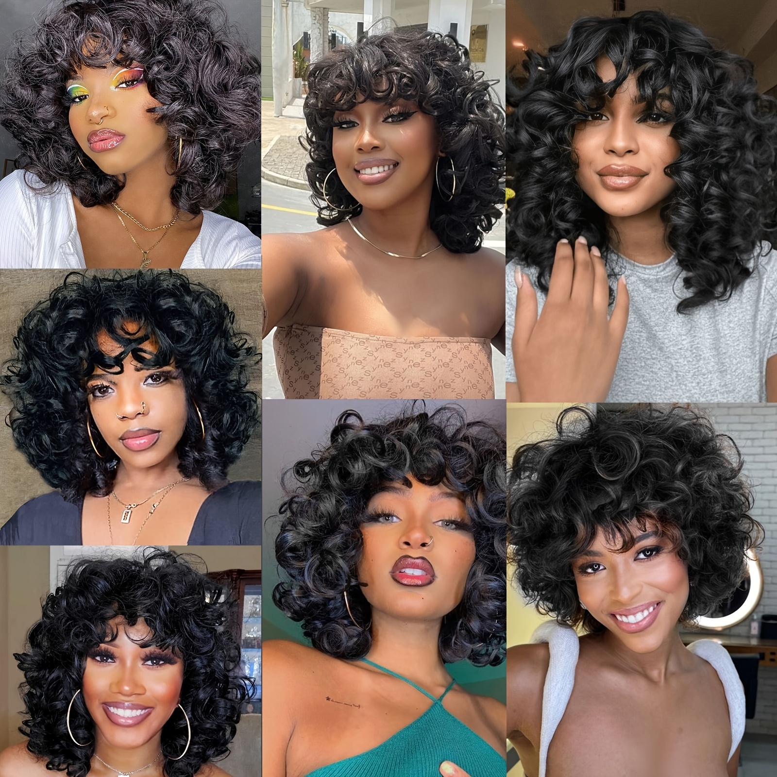 10 Inch Brazilian Virgin Human Hair Wig with Bangs - Glueless Loose Curly 200% Density Rose Net Cap Black Natural Wave Wig for, Daily Wear & Special Occasions, Highdensity Hairpiece