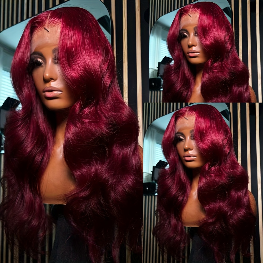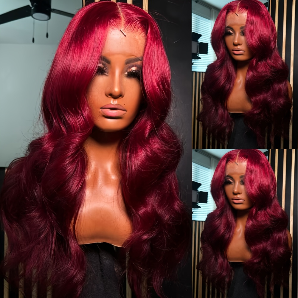 13x6 Inch Glueless Lace Front Wig for Women - Heat Resistant Synthetic Hair, Deep Part Space Burgundy Red Body Wave Loose Curly Wavy Wig with Preplucked Hairline, 200% Density for Daily & Party Use