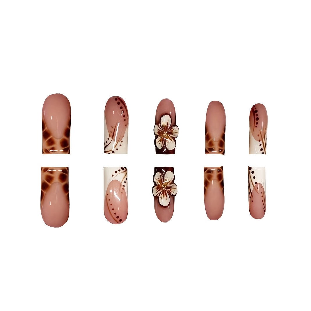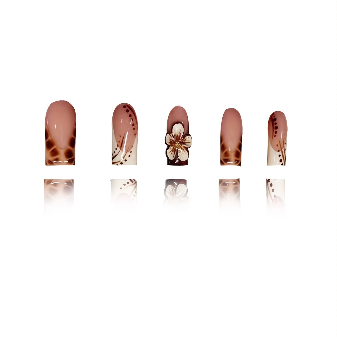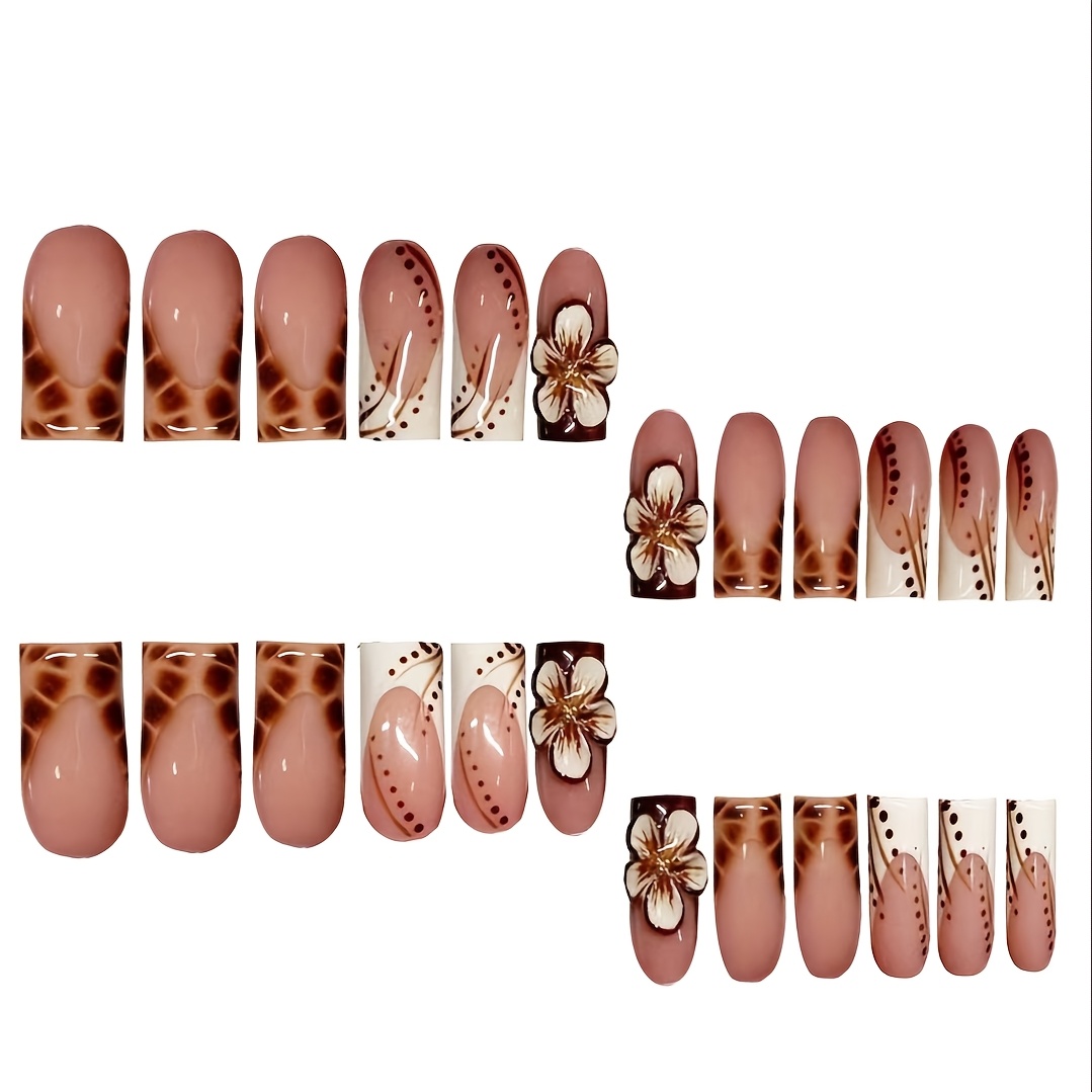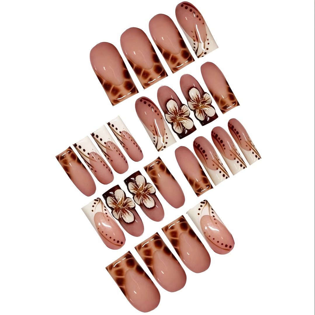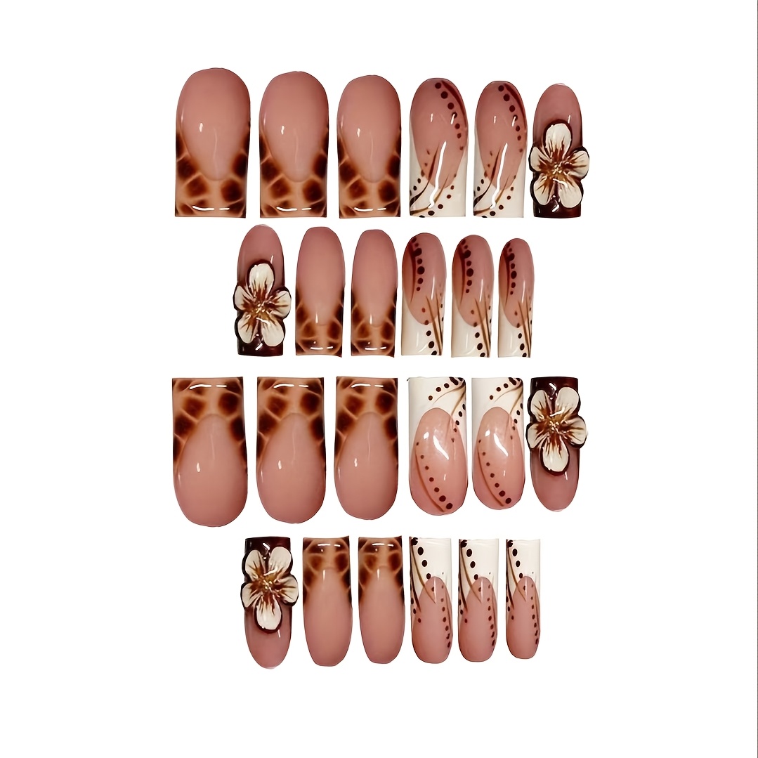 24pcs Press On Nails Set, Full Cover Medium Length, Leopard Print & Colorblock Design, Glossy Finish, with 3D Floral Accents, Includes Nail File and Jelly Glue