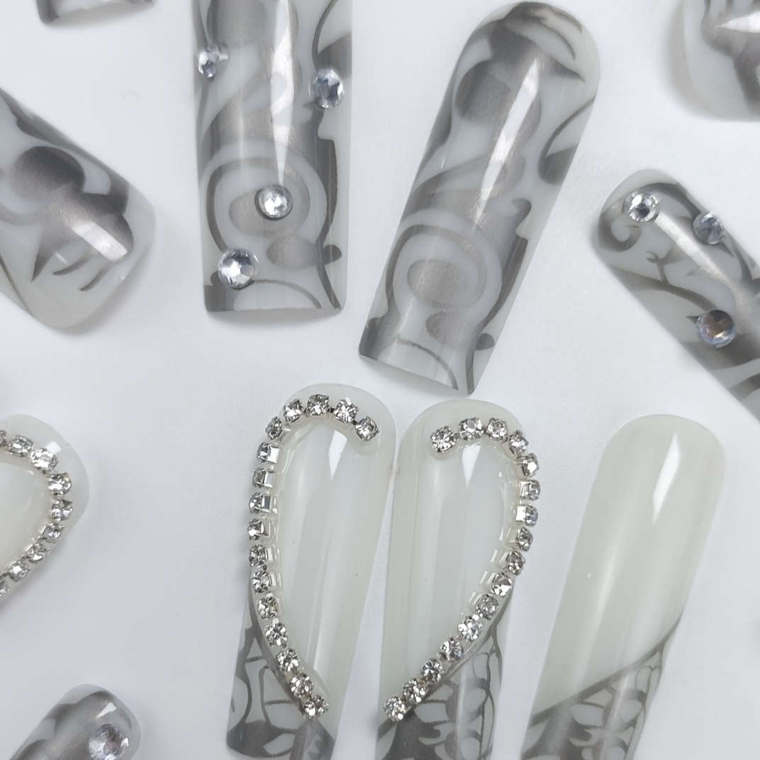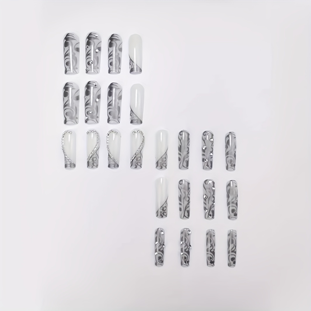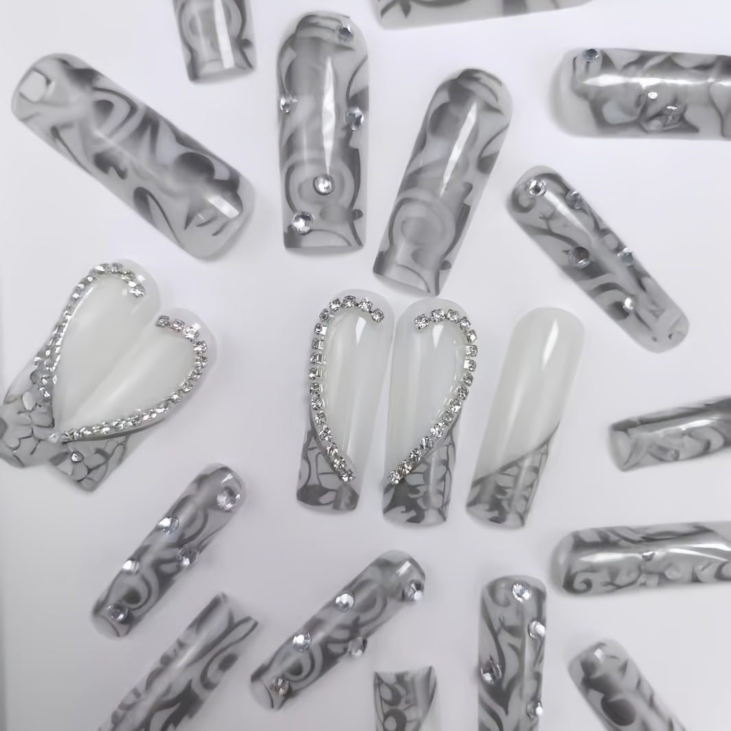 3boxs European And American Style Nail Plate with Glitter, Long Square, Black, French Style Nail Art, Three-dimensional Heart-shaped Broken Glitter, Wearable Nail