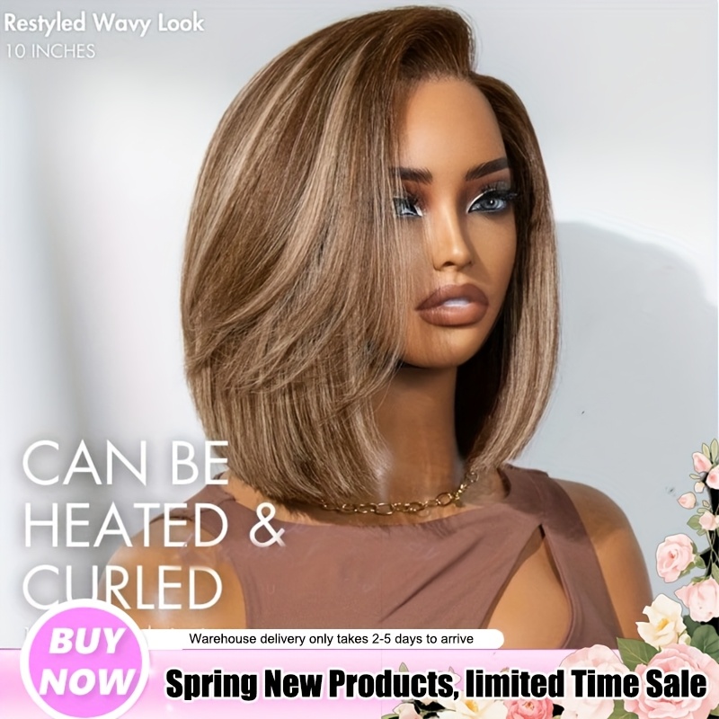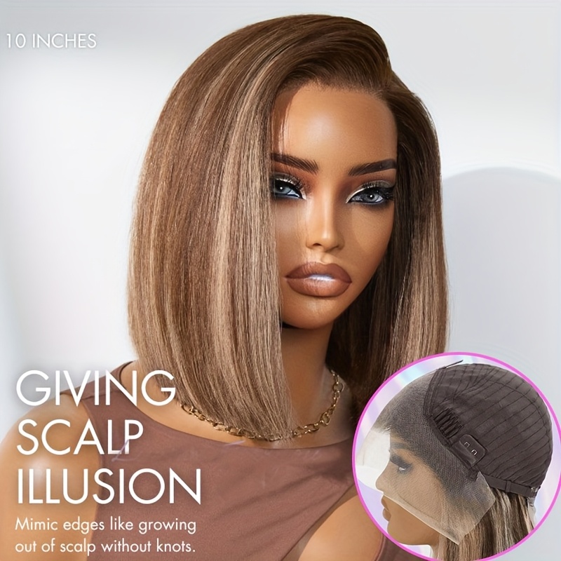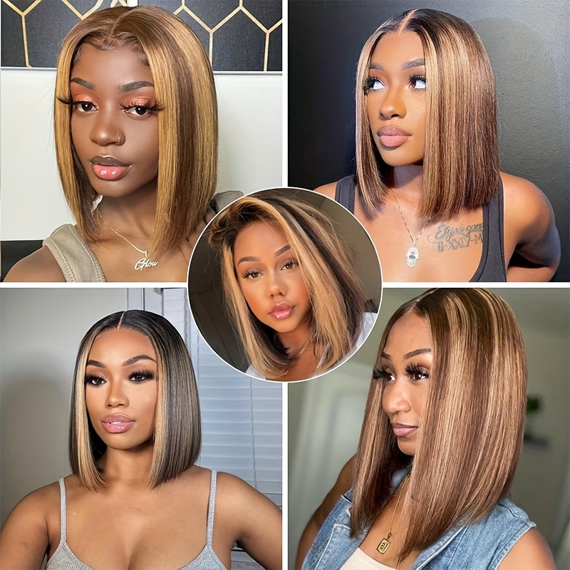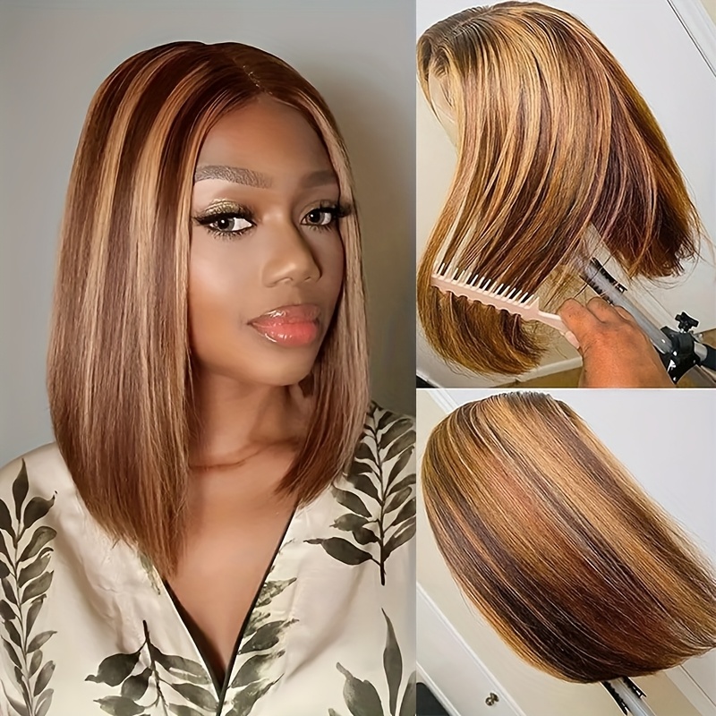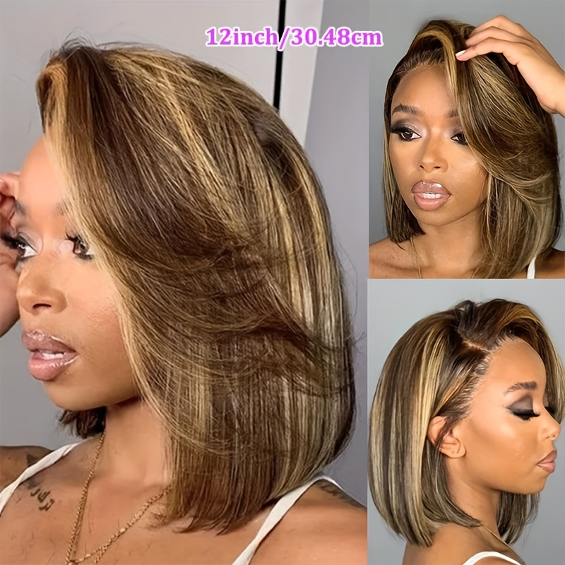 4/27 Highlight Ombre Straight Short Bob Lace Front Wig - 220% Density Human Hair with HD Transparent Lace Closure & Pre-Plucked Baby Hair, Honey Blonde to Dark Brown Gradient - Elegant Style for Women, Perfect for Parties, We