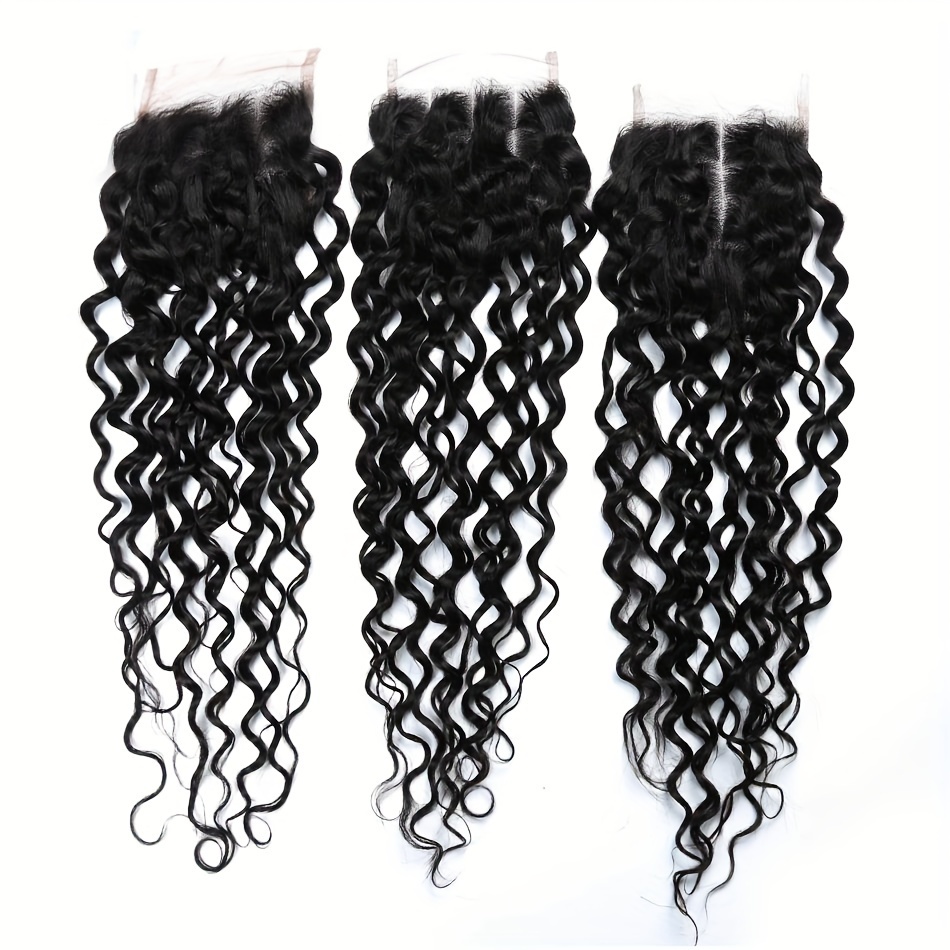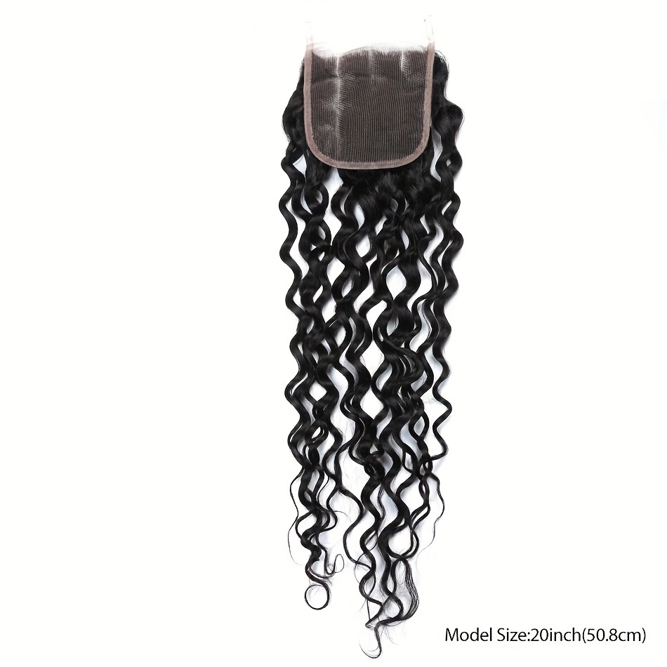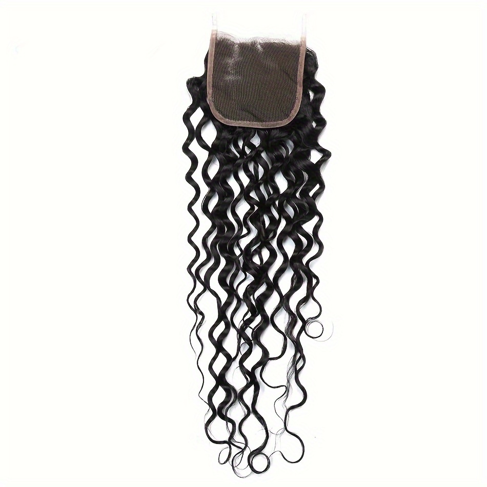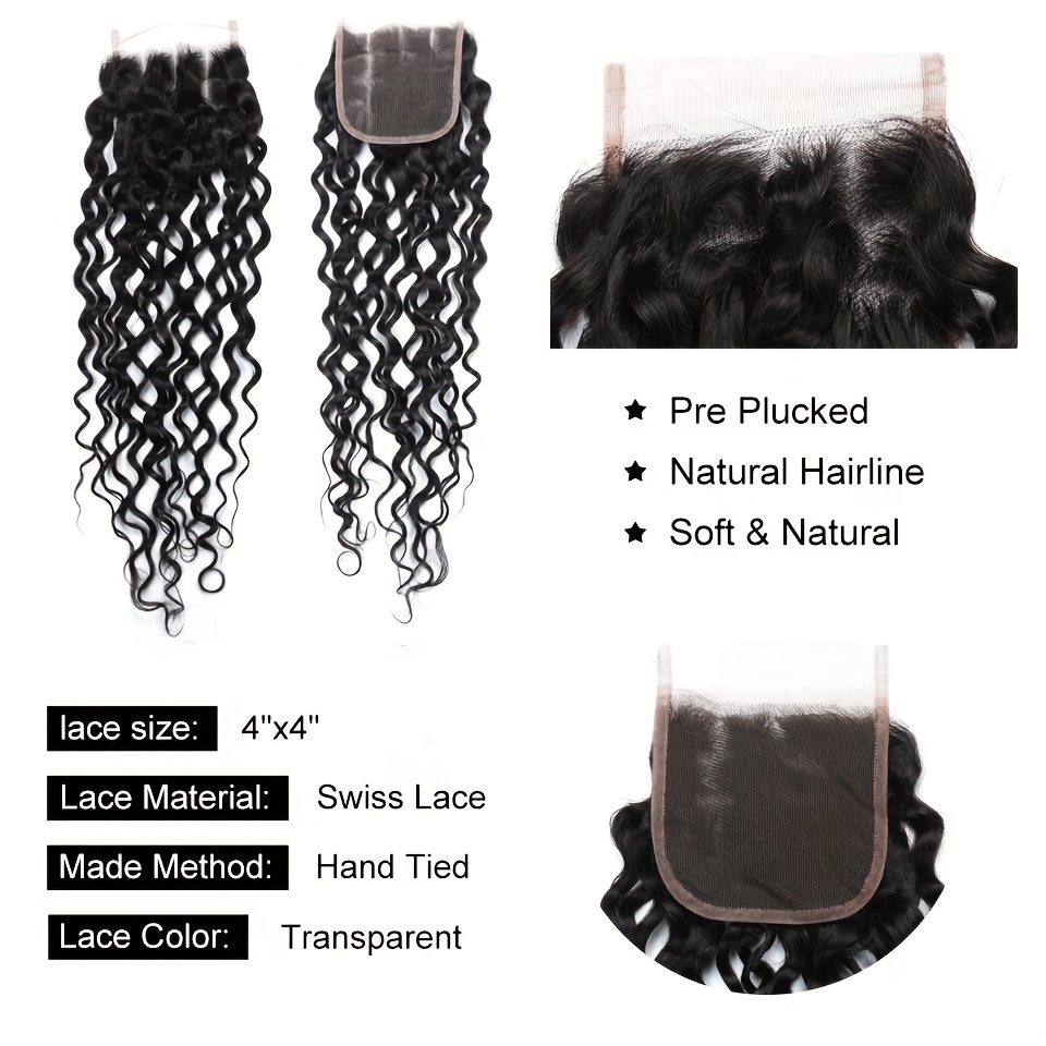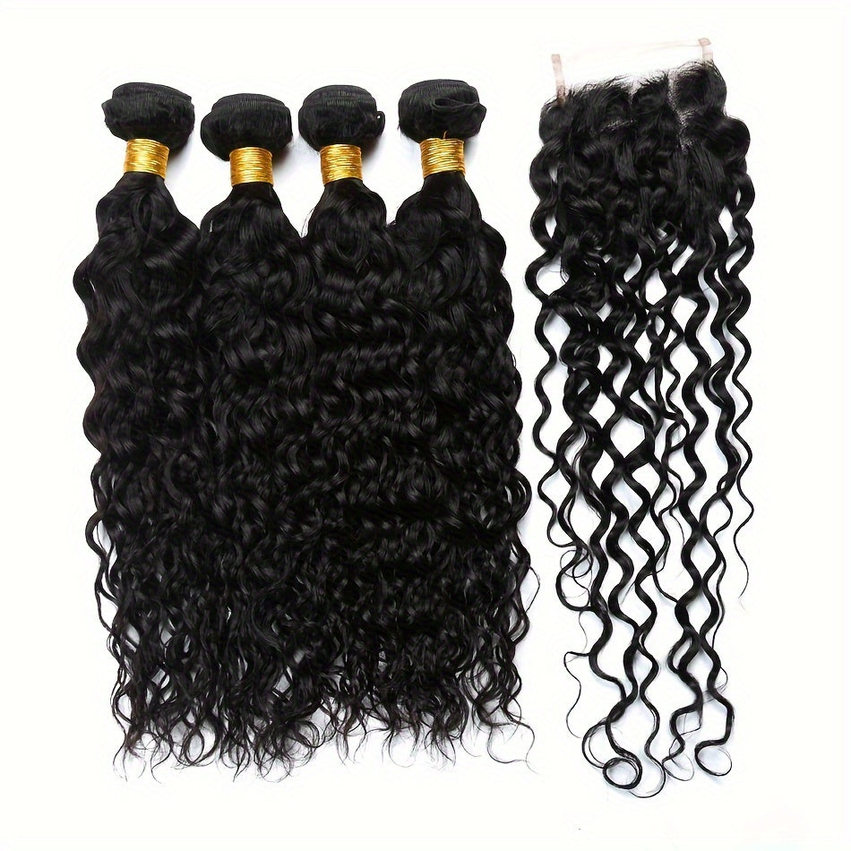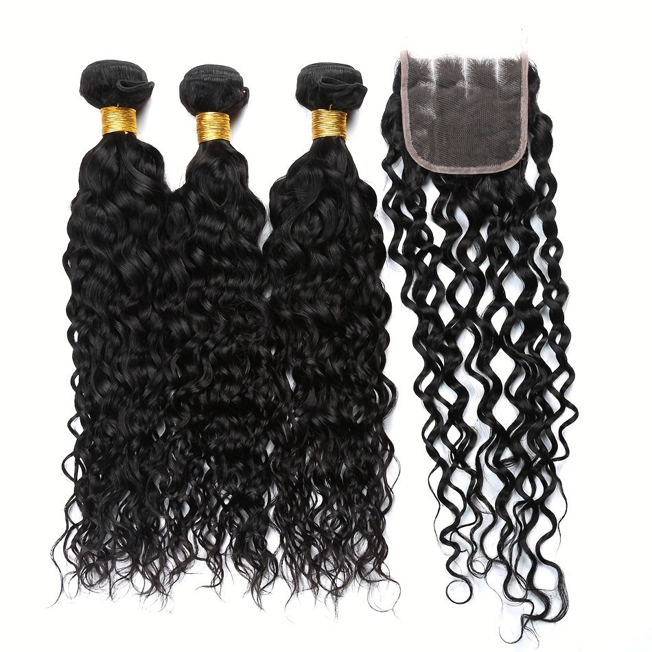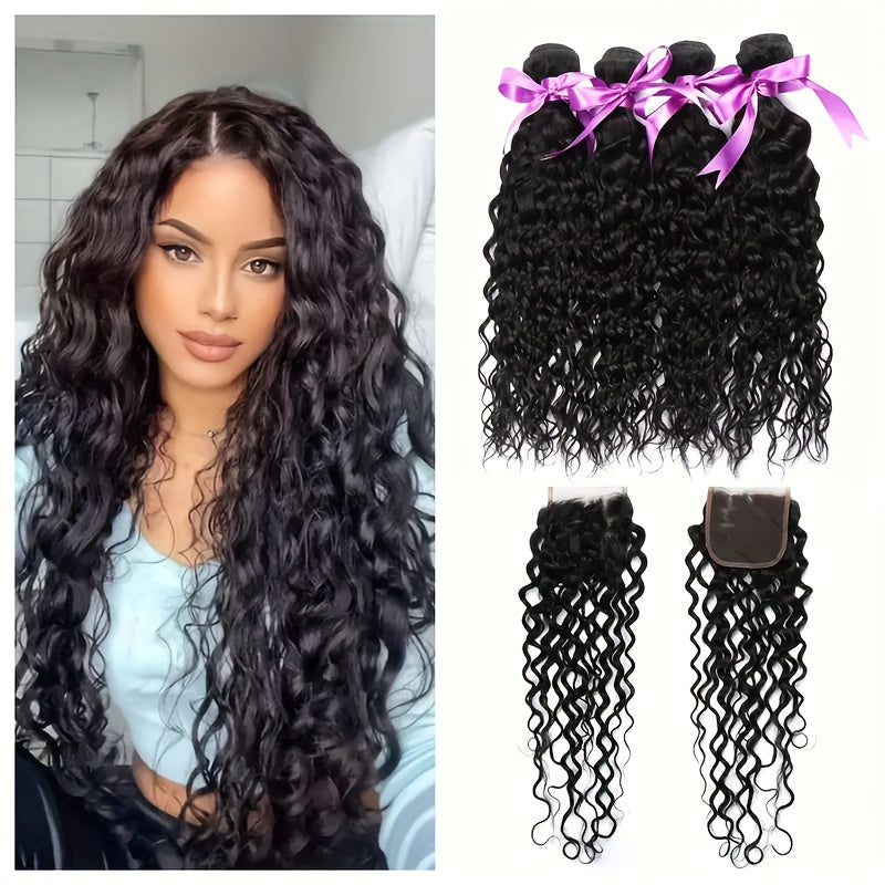 4 Bundles Water Wave Human Hair with 4x4 Lace Closure - 100% Virgin Remy Hair, Unprocessed Curly Wet and Wavy Weave for Natural Look, Includes Frontal Closure, Perfect for All Ethnicities