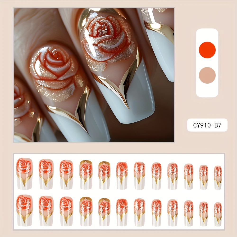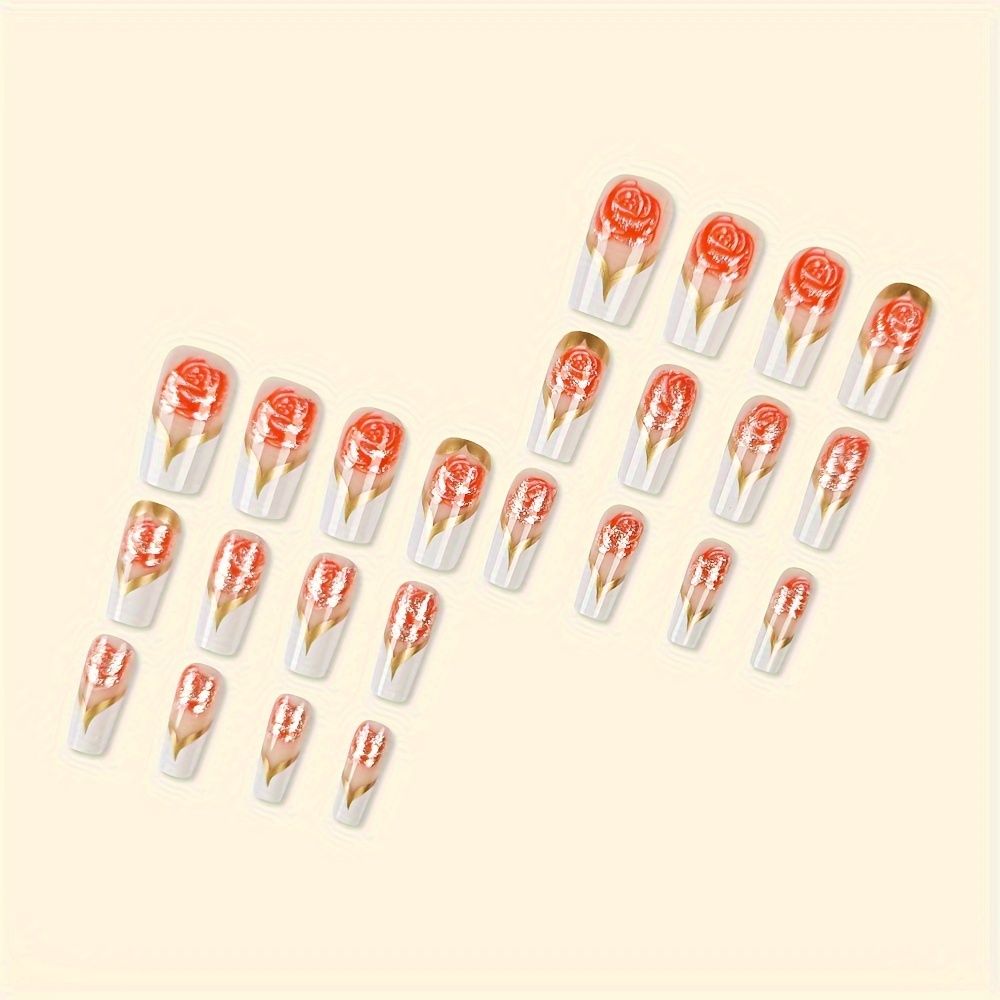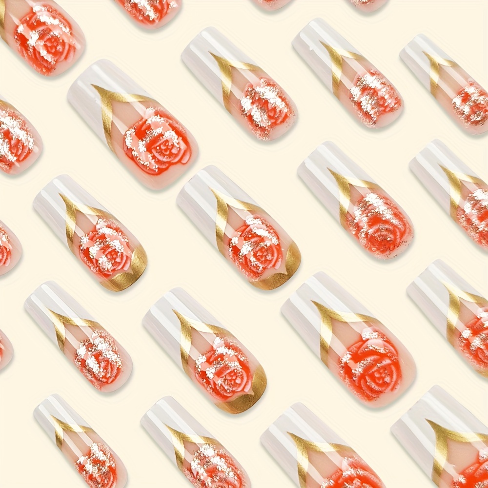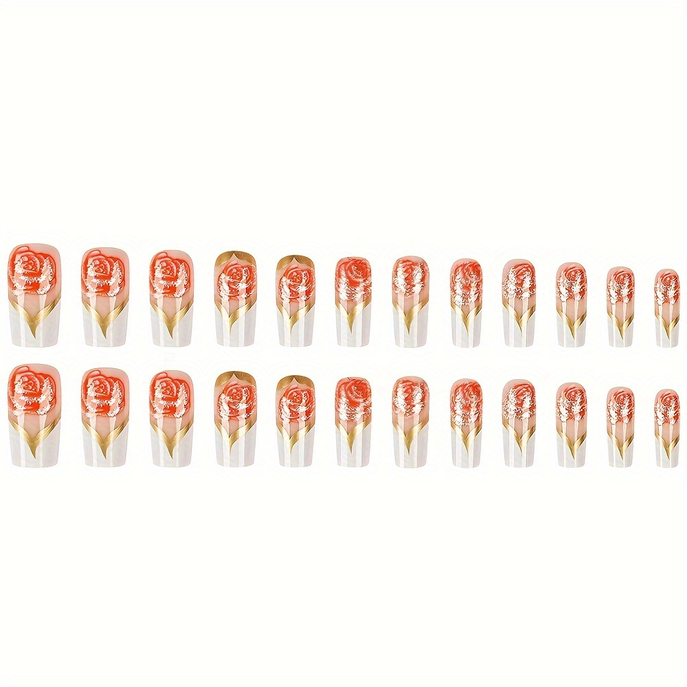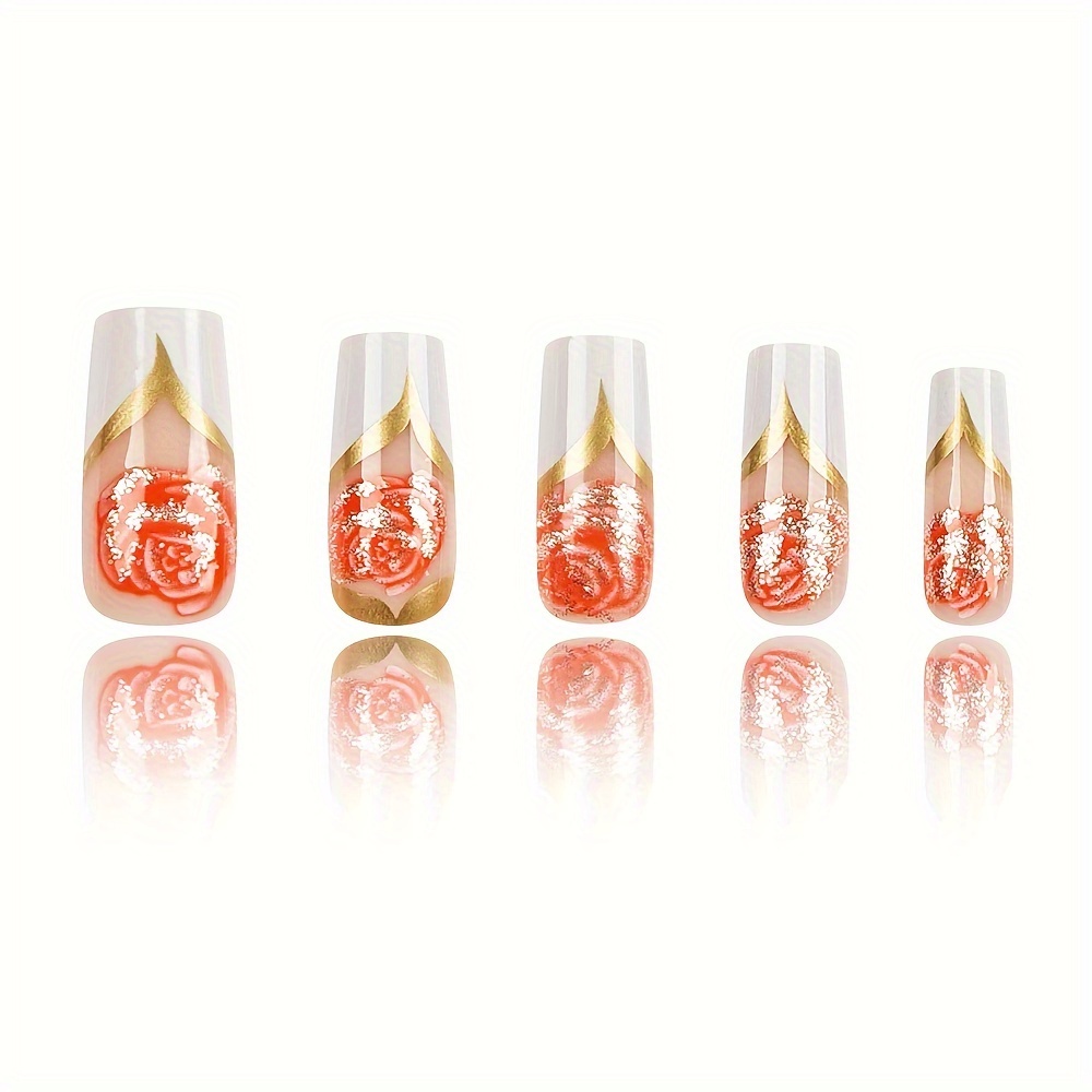 48pcs Bright Ballet Wind Pressure Acrylic Nails, Pink Flowers And Golden Stripe Design-Reusable, Ladies' Shiny Fake Nails Is Suitable As a Beautiful Gift for Each Other on Valentine'S Day.