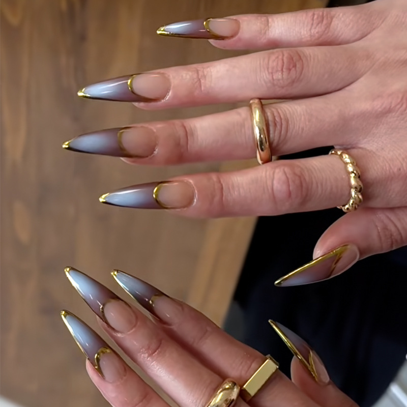 96 PCS 4PACK Long Stiletto Glossy Rhinestone Press on Nails with Glue, Bling Glitter French Tip Acrylic Almond Artificial Nails in Nude Pink Stick on False Nails with Design
