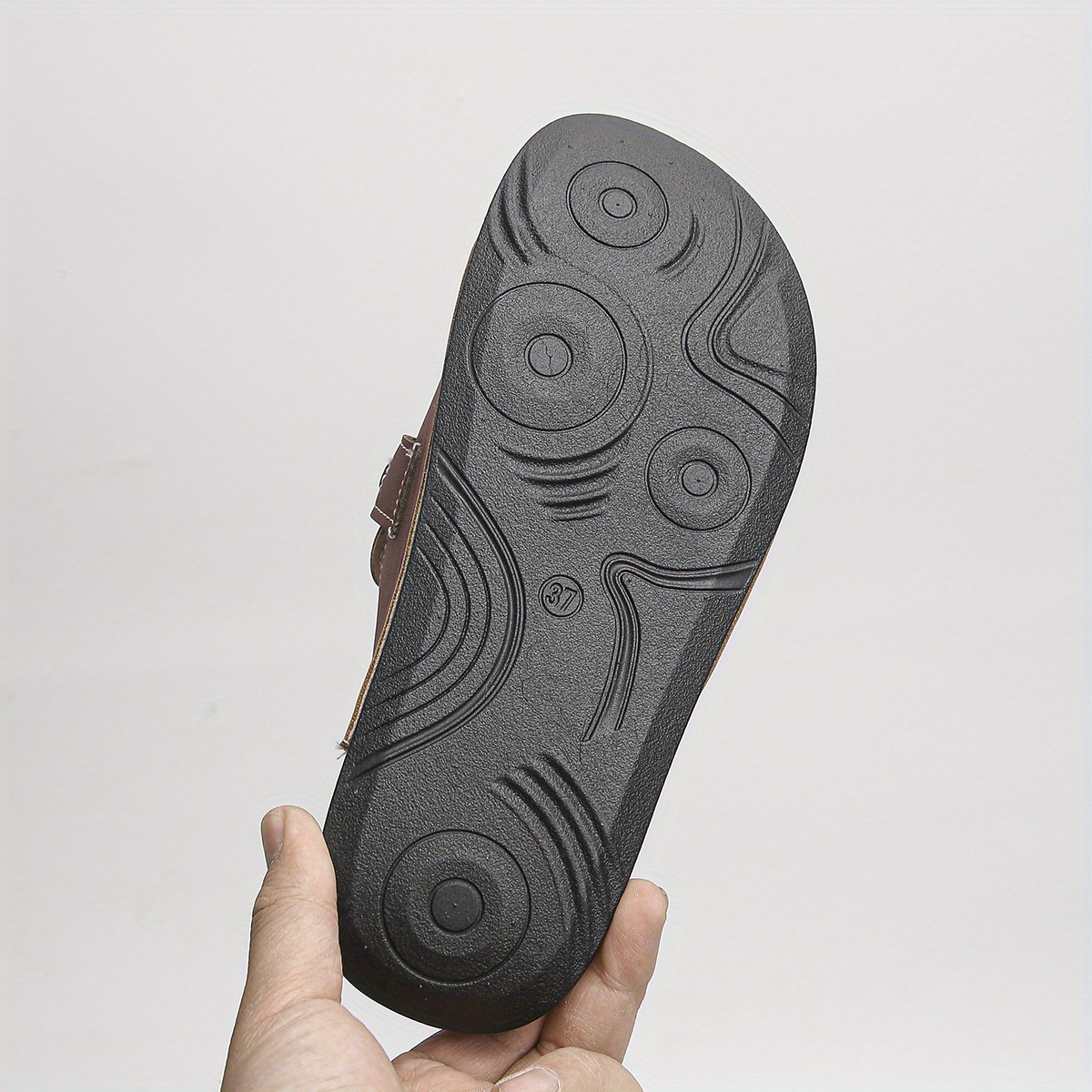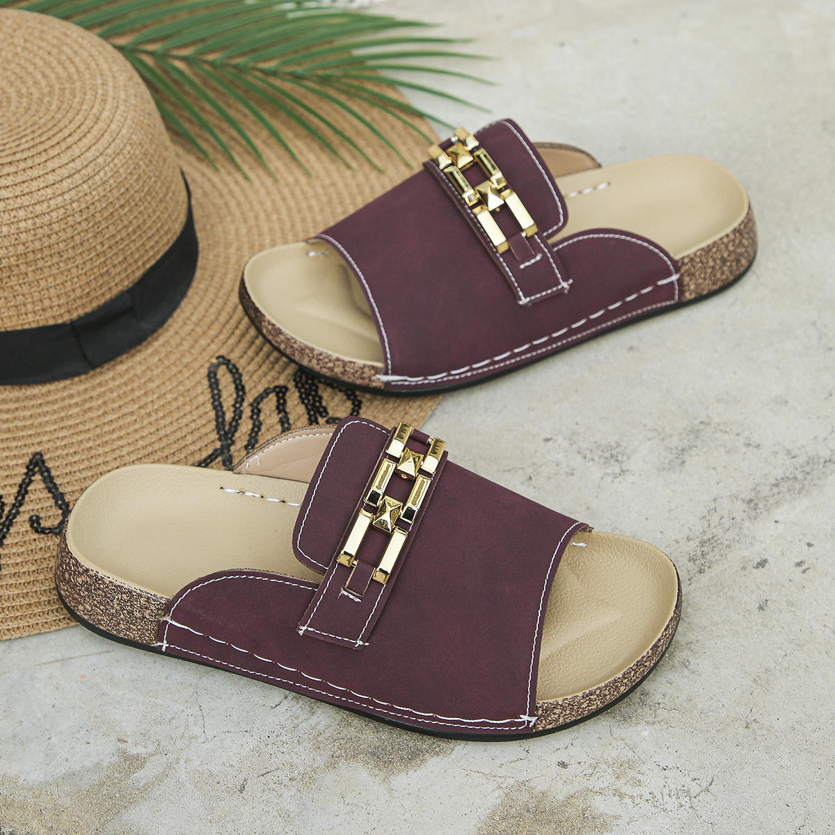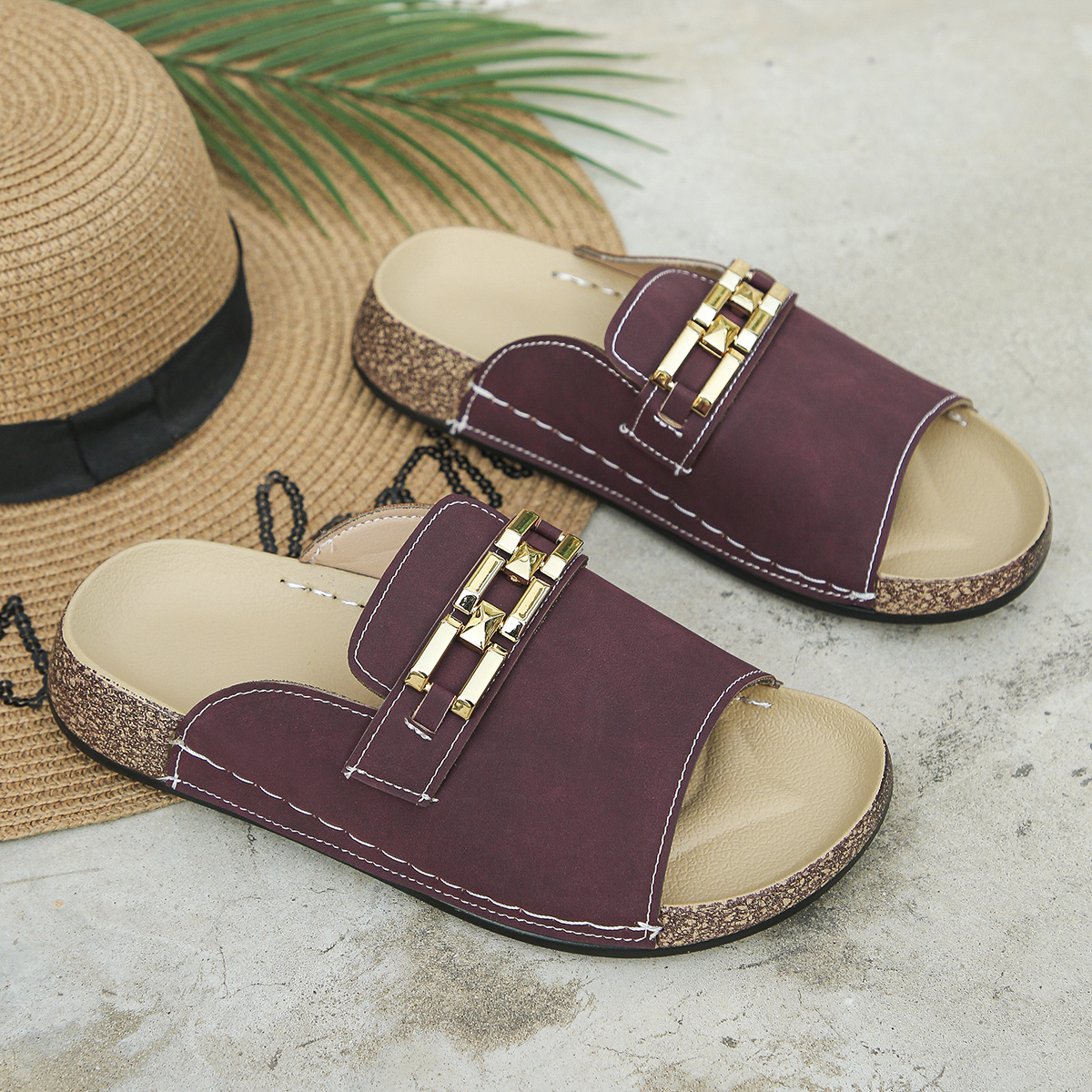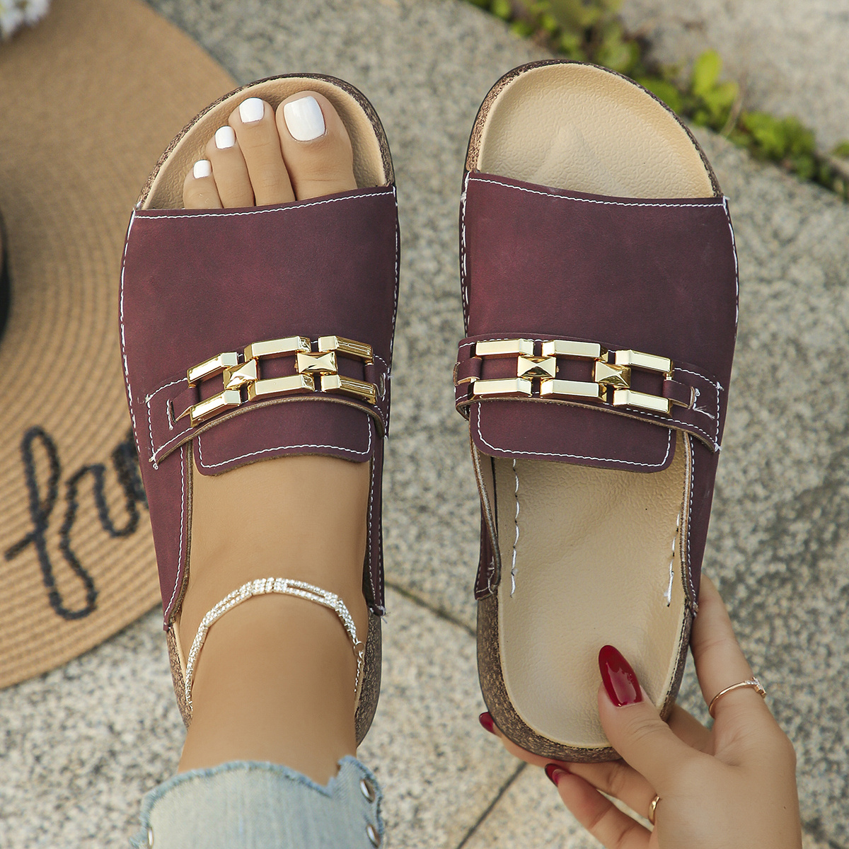 Foreign Trade Large Size Women's Soft Sole Slippers New Summer Fashion Casual Wine Red Square Buckle Chain Open Toe Thick Bottom Sandals Daily Outdoor Beach Lightweight Comfortable Slip-on Soft Sole Flip Flops