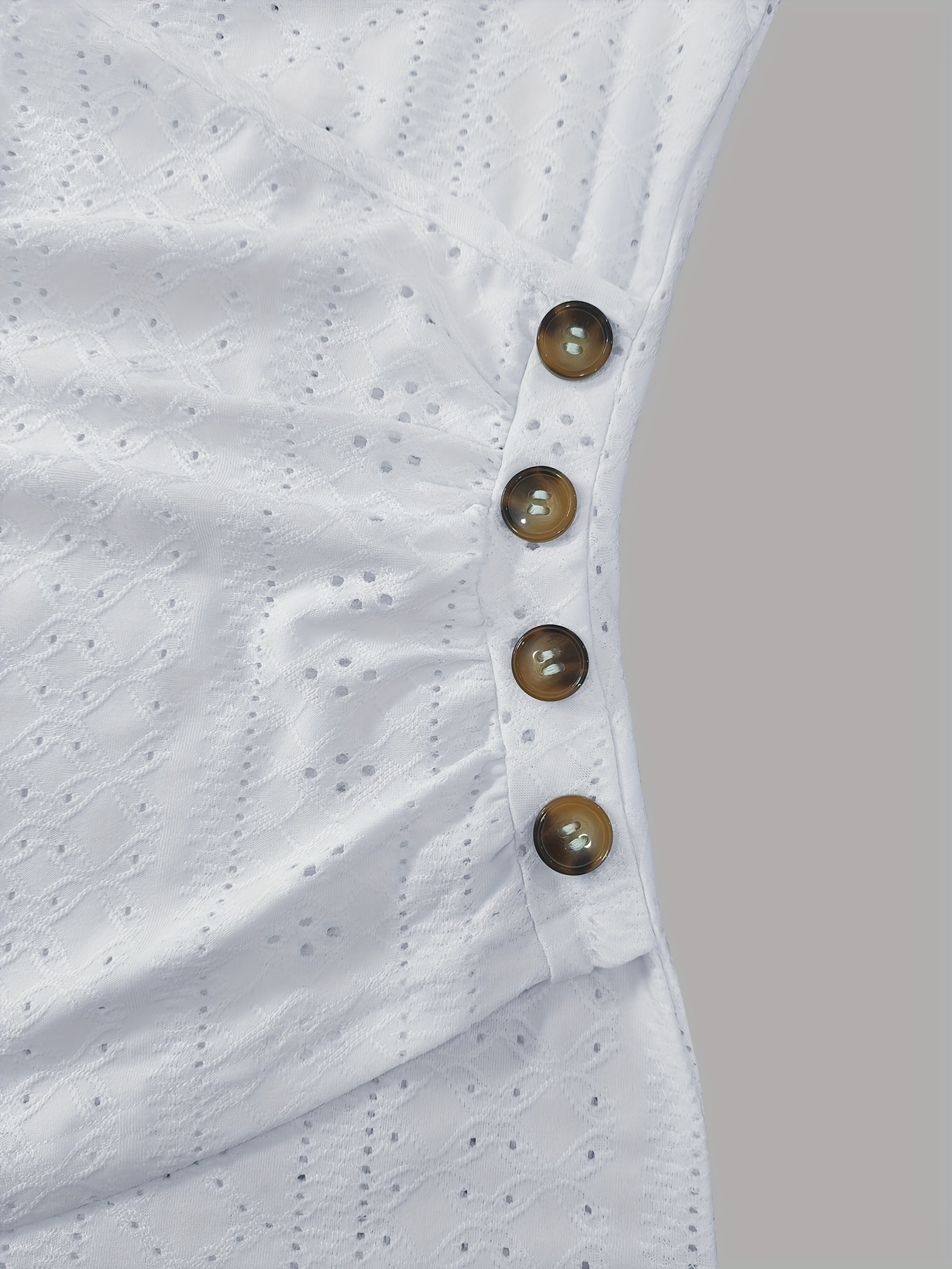 Women's Elegant Deep V-Neck Short Sleeve Blouse with Eyelet Detailing and Button Accents, Breathable Polyester for Spring/Summer, Perfect for Casual or Dressy Outfits, Ladies Blouses