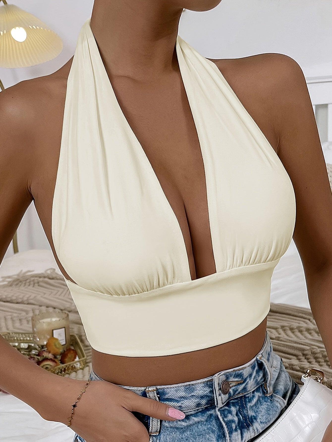 1pc Elegant Orange Halter Neck Backless Crop Top - High Stretch, Deep V-Neckline, Sleeveless Tank for Women, Perfect for Casual or Stylish Outfits, Casual Chic Top | Backless Dress | Stretchy Fabric
