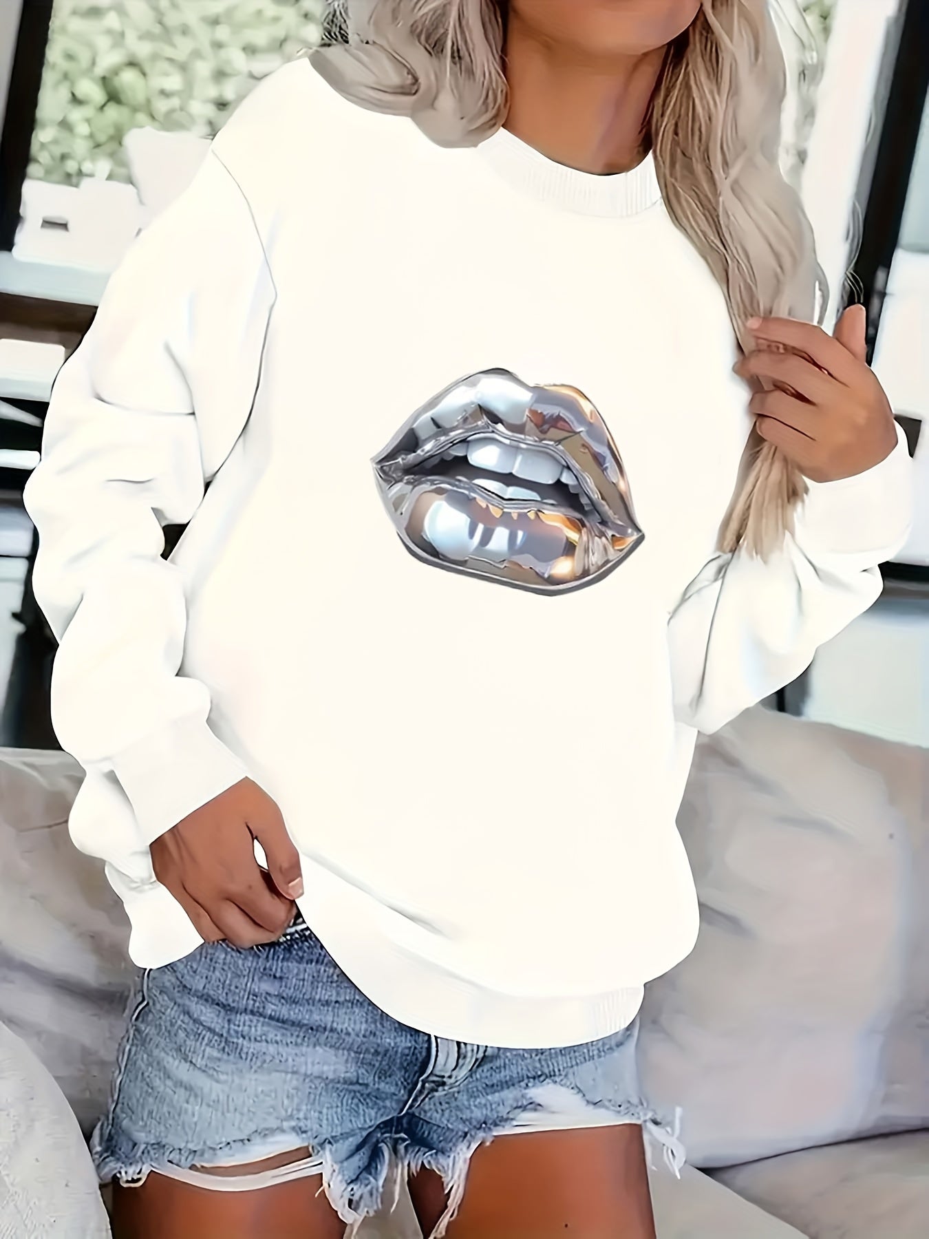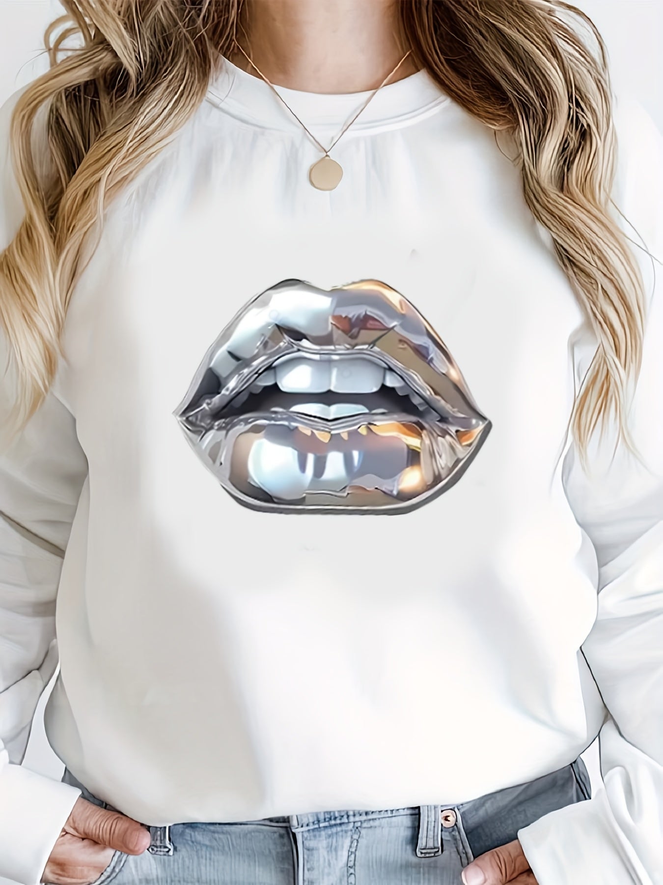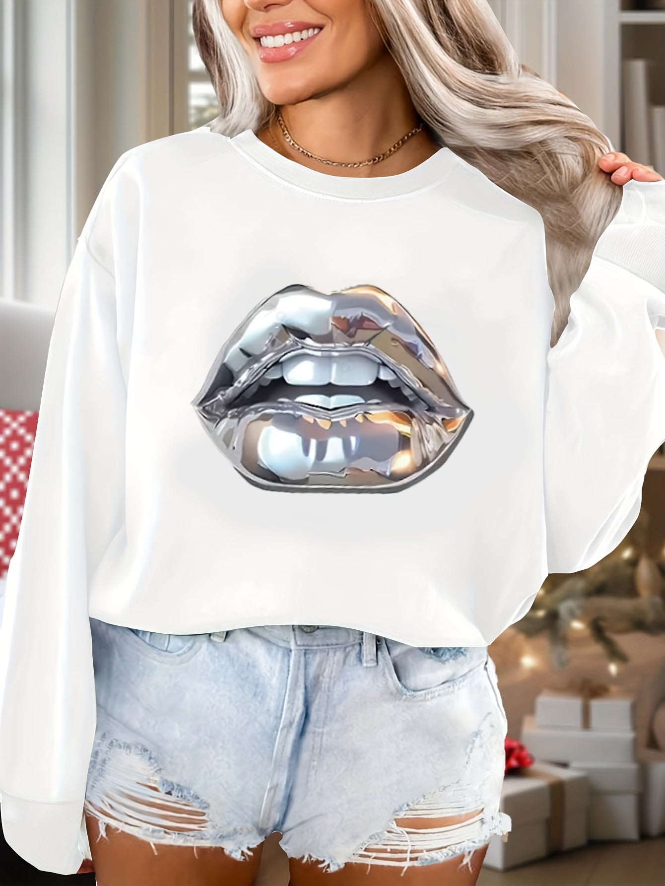 Women's Casual Crew Neck Sweatshirt with Geometric Lips Print, Long Sleeve Pullover, Knit Fabric, Regular Fit - 50%, Polyester 50% Blend, Machine Washable for Fall & Winter