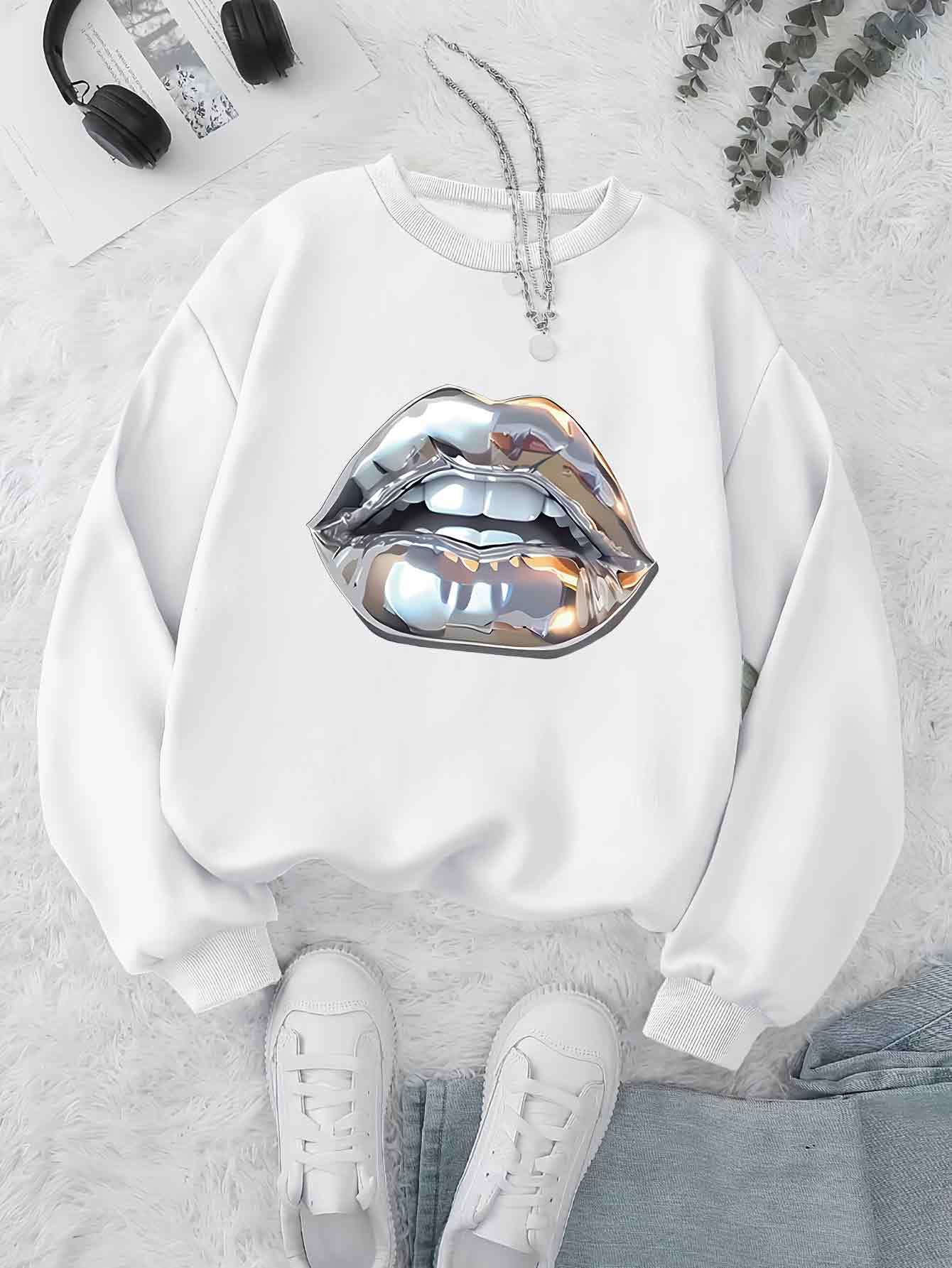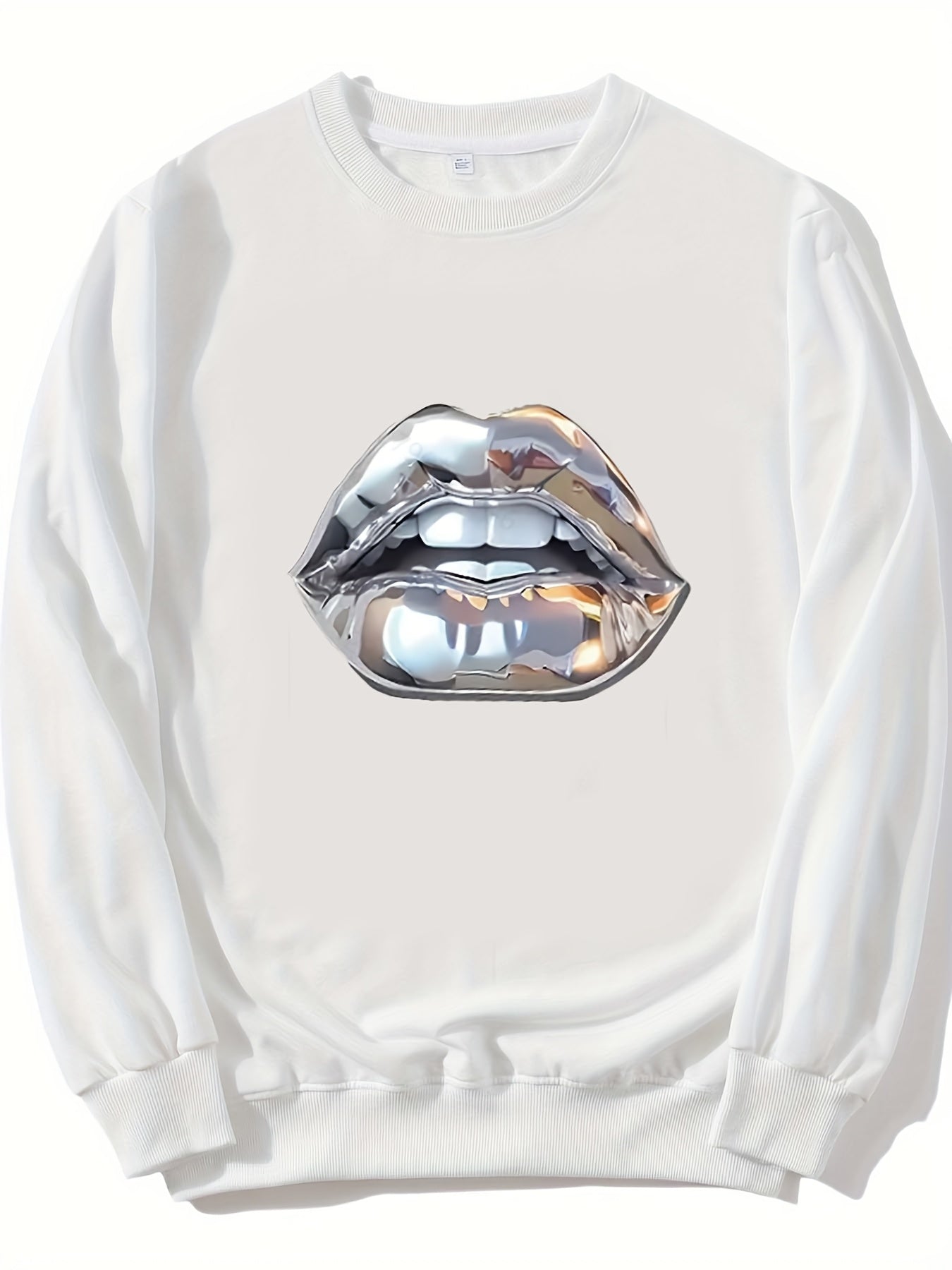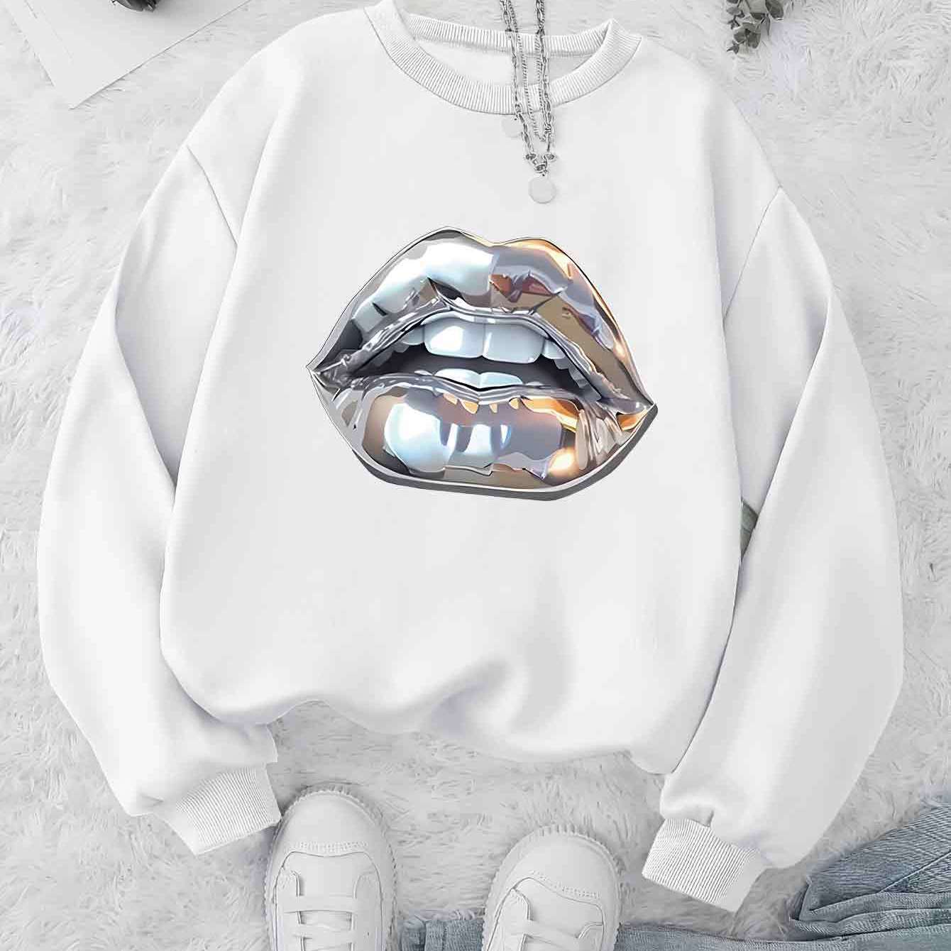 Women's Casual Crew Neck Sweatshirt with Geometric Lips Print, Long Sleeve Pullover, Knit Fabric, Regular Fit - 50%, Polyester 50% Blend, Machine Washable for Fall & Winter