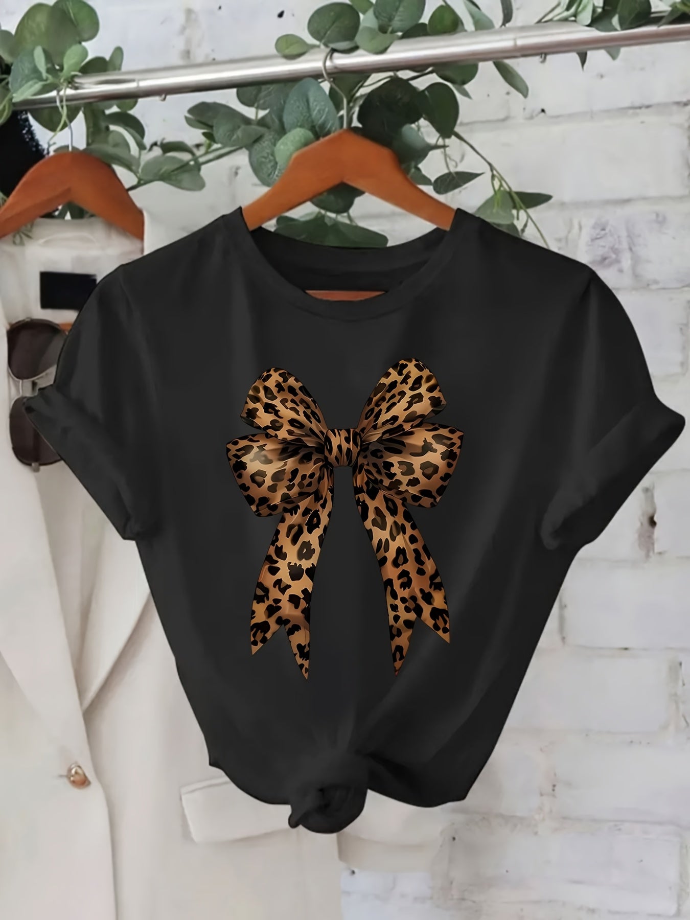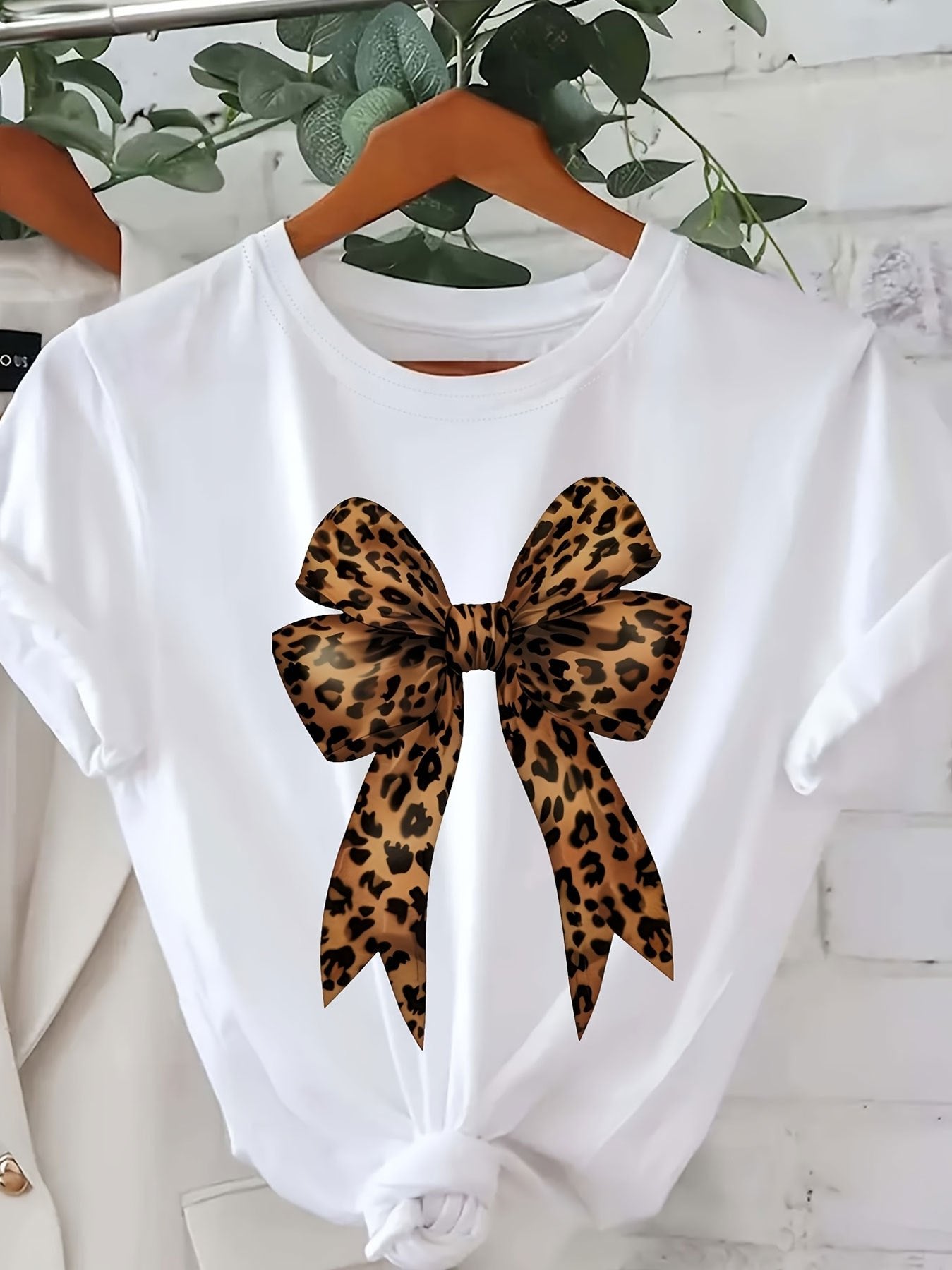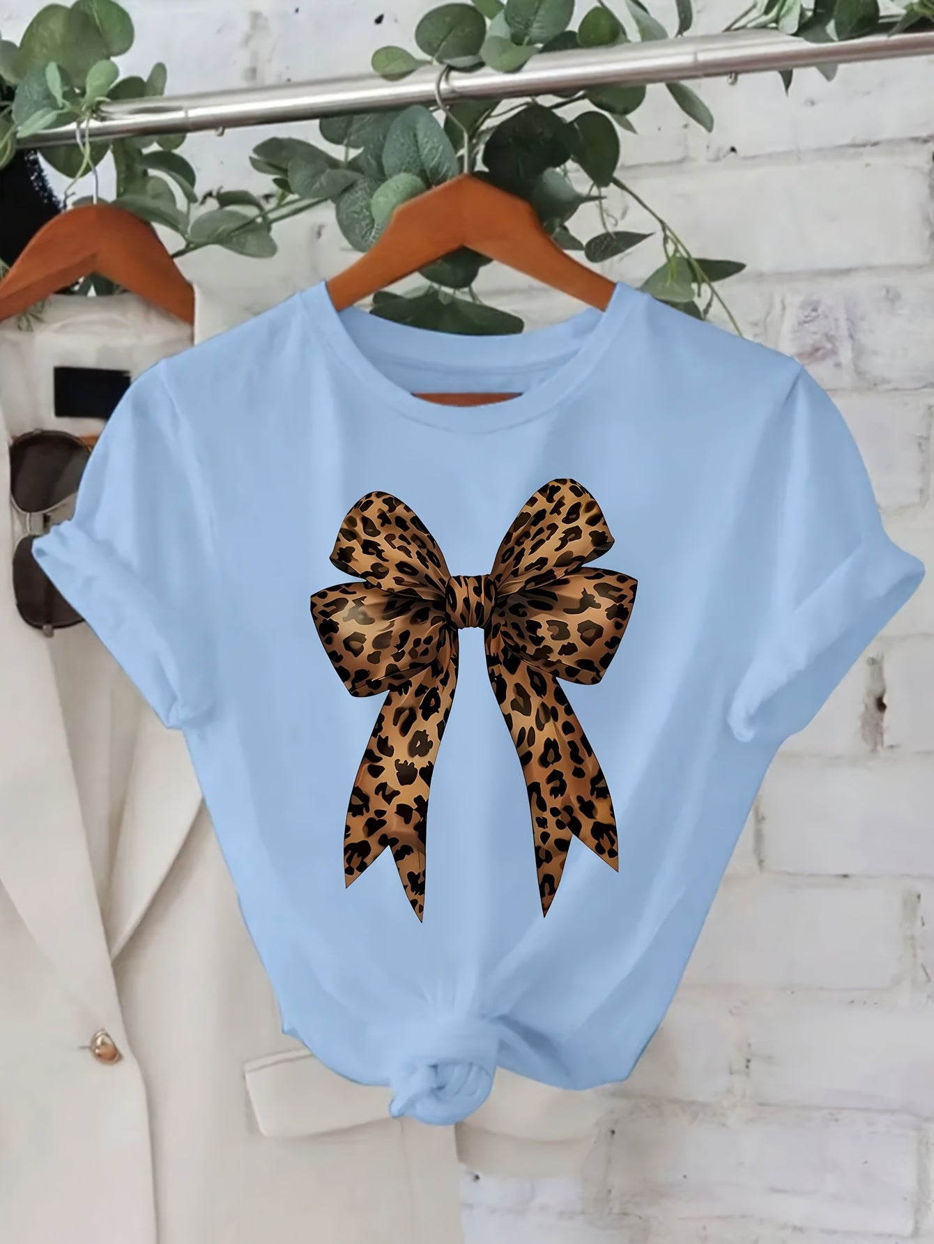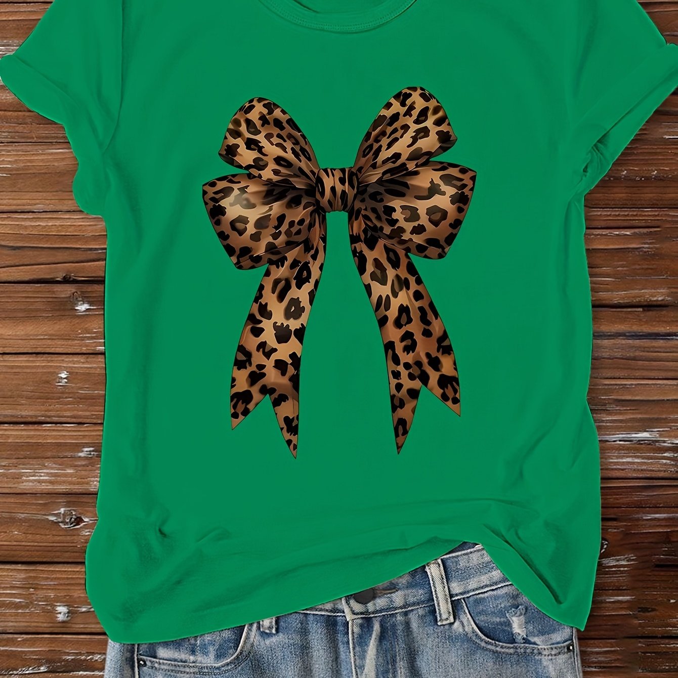 Women's Casual Leopard Print Bowknot T-Shirt - Short Sleeve, Round Neck, Soft & Comfortable Fabric, Perfect for Spring/Summer Fashion, Green Graphic Tee with Stylish Bow Design, Casual Wear | Playful Graphic Tee | Stylish Gra