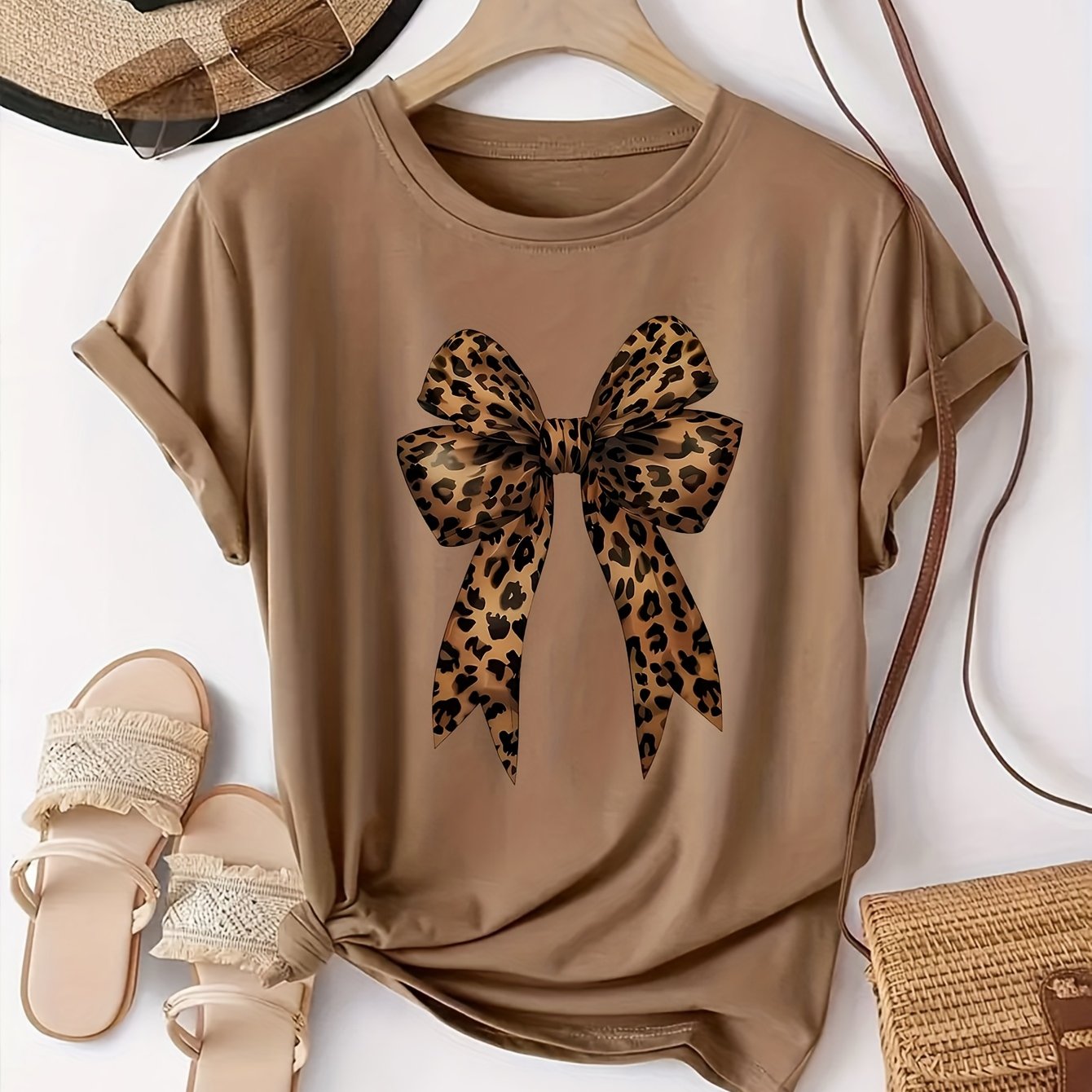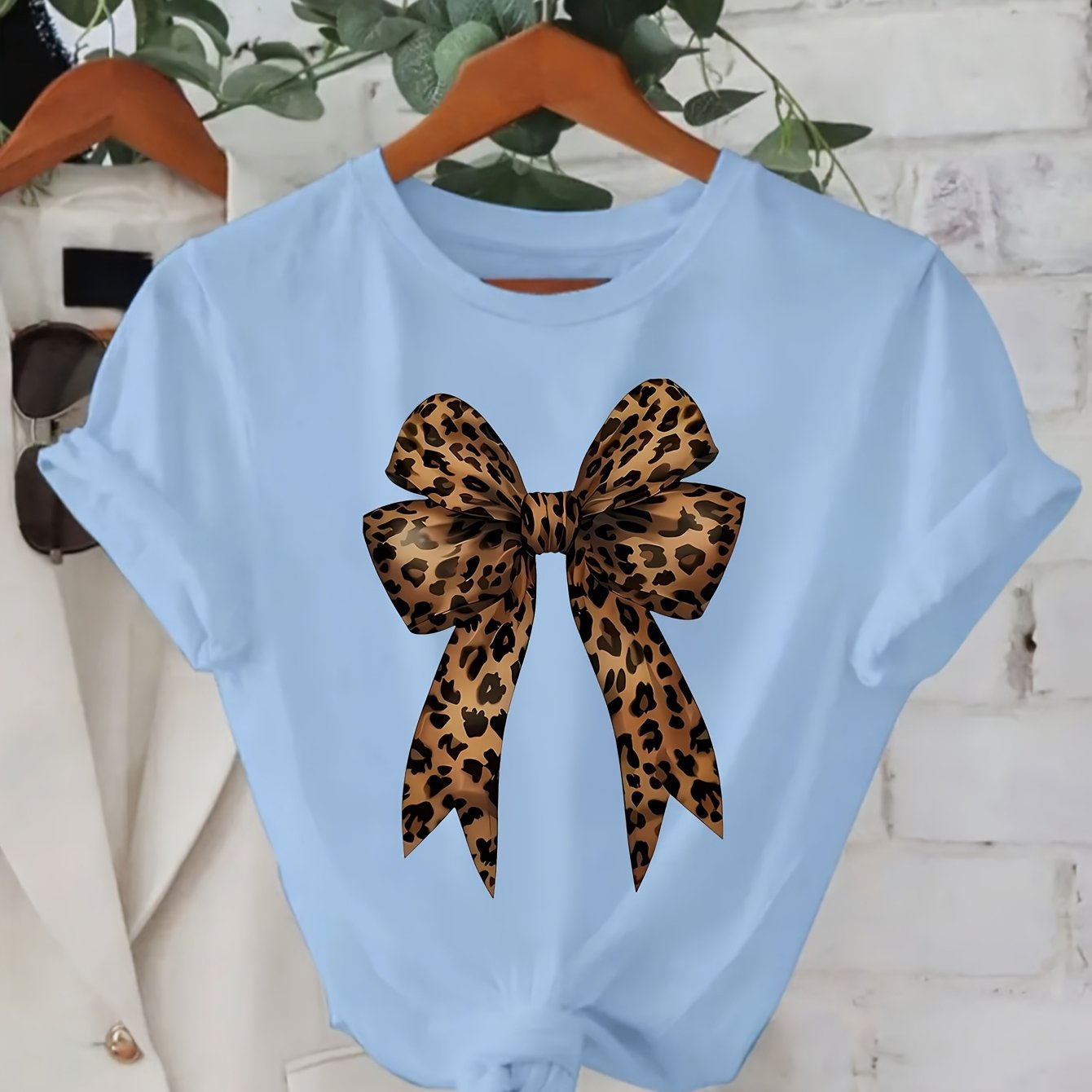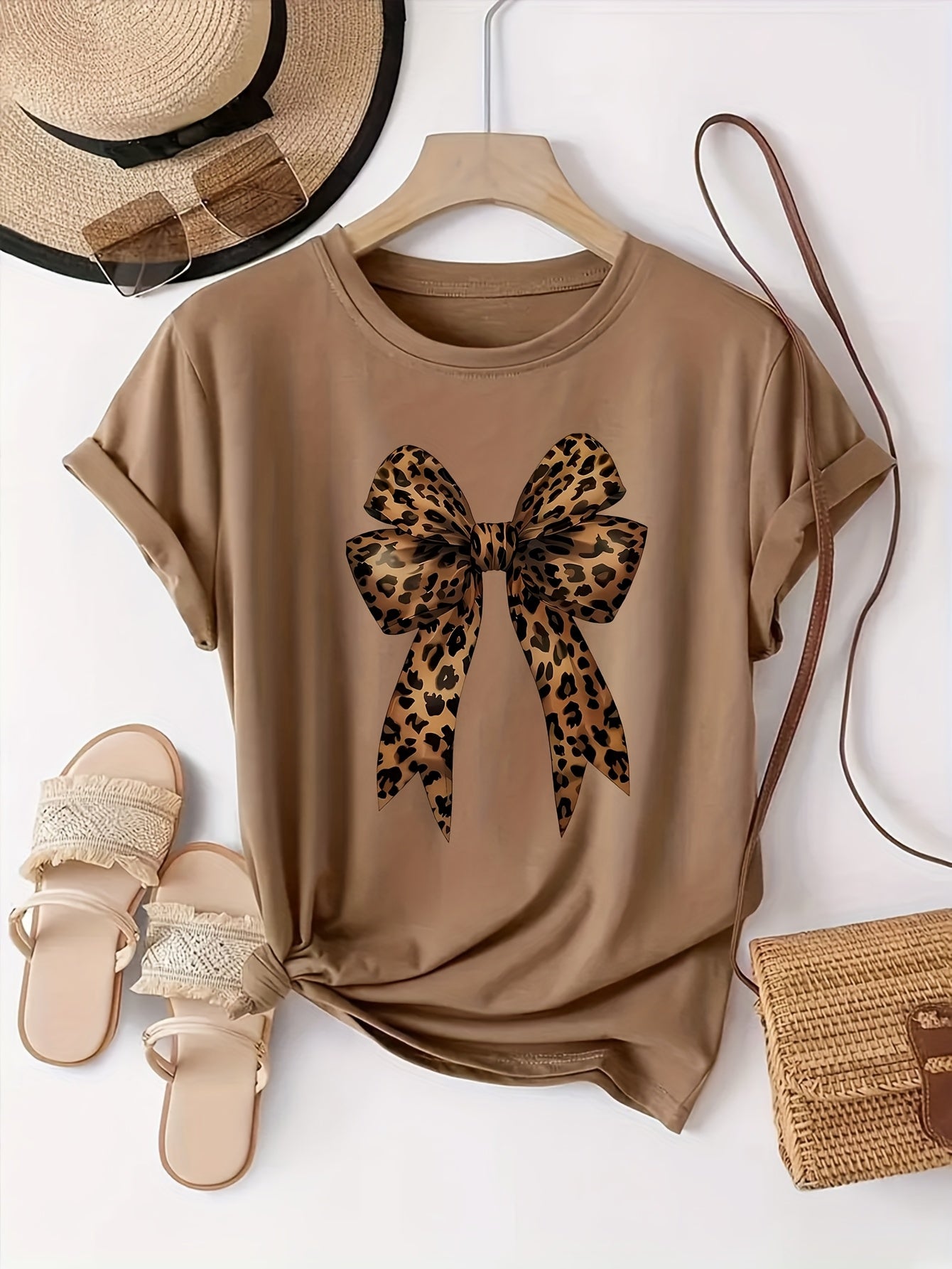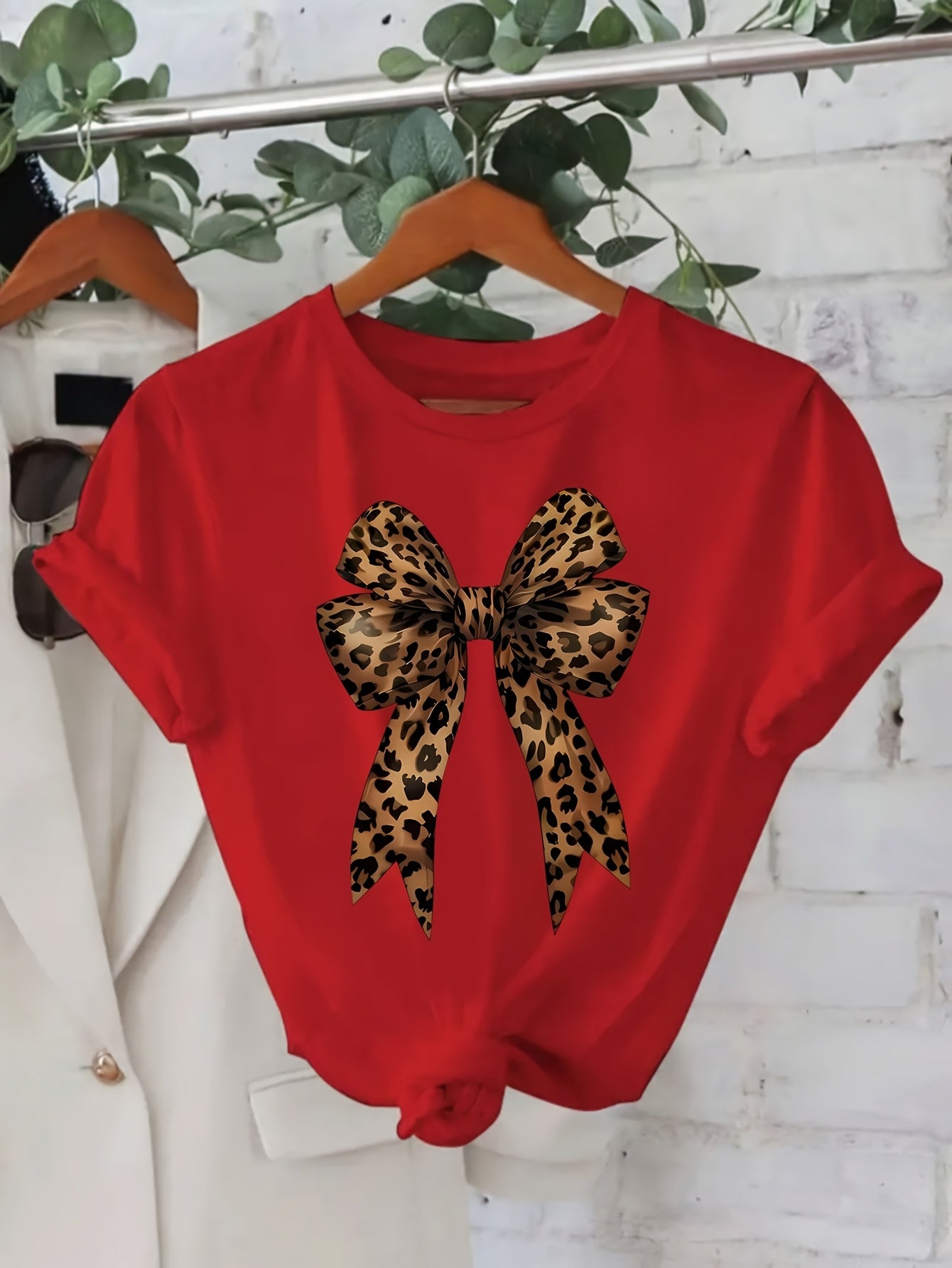 Women's Casual Leopard Print Bowknot T-Shirt - Short Sleeve, Round Neck, Soft & Comfortable Fabric, Perfect for Spring/Summer Fashion, Green Graphic Tee with Stylish Bow Design, Casual Wear | Playful Graphic Tee | Stylish Gra