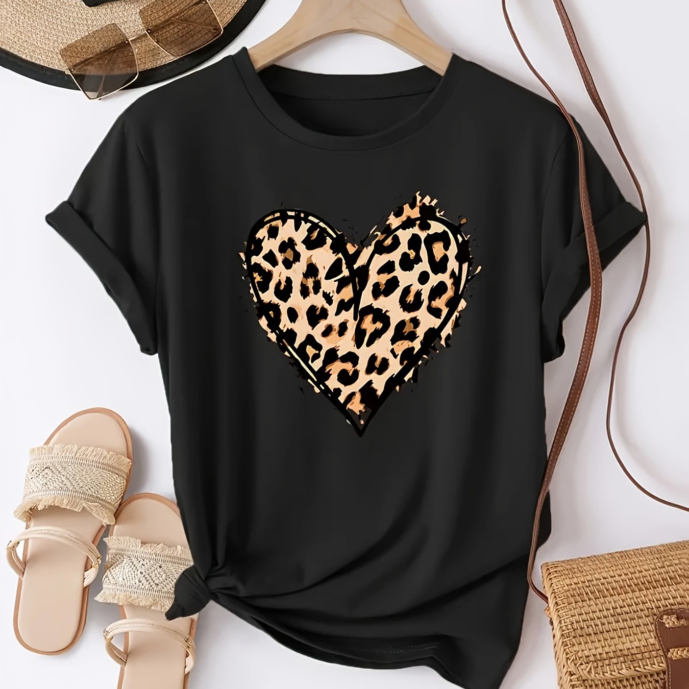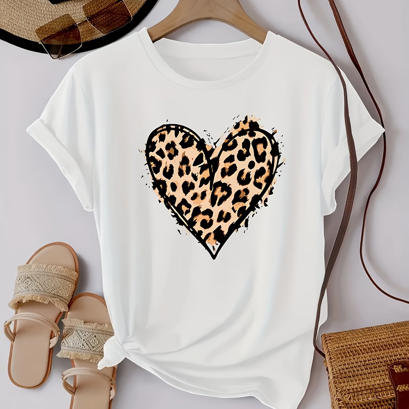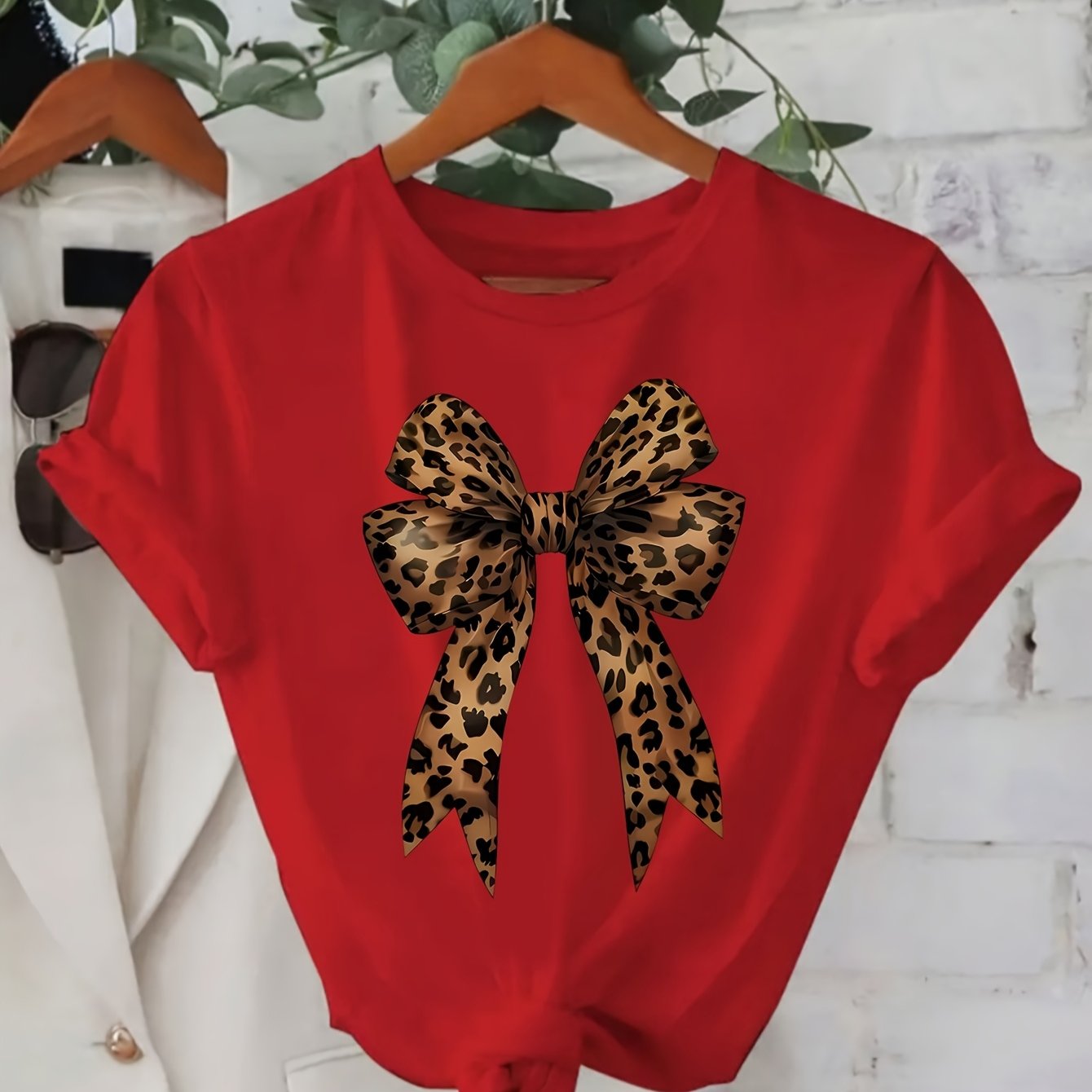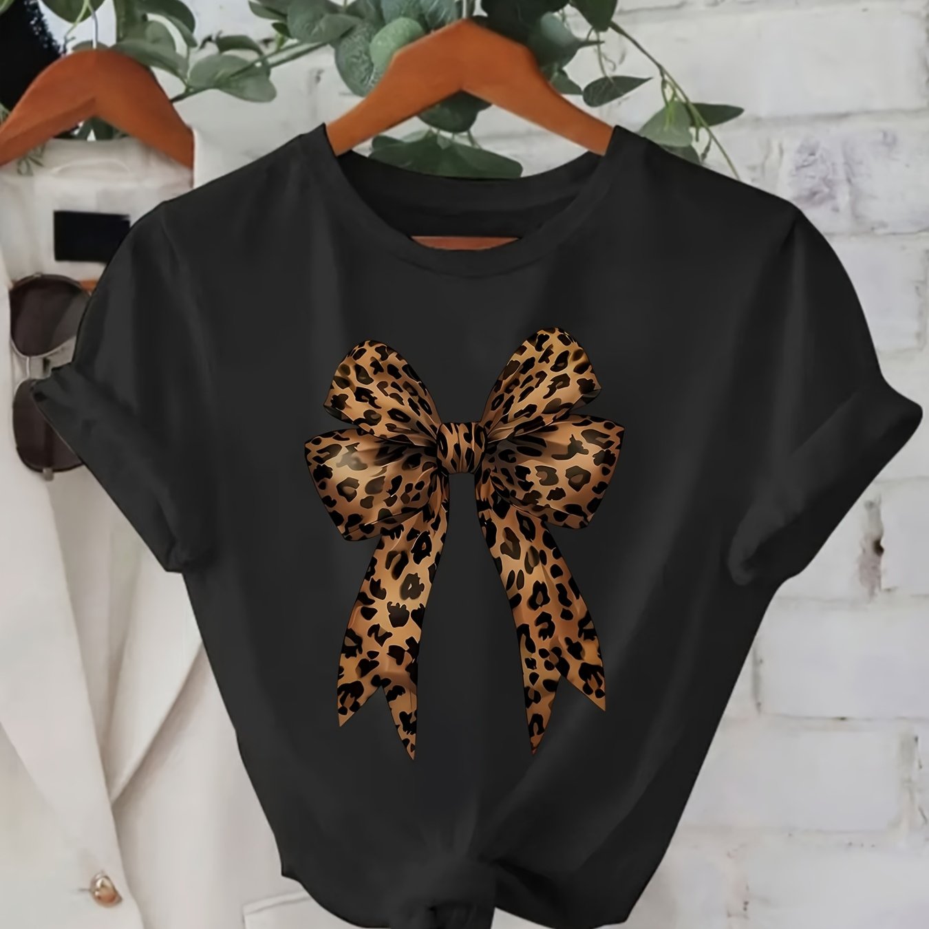 Women's Casual Leopard Print Bowknot T-Shirt - Short Sleeve, Round Neck, Soft & Comfortable Fabric, Perfect for Spring/Summer Fashion, Green Graphic Tee with Stylish Bow Design, Casual Wear | Playful Graphic Tee | Stylish Gra