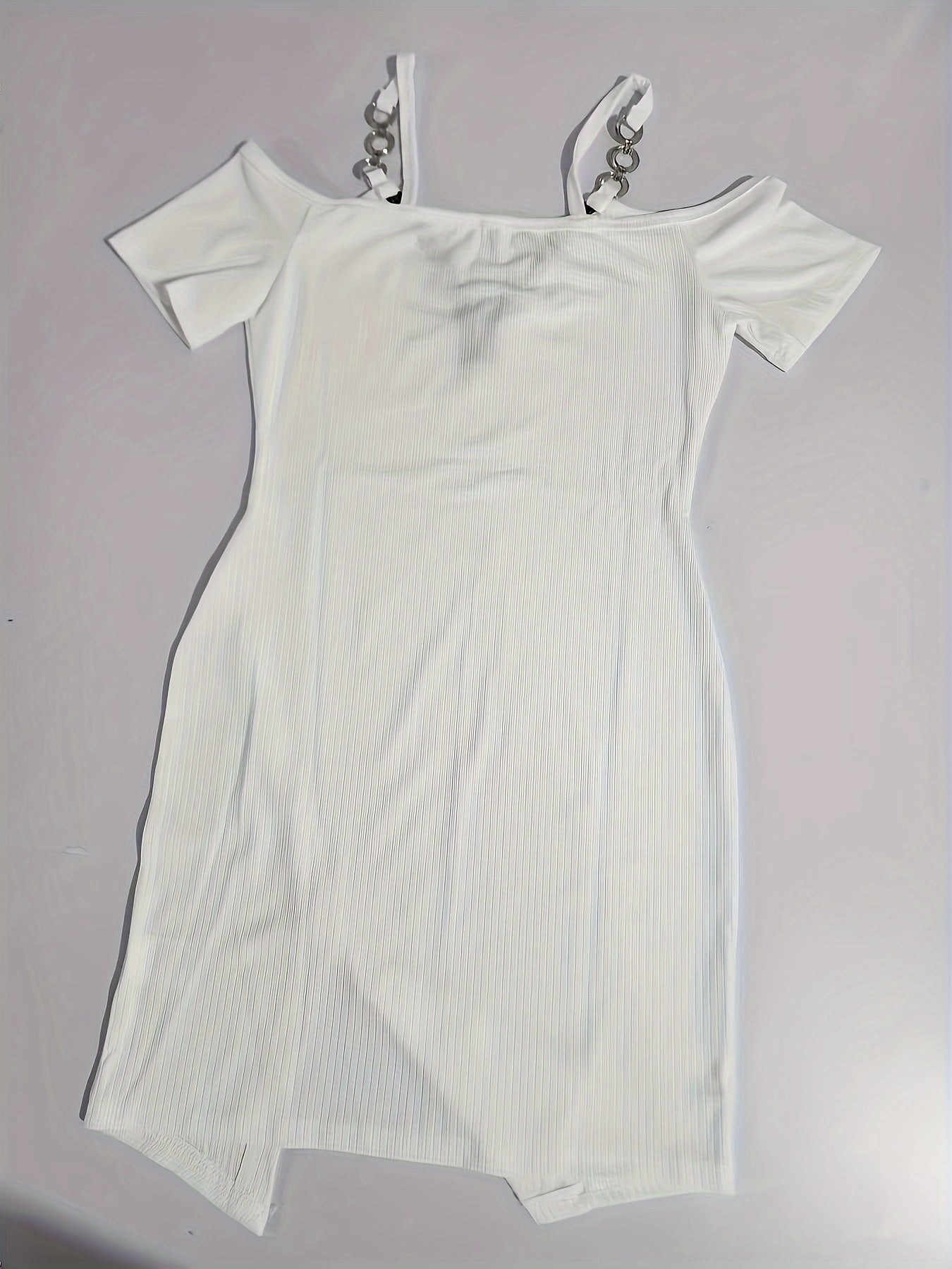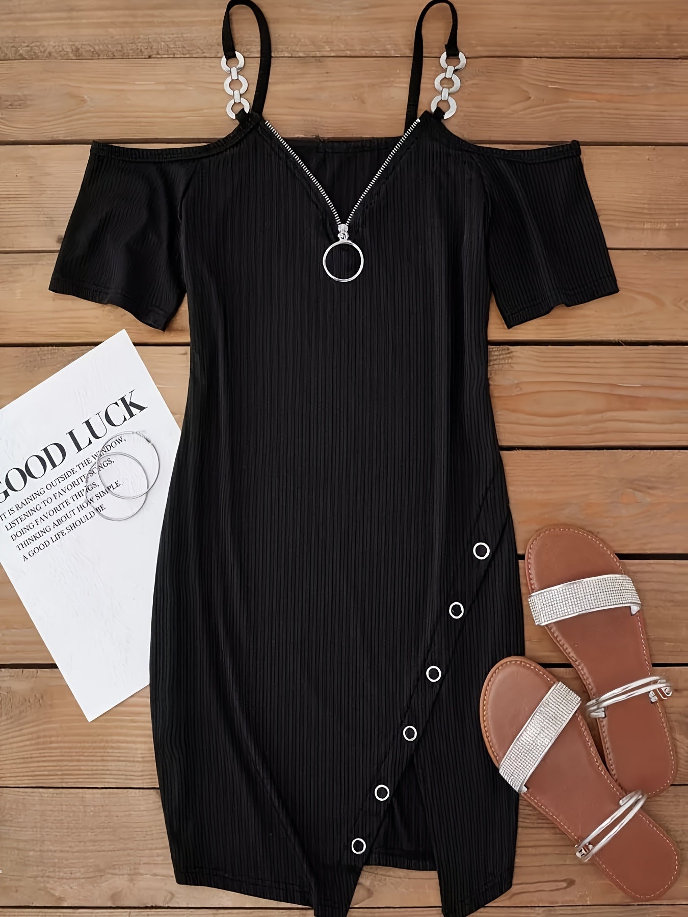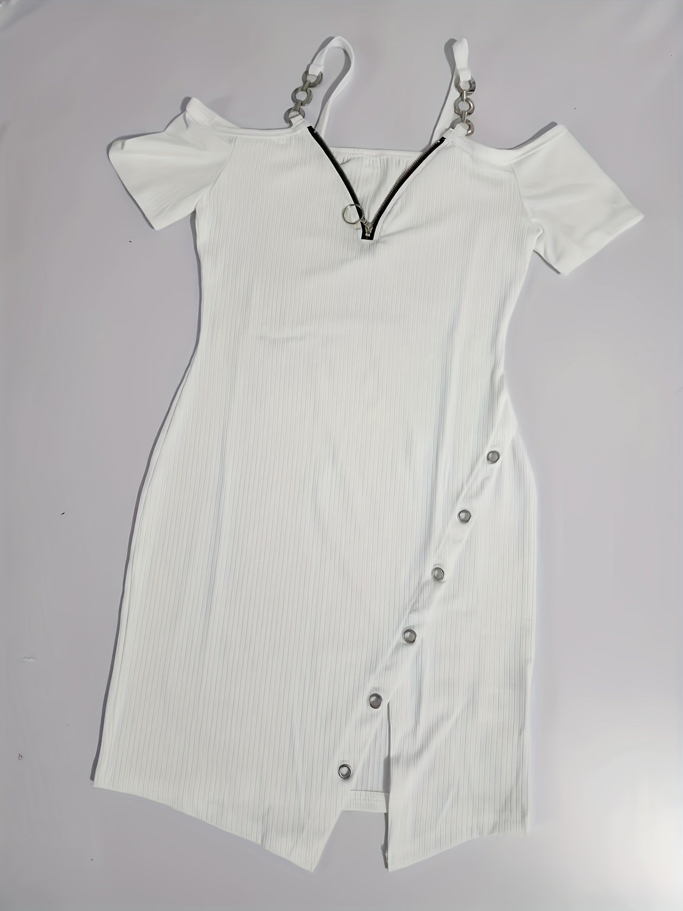 Women's Cold Shoulder Ribbed Chain Strap Dress - Zipper, Elegant, Short Sleeve, Split Bodycon Dress - For Spring & Summer - Perfect for Parties & Casual Occasions - Ideal Gift for Women