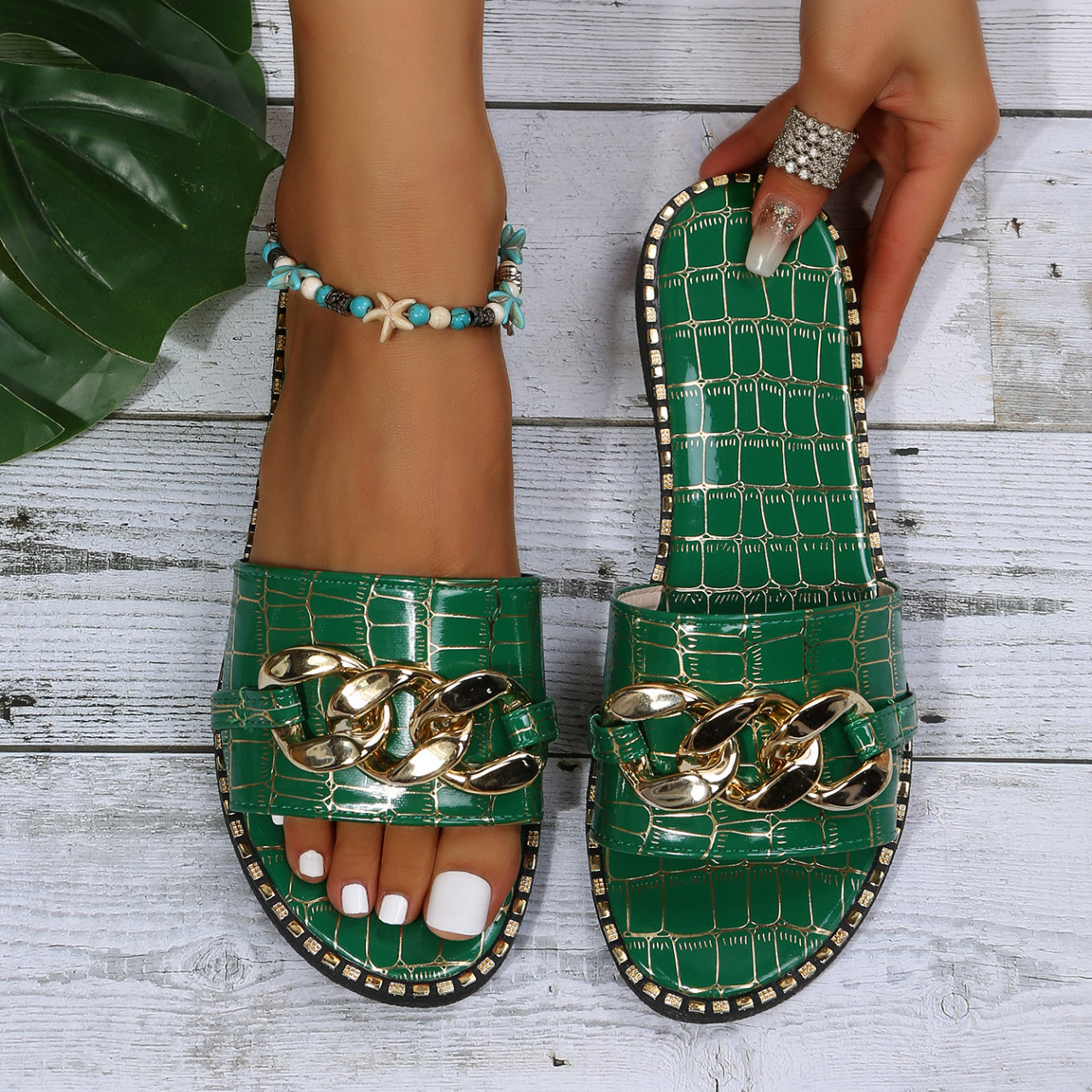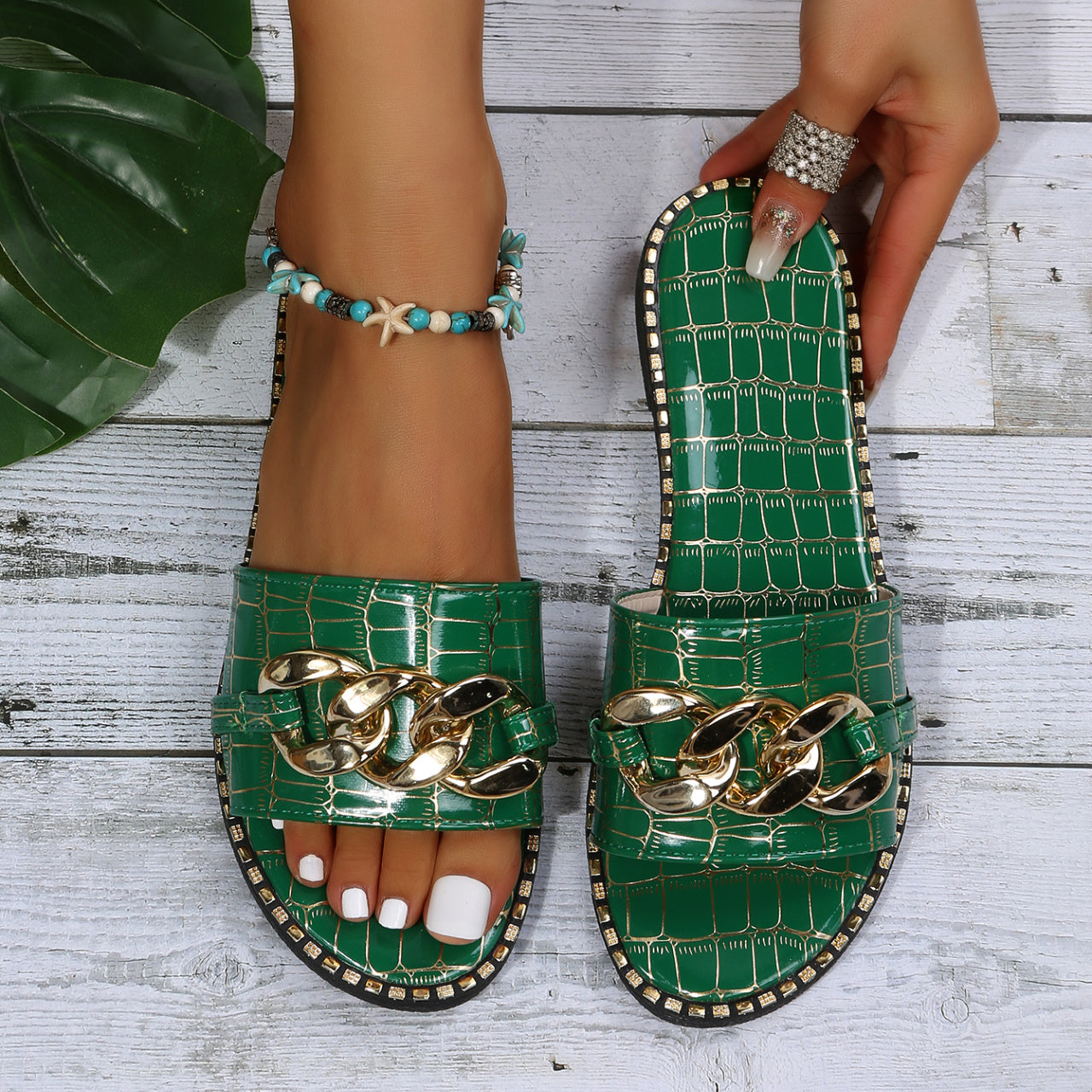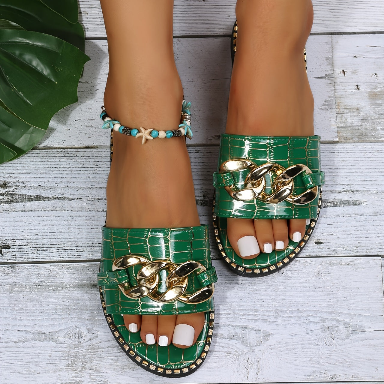 Women's Metal Chain Decor Flat Slippers, Fashion Open Toe Non Slip Slides Shoes, Casual Outdoor Slippers