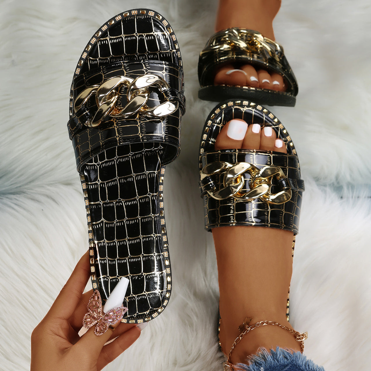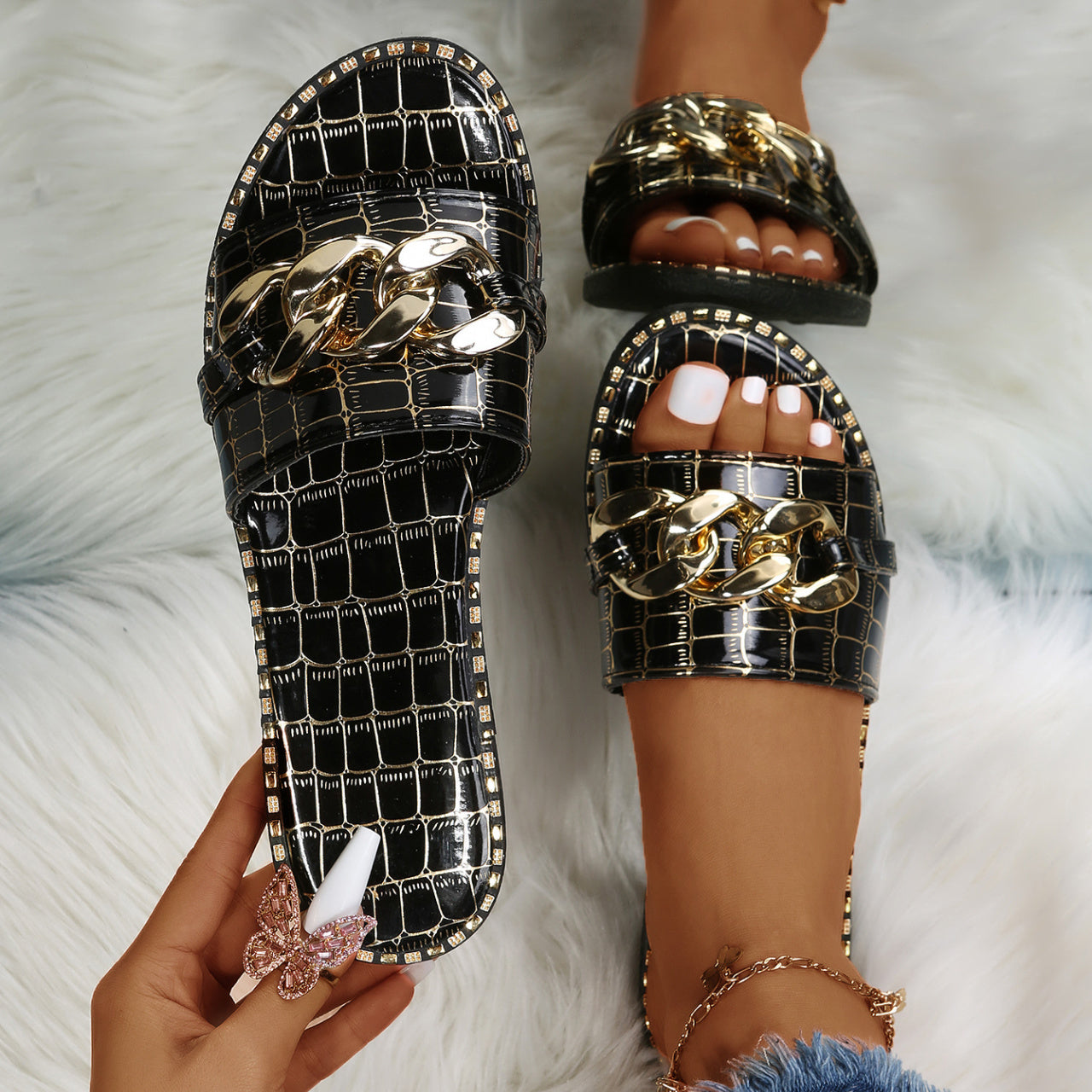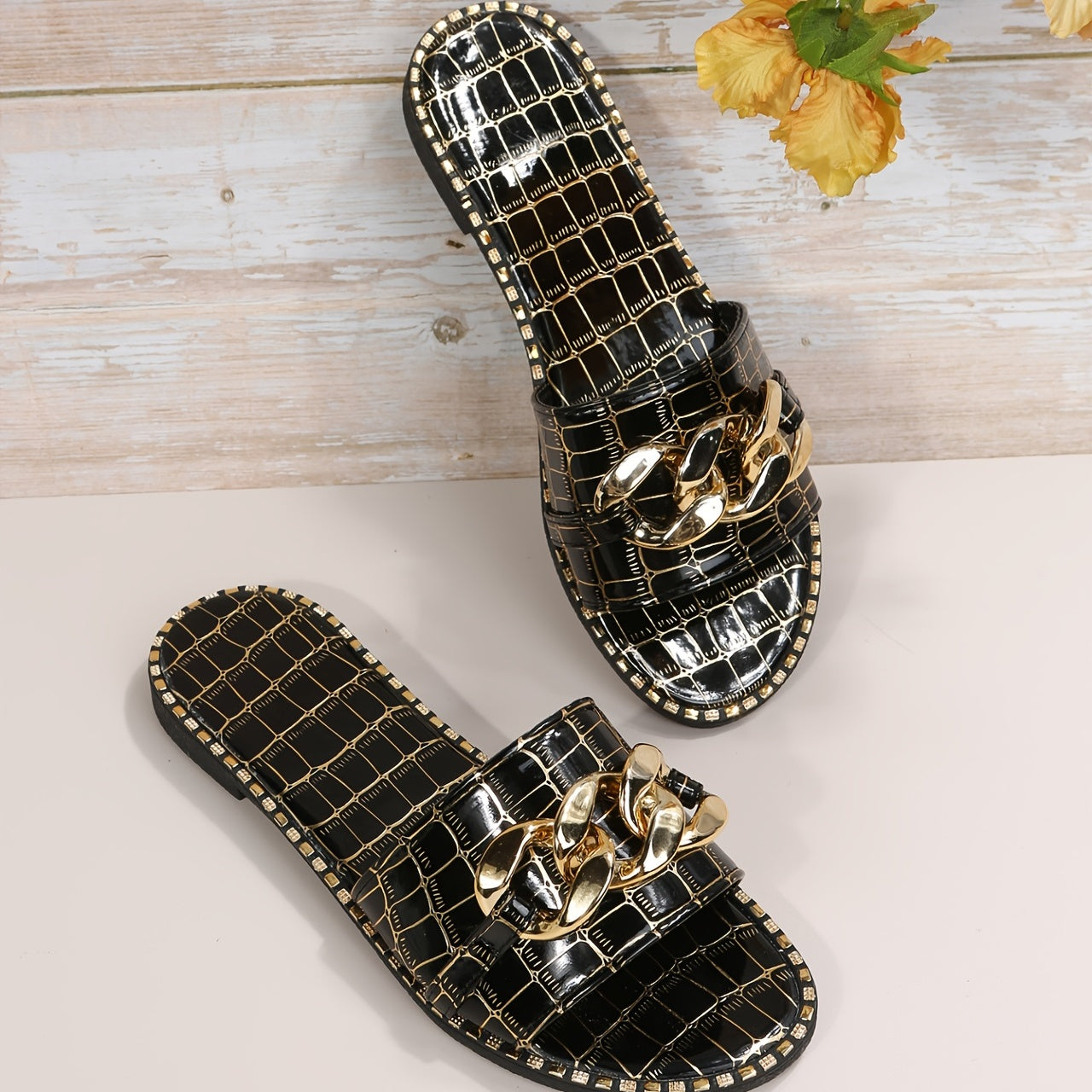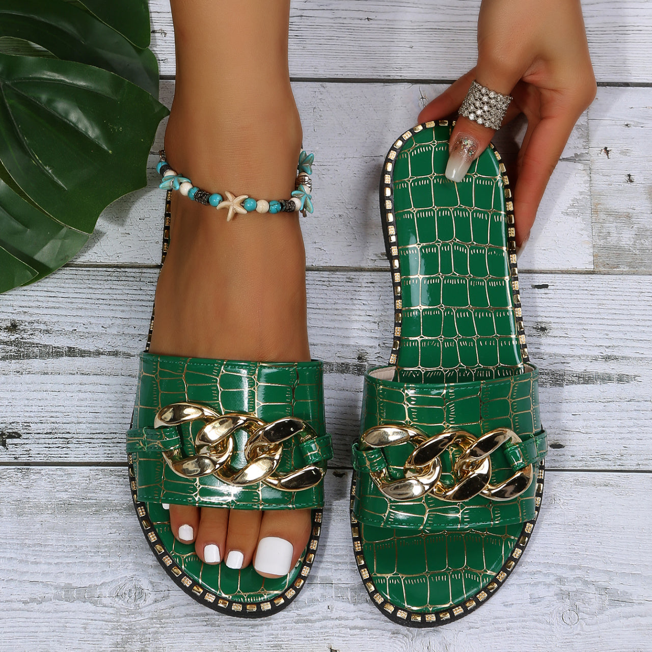 Women's Metal Chain Decor Flat Slippers, Fashion Open Toe Non Slip Slides Shoes, Casual Outdoor Slippers
