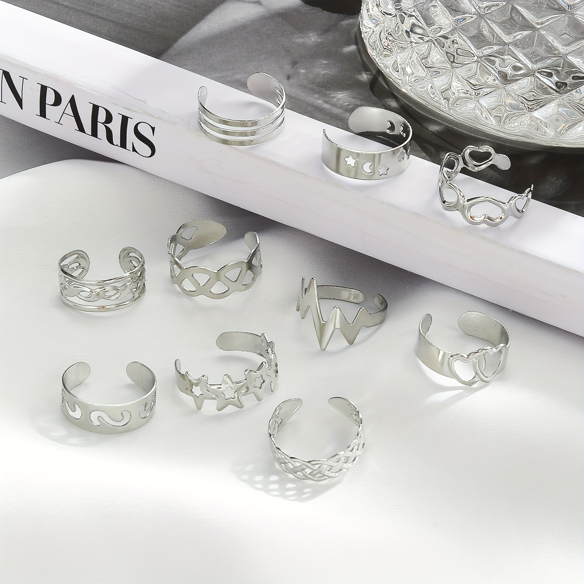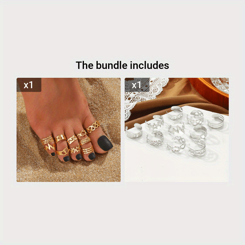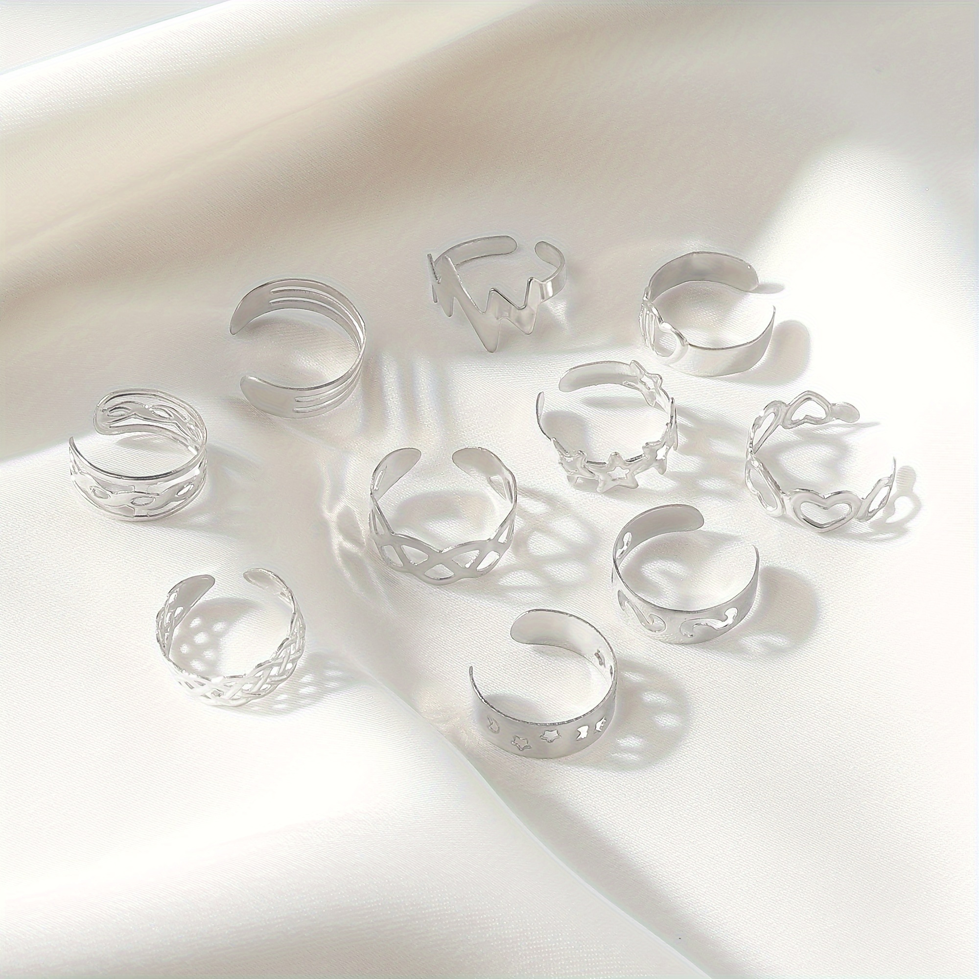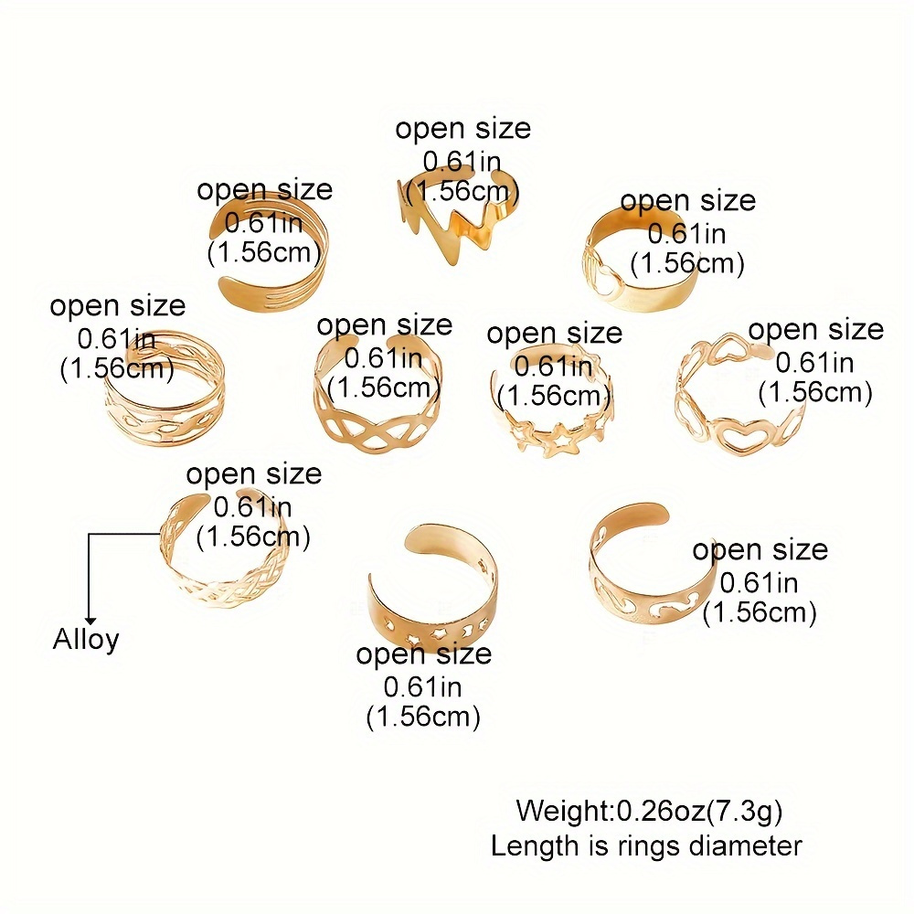 10pcs Set Unique Hollow Star Moon Heart Design Toe Ring Alloy Jewelry Bohemian Elegant Style Adjustable Ankle Ring Suit