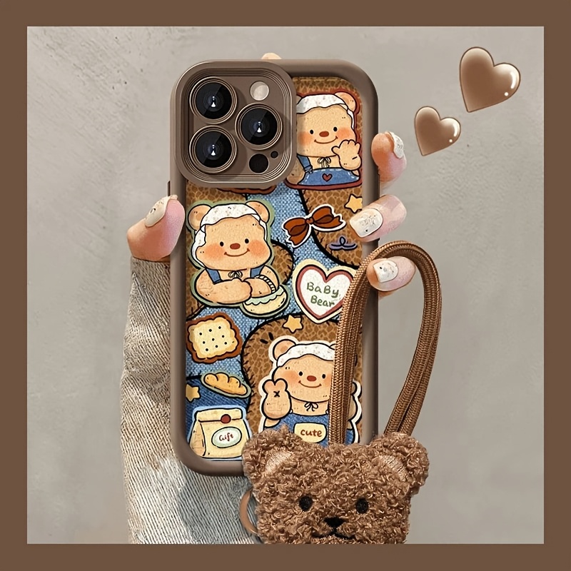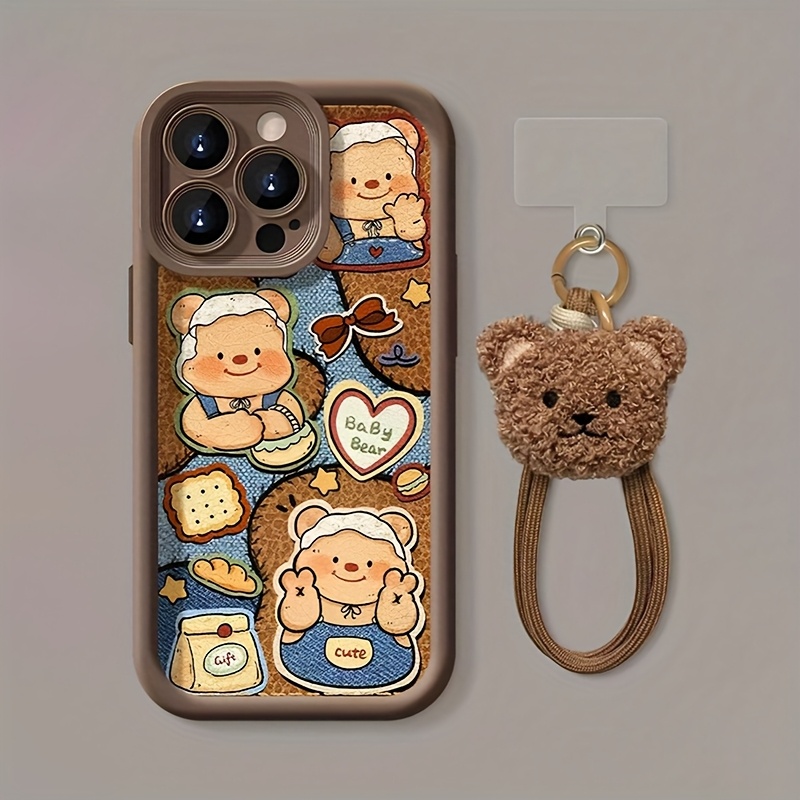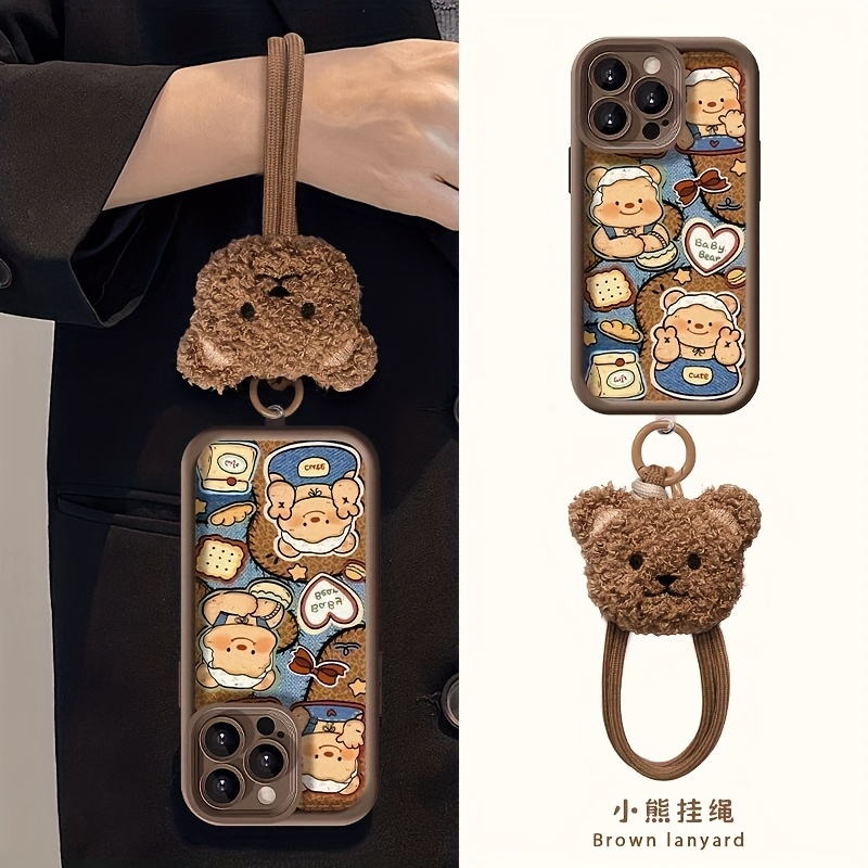 1pc Butter Bear Pattern Plush Lanyard Brown High Bamboo Mobile Phone Case, TPU Material Full Cover Anti-fall Lightweight Sandpaper Mobile Phone Protective Case, Suitable for iPhone 16/11/13/15/15 Plus/15 Pro/15 Pro Max/12/14