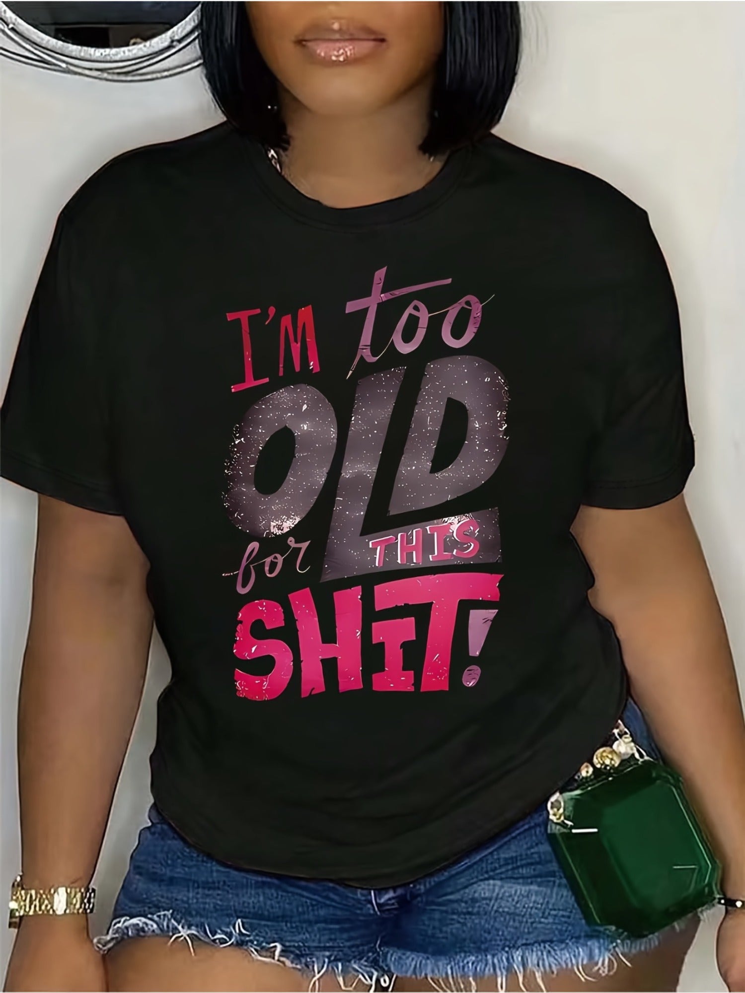 [Casual Style] Women's "I'm Too Old for This Shit" Graphic T-Shirt - Casual Crew Neck, Short Sleeve, Black with Pink and White Lettering - Machine Washable Blend, Easycare Top | Playful Design | Stretchable Fabric, Ladies T S