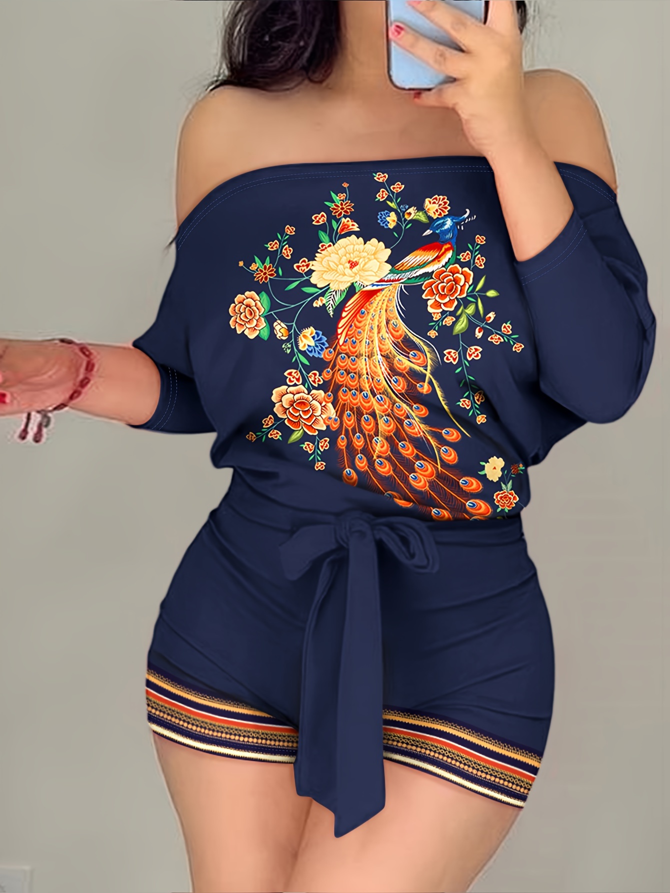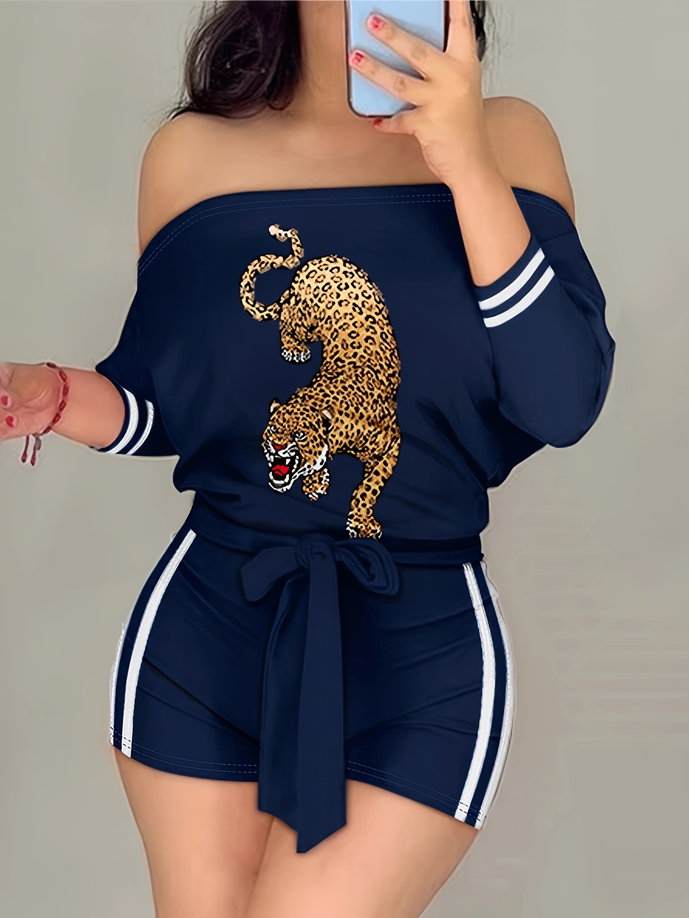 Chic Animal Print & Striped Off Shoulder Romper Jumpsuit - Flattering Tie Waist, Long Sleeve, Backless Style - Perfect Casual Wear for Women