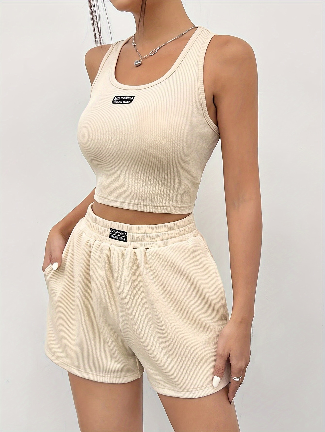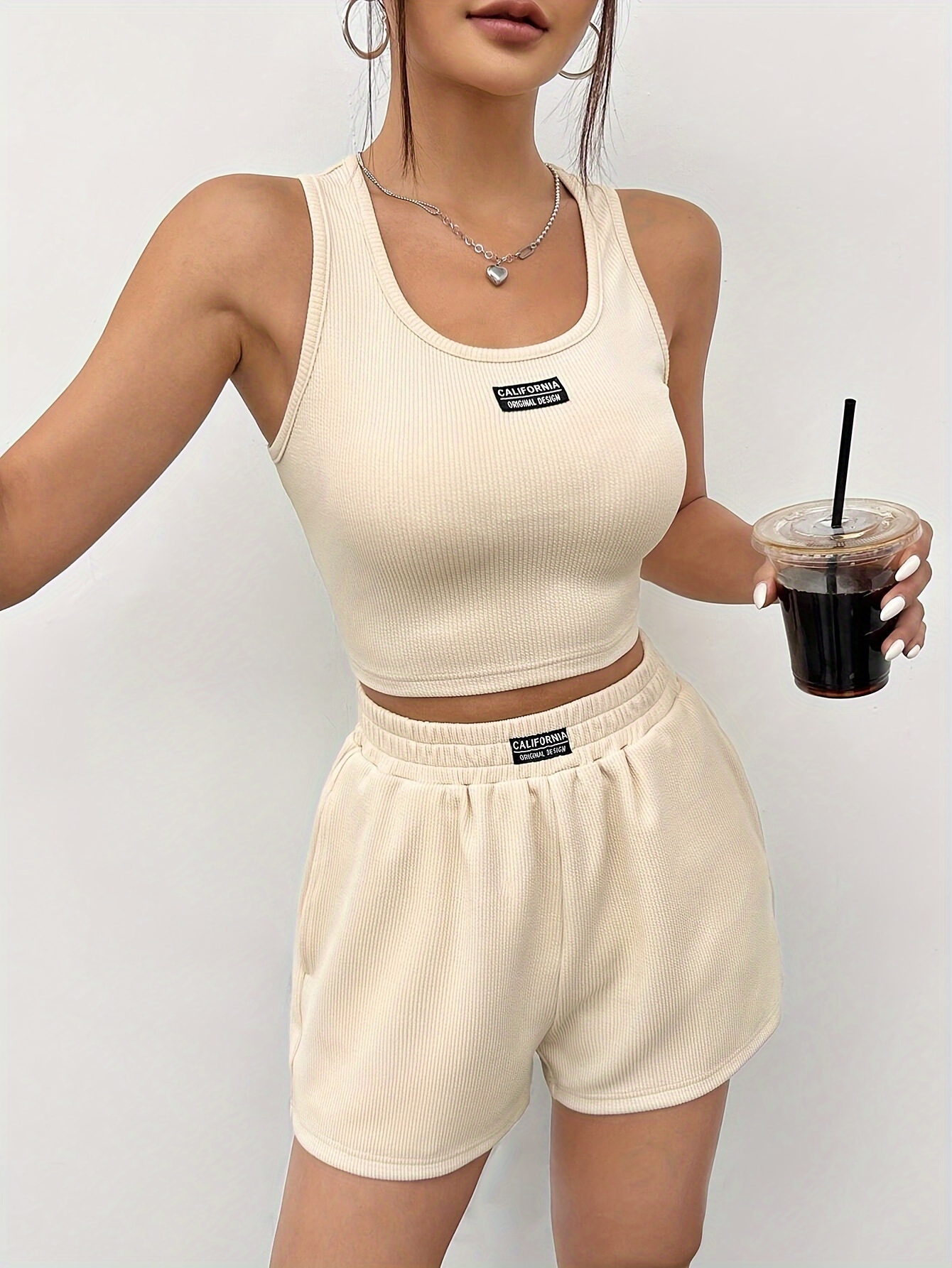 Patched Detail Casual Shorts Set, Square Neck Tank Top & Elastic Waist Shorts Outfits, Women's Clothing
