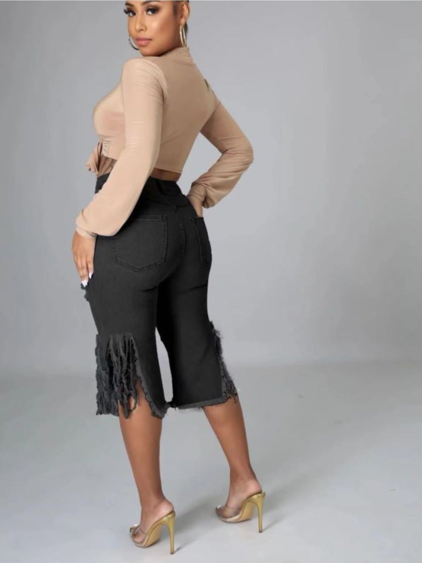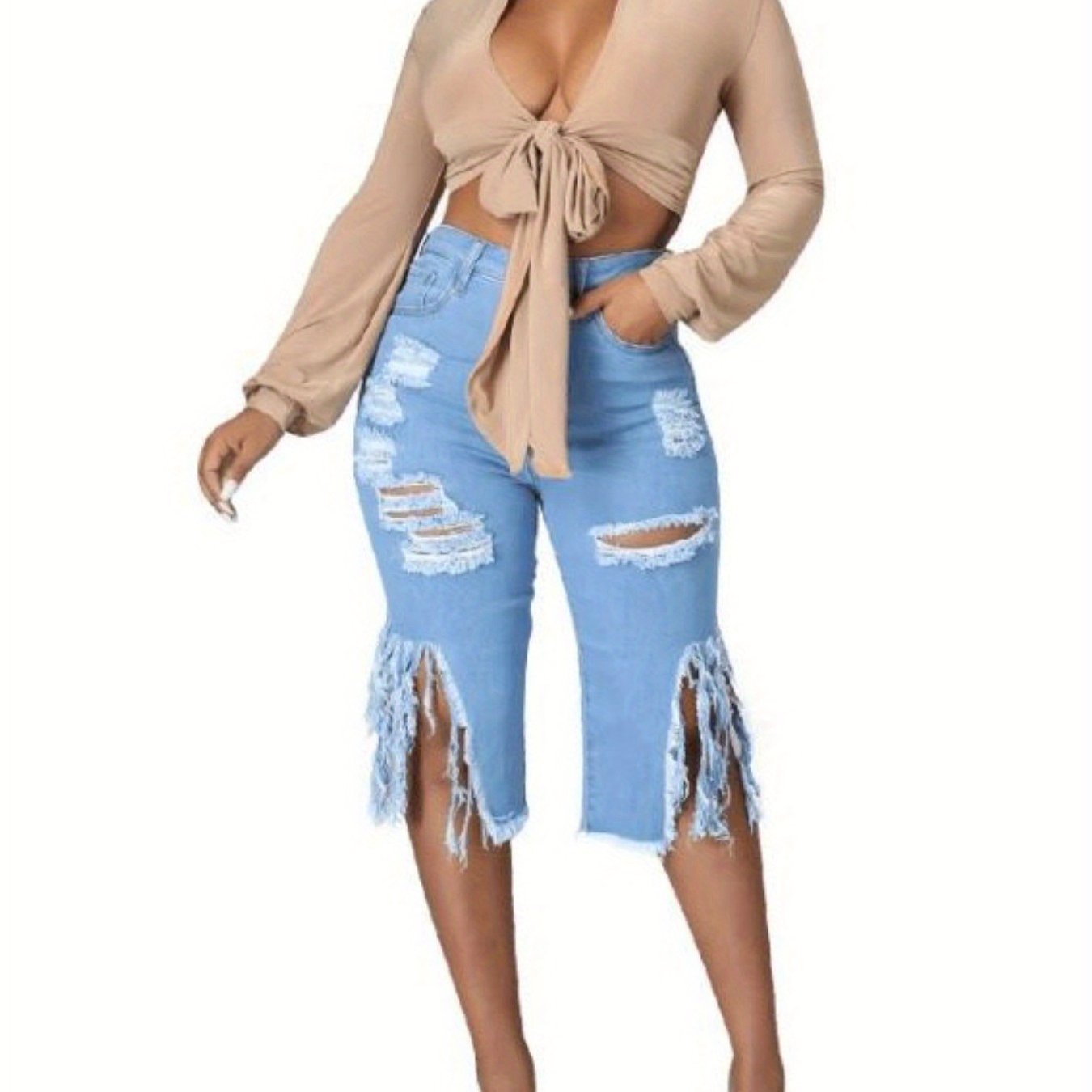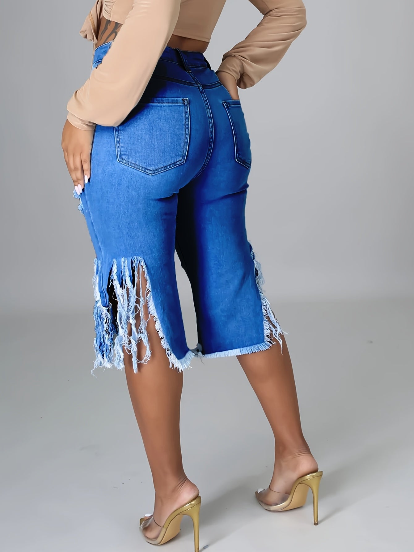 Trendy Distressed Denim Shorts with Fringe Hem for Women