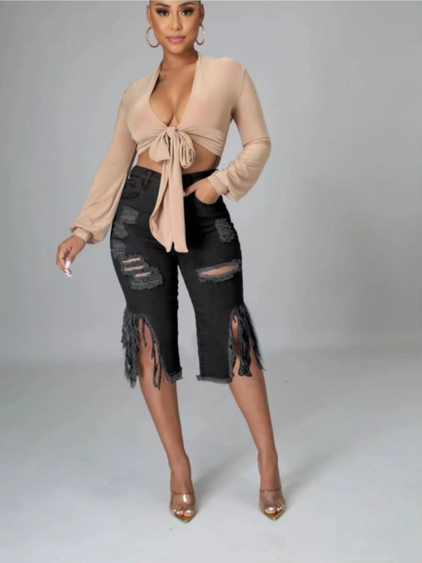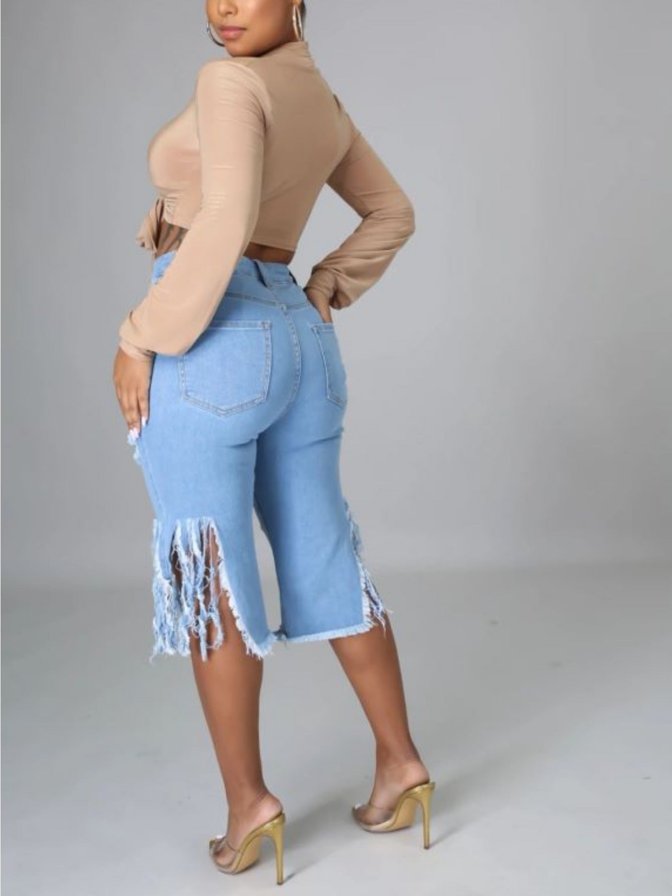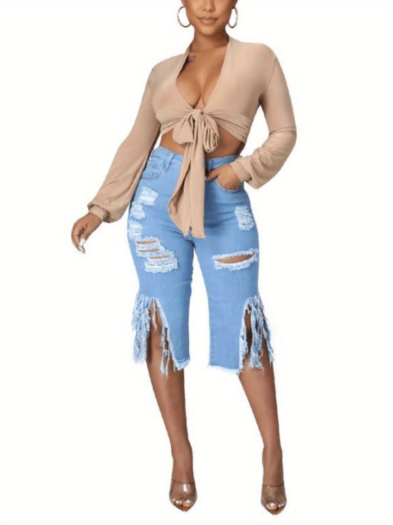 Trendy Distressed Denim Shorts with Fringe Hem for Women