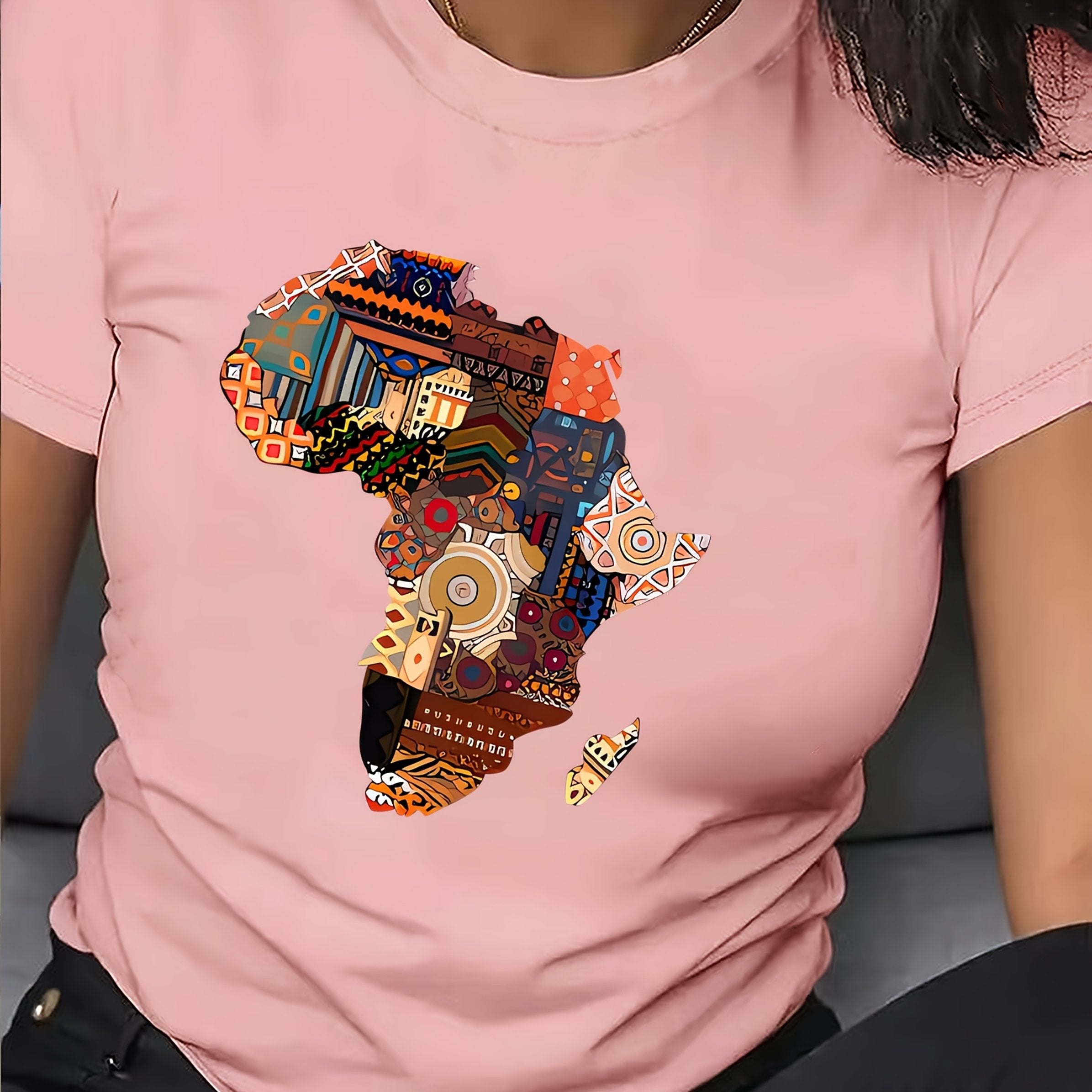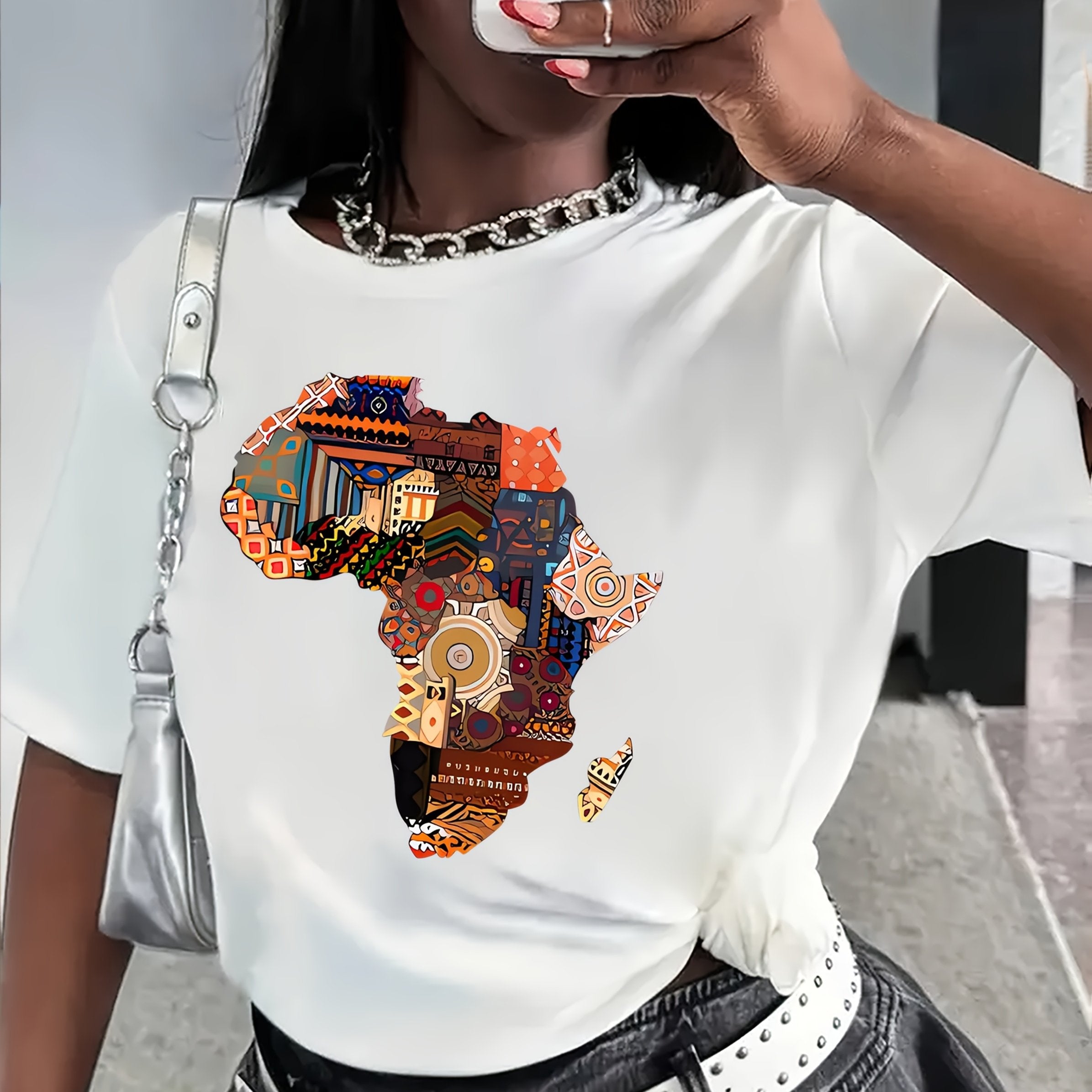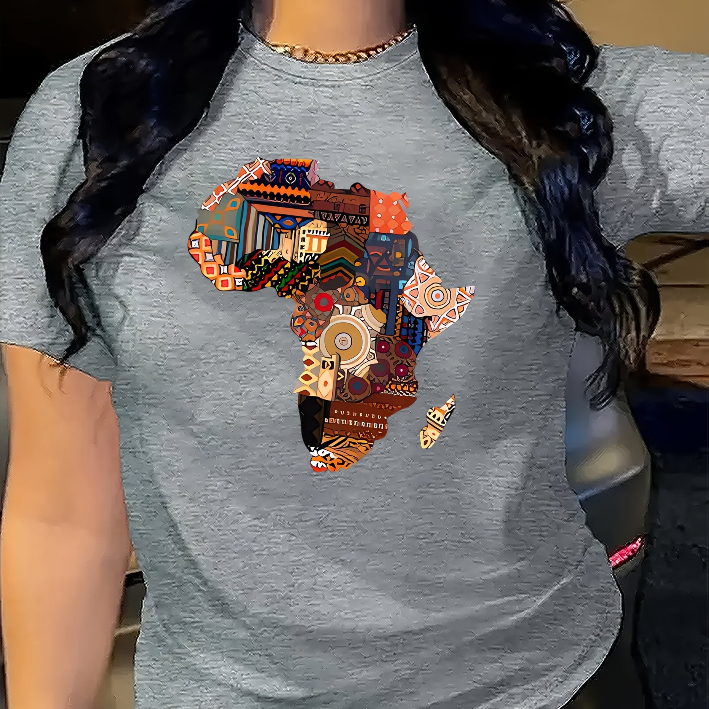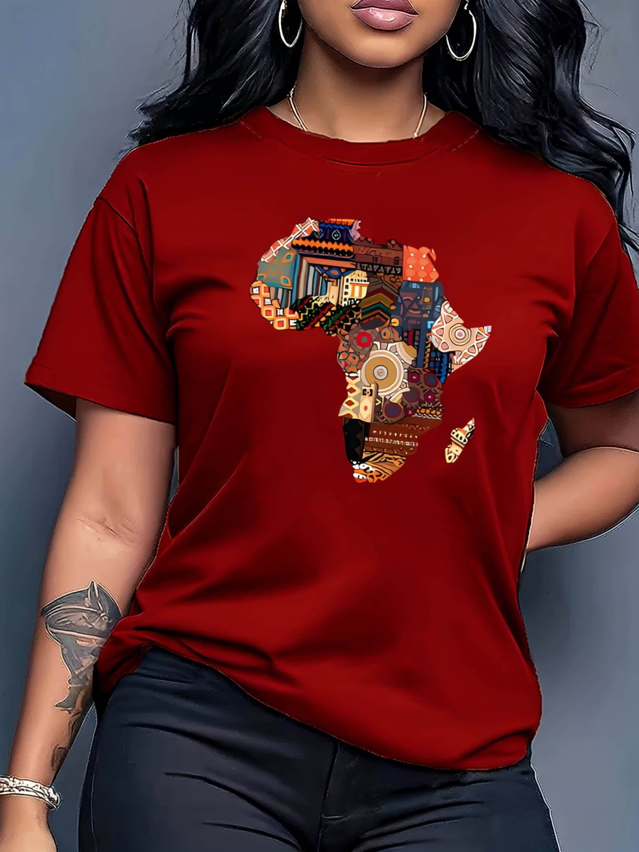Women's African-Inspired Patchwork Print Casual Short Sleeve T-Shirt - Vibrant Red Round Neck Top with Cultural Motifs, Medium Stretch & Machine Washable for Spring/Summer, Casual Attire, Comfortable Fabric