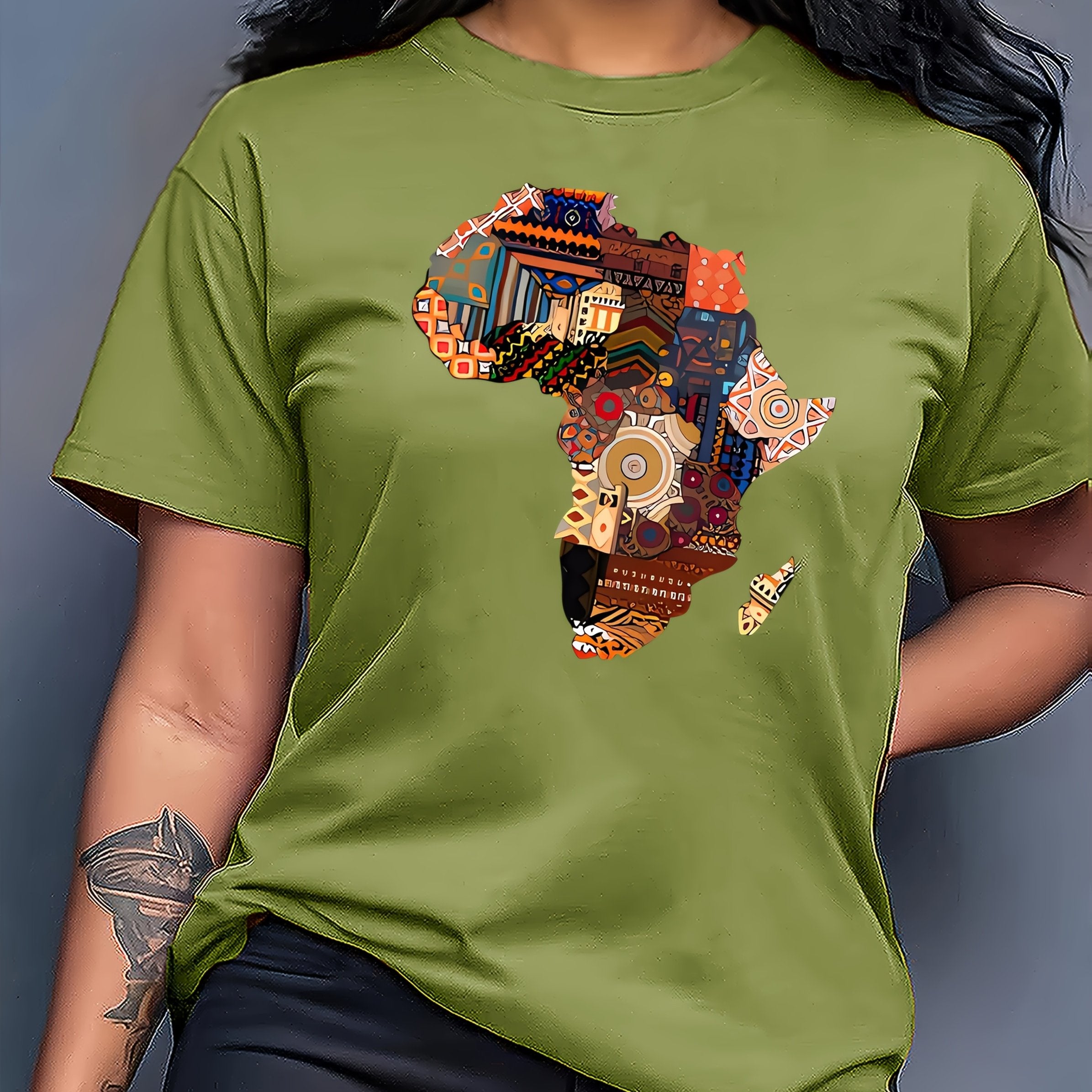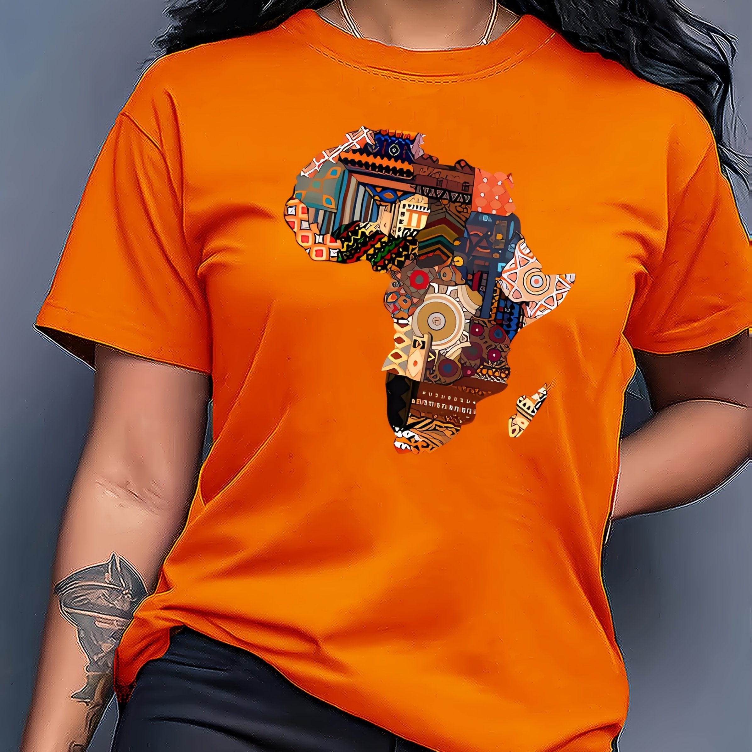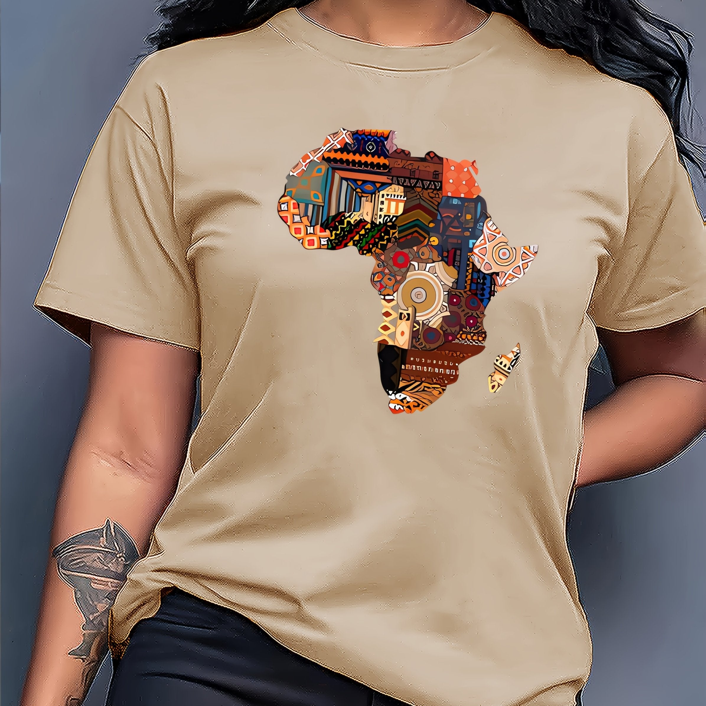 Women's African-Inspired Patchwork Print Casual Short Sleeve T-Shirt - Vibrant Red Round Neck Top with Cultural Motifs, Medium Stretch & Machine Washable for Spring/Summer, Casual Attire, Comfortable Fabric